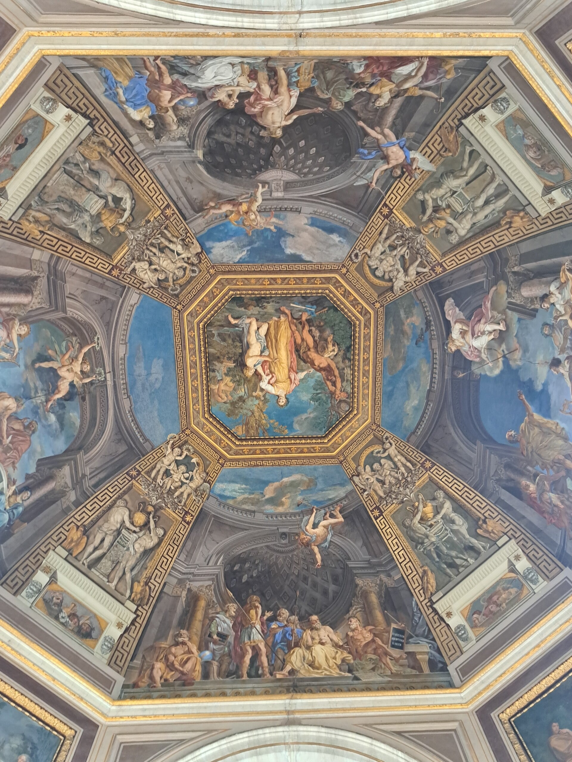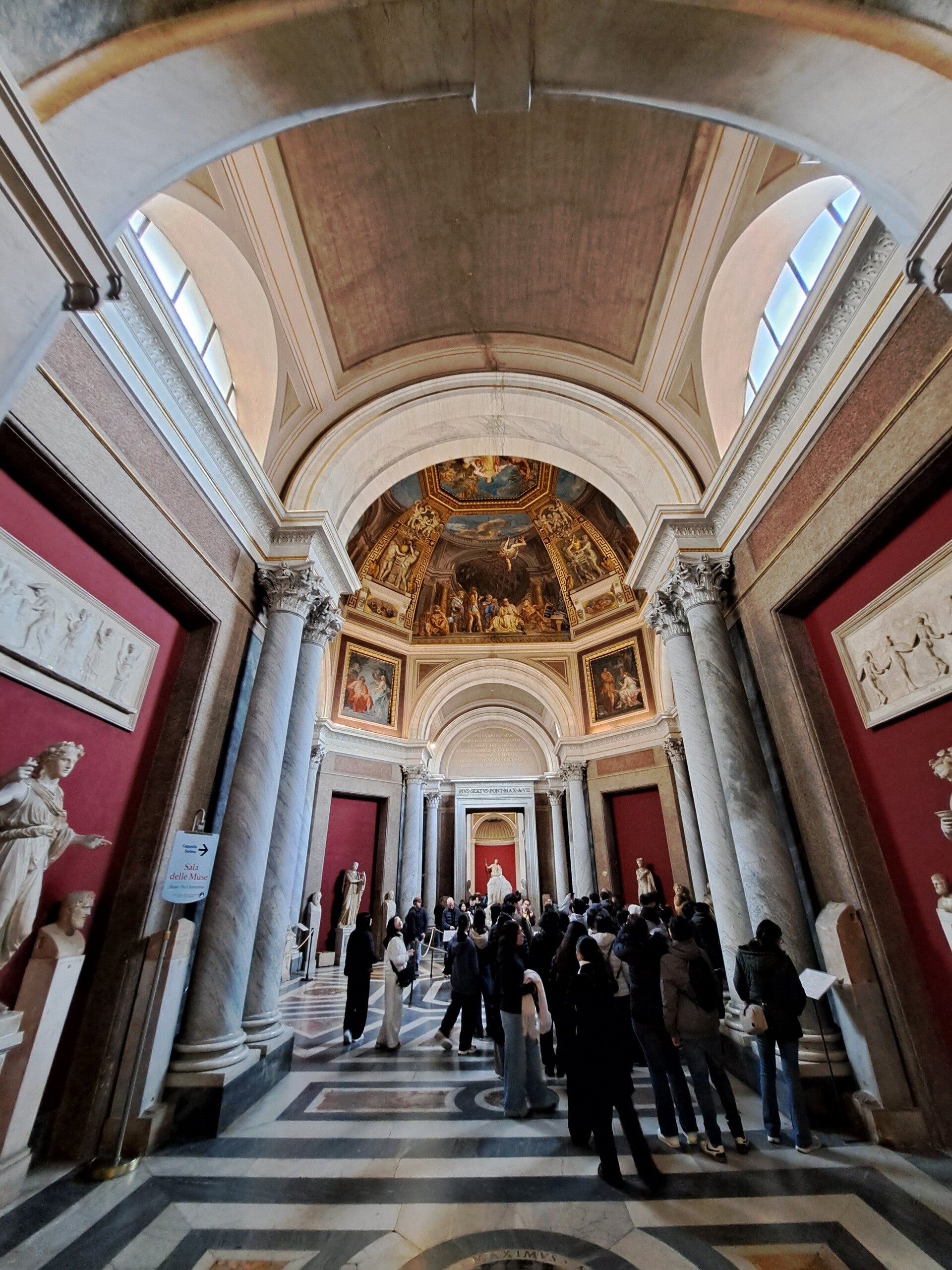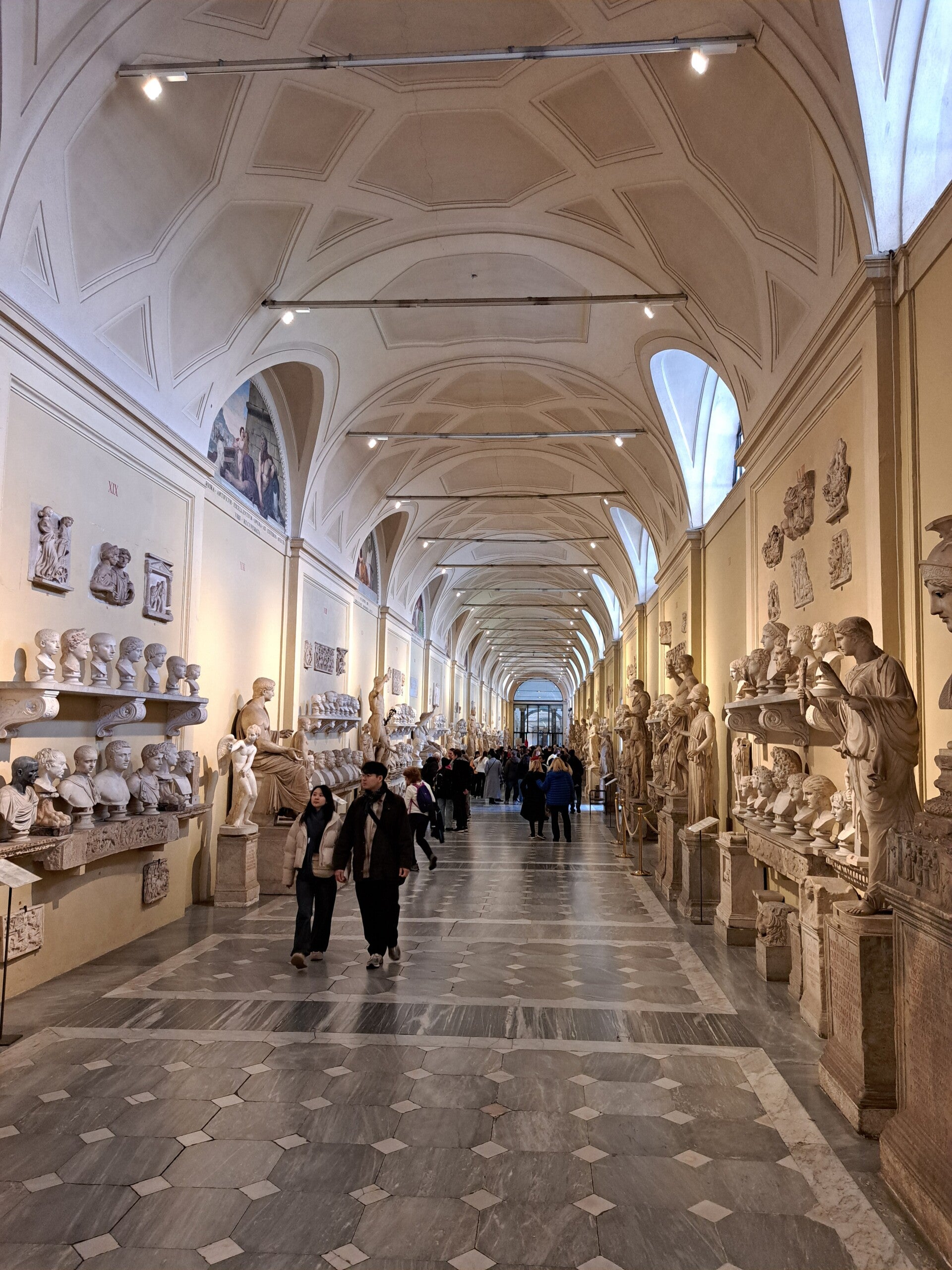 Vandaag tijd om nog even een ander land te bezoeken. Het kleinste land ter wereld, gelegen midden in Rome. Uiteraard gaat het dan om Vaticaanstad, de residentie van de paus en zijn gevolg. Ook voor het Vaticaans museum hadden we op voorhand al tickets geregeld, gelukkig hier geen noodzaak tot omwisselen ergens in de buurt van Vaticaanstad. In de ochtend op tijd richting metro, een directe lijn die uitkwam vlak bij Vaticaanstad. Uit de metro eerst nog maar op zoek naar een ontbijtje, we hadden ruim de tijd. Daarna op zoek naar de ingang van het museum, dat bleek een beetje aan de achterkant van Vaticaanstrad te zijn. Redelijk lange rijen waar we gewoon voorbij konden lopen, we hadden onze tickets tenslotte al. Echt binnen vijf minuten stonden we in het museum, dat was fijn. Bij de ingang kun je eerst nog even naar buiten, waar je kan uitkijken over de tuinen van het Vaticaan. Binnen een gigantisch museum, waarbij je een vaste route hebt vanwaar je ook een aantal zijroutes kan pakken. Deze komen steeds weer terug uit op de hoofdroute. Soms komt de route weer uit op een binnenplaats of binnentuin, maar over het algemeen zijn het lange gangen vol met beelden, schilderijen en wandtapijten. Een liefhebber kan zich hier makkelijk de hele dag vermaken, iemand als ik krijgt het vanzelf benauwd van de drukte en wil redelijk rap weer door. Pas bijna aan het einde van de hele hoofdroute, die steeds smaller en daarmee drukker wordt, kom je uit bij de ruimte die je echt gezien moet hebben: de Sixtijnse kapel. De wereldberoemde plafondschilderingen zijn een lust voor het oog, helaas heel veel bewaking om te voorkomen dat je er ook maar een vluchtig kiekje van maakt.