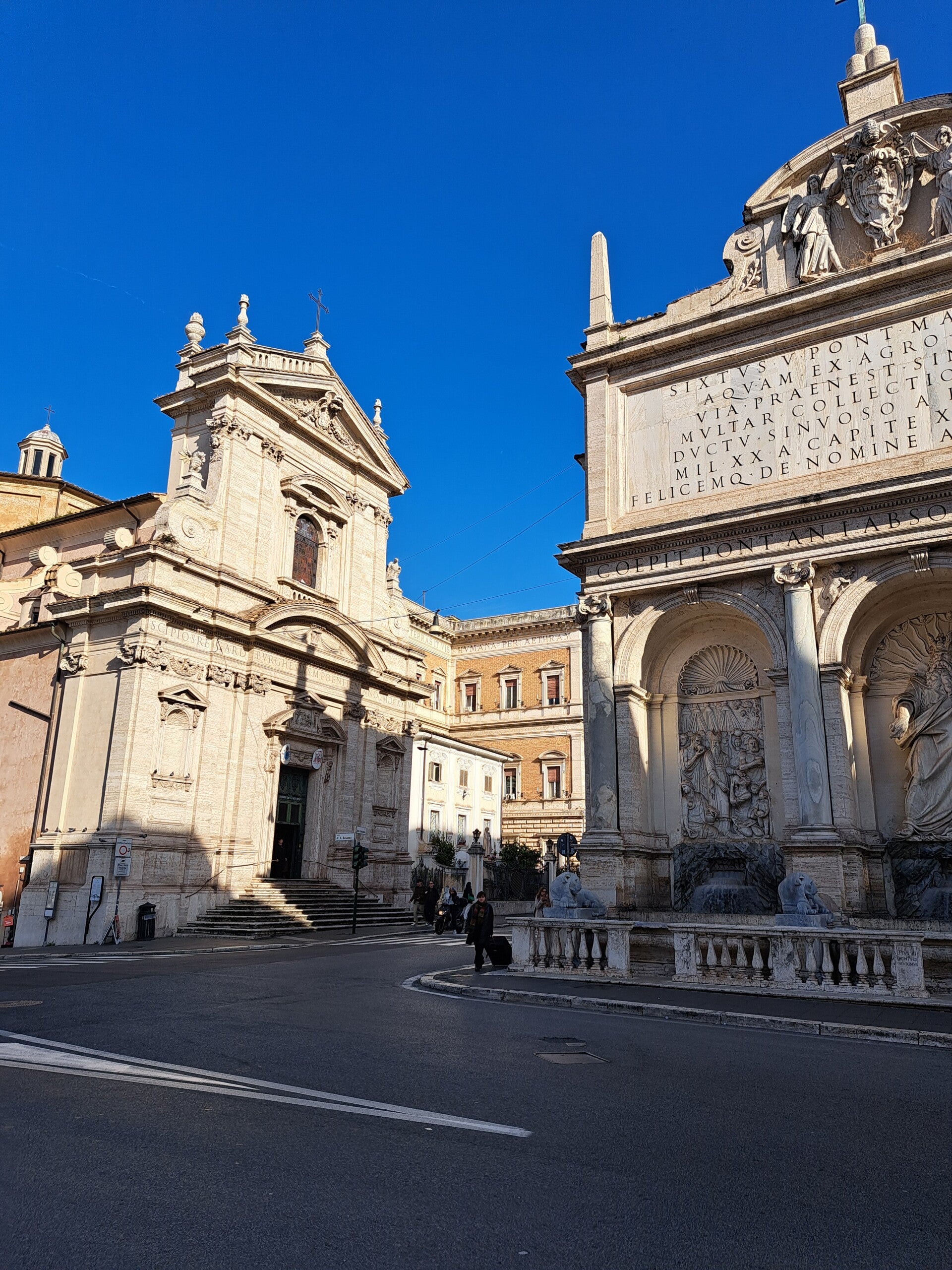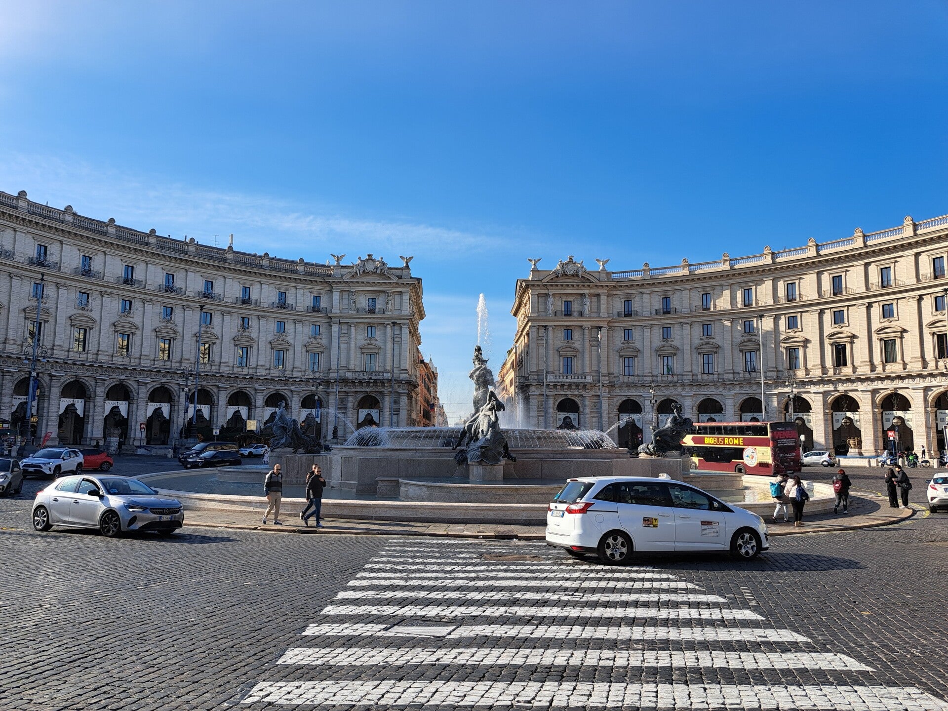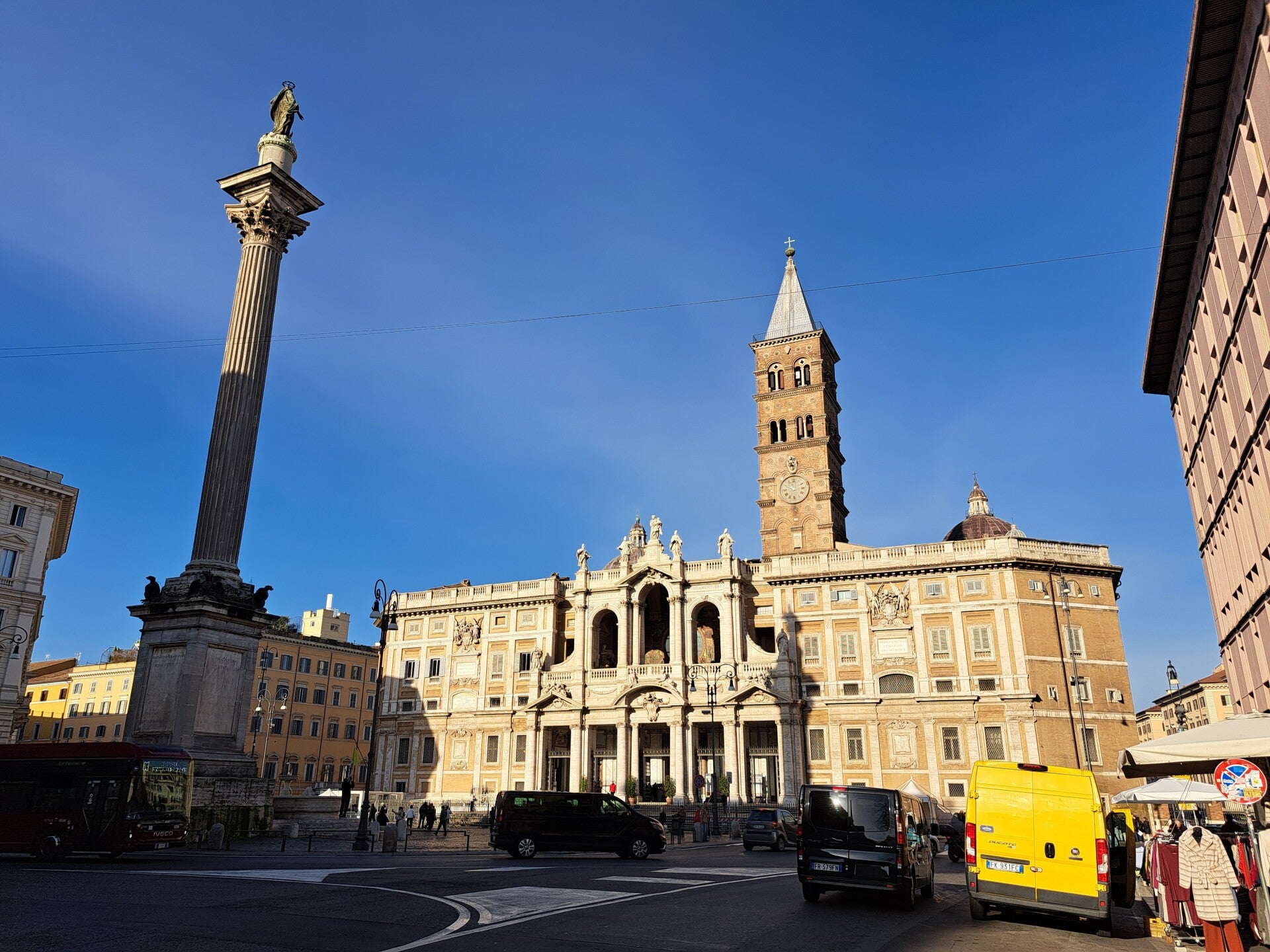 Op de eerste twee volle dagen in Rome hadden we eigenlijk nagenoeg alle grote bezienswaardigheden al gezien: Colosseum, Forum Romanum, Trevifontein, Pantheon, Engelenburcht en uiteraard het Vaticaan. Is dat alles in Rome? Uiteraard niet, met iets van 900 kerken en veel pleinen, fonteinen, standbeelden en noem maar op zou je wel weken kunnen vullen. Vandaag zo'n dag om vooral de minder bekende plekken te bezoeken, al begonnen we toch met nog wel een heel bekende basiliek: de Basilica Papale di Santa Maria Maggiore. Deze basiliek is een van de zeven pelgrimskerken van Rome, en is de enige van de vier pauselijke basilieken in Rome waarvan het antieke bouwwerk intact bewaard is gebleven. Zoals al bij het verslag van gisteren aangegeven, hadden wij buslijn 71 nu ontdekt. Deze lijn kwam ook nog eens langs deze basiliek, dus vanaf het appartement stonden we binnen de kortste keren voor de deur. Een indrukwekkend grote deur wel te verstaan en dat gold ook voor de rest van het gebouw. De basiliek was ook te bezoeken, we maakten graag van deze gelegenheid gebruik. Daarna een ontbijtje aan de rand van het plein voor de basiliek, waar we onder het genot van een broodje en een kop thee een plan gingen opstellen voor vandaag. We hadden twee opties: richting het centrumdeel met de winkelstraten om te gaan shoppen of een rondwandeling door de stad. Het werd een combi: een rondwandeling die ook door een aantal winkelstraten liep. Wij kopen voor stedentrips vaak een 'Time to momo' boekje, waarin altijd een aantal alternatieve wandelingen staan. Die wandelingen kun je vervolgens ook via een app volgen, ideaal om niet steeds te sjouwen met een papieren versie. Wij kozen nu voor een wandeling die begon in de buurt van de basiliek en die ook nog eens door het winkelgebied liep.