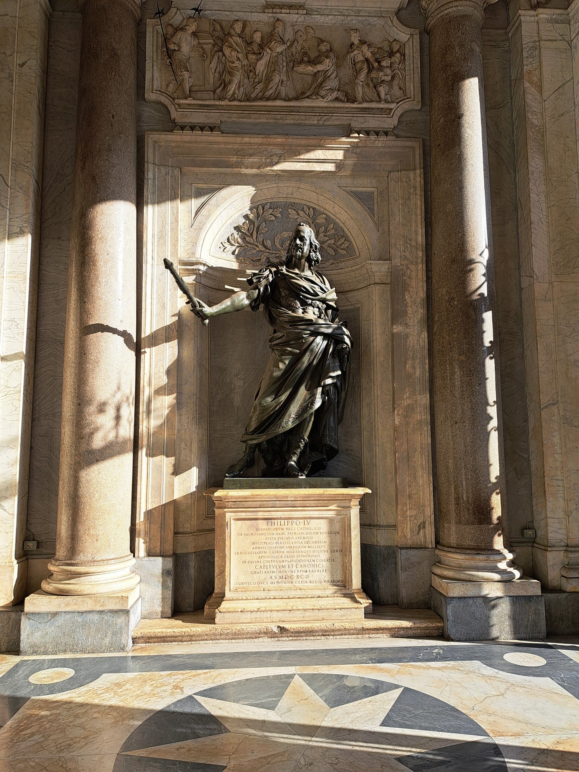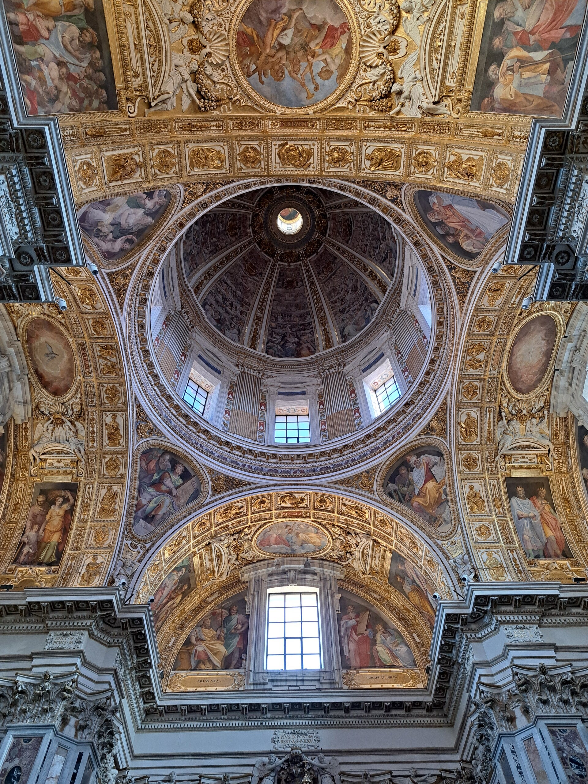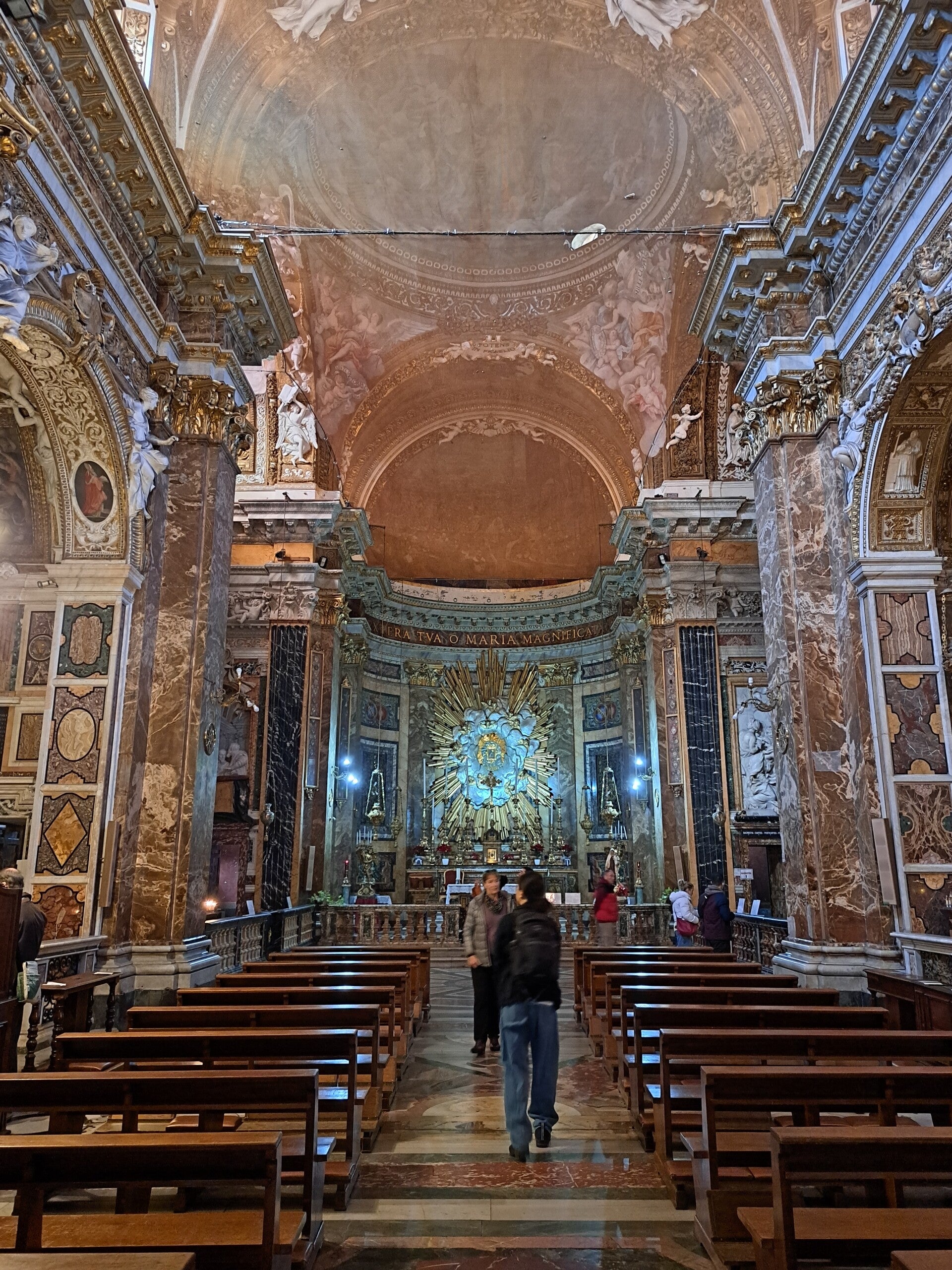 Op de eerste twee volle dagen in Rome hadden we eigenlijk nagenoeg alle grote bezienswaardigheden al gezien: Colosseum, Forum Romanum, Trevifontein, Pantheon, Engelenburcht en uiteraard het Vaticaan. Is dat alles in Rome? Uiteraard niet, met iets van 900 kerken en veel pleinen, fonteinen, standbeelden en noem maar op zou je wel weken kunnen vullen. Vandaag zo'n dag om vooral de minder bekende plekken te bezoeken, al begonnen we toch met nog wel een heel bekende basiliek: de Basilica Papale di Santa Maria Maggiore. Deze basiliek is een van de zeven pelgrimskerken van Rome, en is de enige van de vier pauselijke basilieken in Rome waarvan het antieke bouwwerk intact bewaard is gebleven. Zoals al bij het verslag van gisteren aangegeven, hadden wij buslijn 71 nu ontdekt. Deze lijn kwam ook nog eens langs deze basiliek, dus vanaf het appartement stonden we binnen de kortste keren voor de deur. Een indrukwekkend grote deur wel te verstaan en dat gold ook voor de rest van het gebouw. De basiliek was ook te bezoeken, we maakten graag van deze gelegenheid gebruik. Daarna een ontbijtje aan de rand van het plein voor de basiliek, waar we onder het genot van een broodje en een kop thee een plan gingen opstellen voor vandaag. We hadden twee opties: richting het centrumdeel met de winkelstraten om te gaan shoppen of een rondwandeling door de stad. Het werd een combi: een rondwandeling die ook door een aantal winkelstraten liep. Wij kopen voor stedentrips vaak een 'Time to momo' boekje, waarin altijd een aantal alternatieve wandelingen staan. Die wandelingen kun je vervolgens ook via een app volgen, ideaal om niet steeds te sjouwen met een papieren versie. Wij kozen nu voor een wandeling die begon in de buurt van de basiliek en die ook nog eens door het winkelgebied liep.