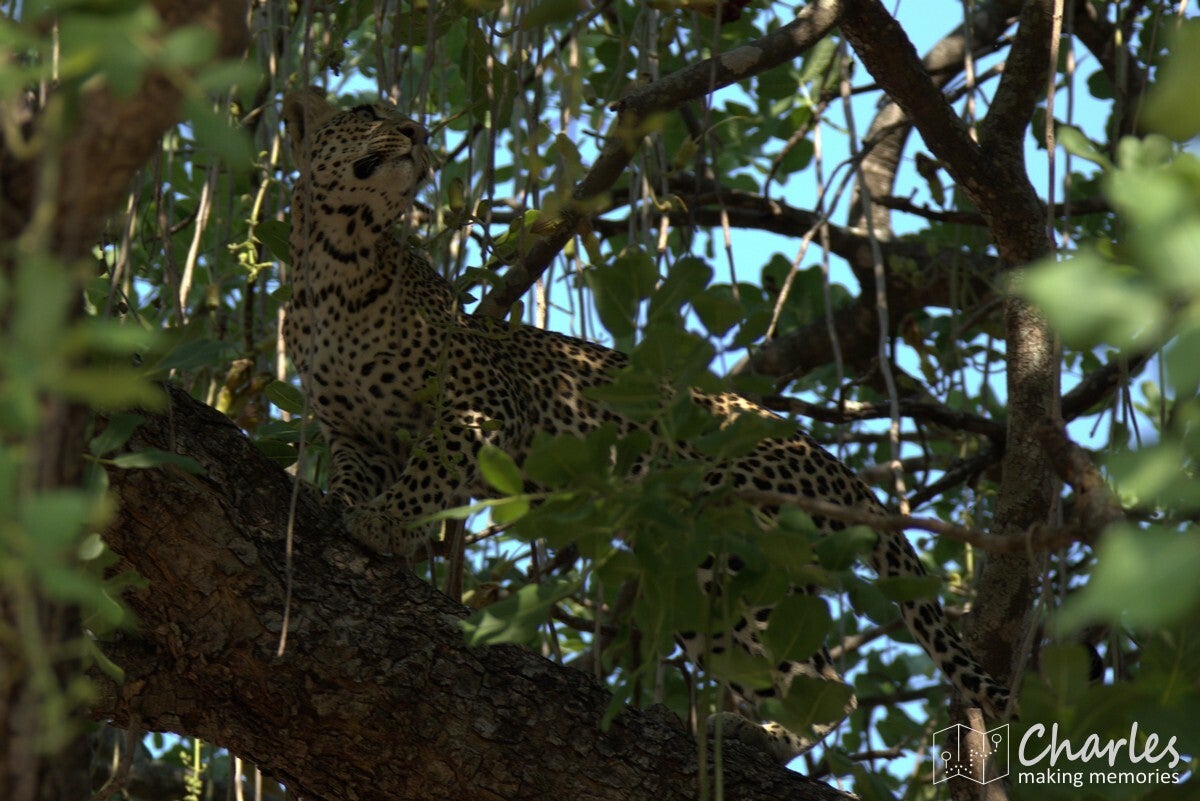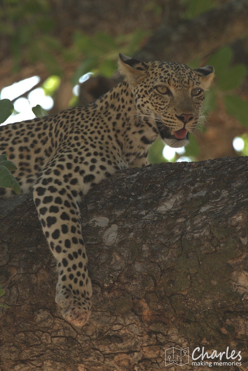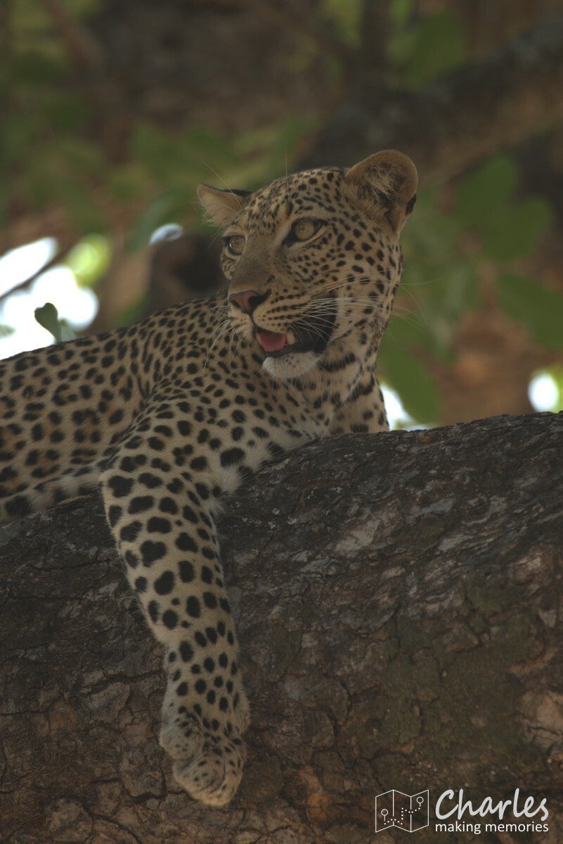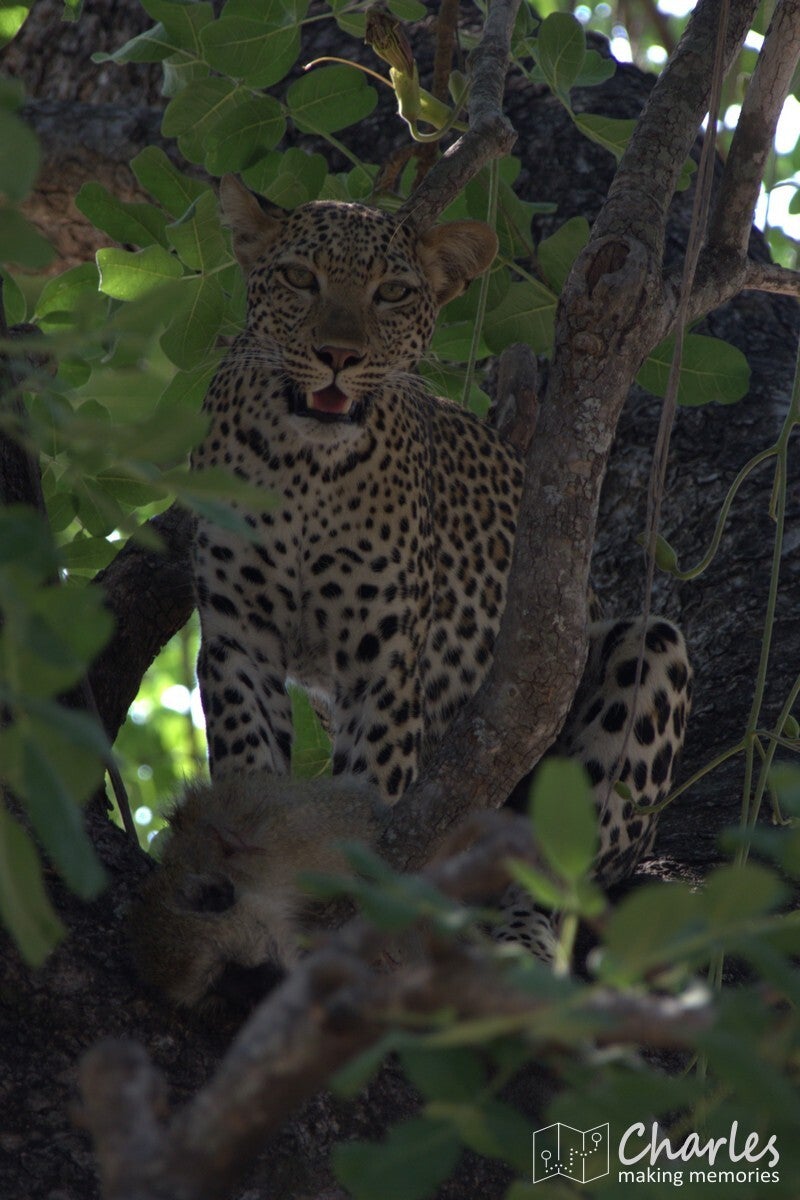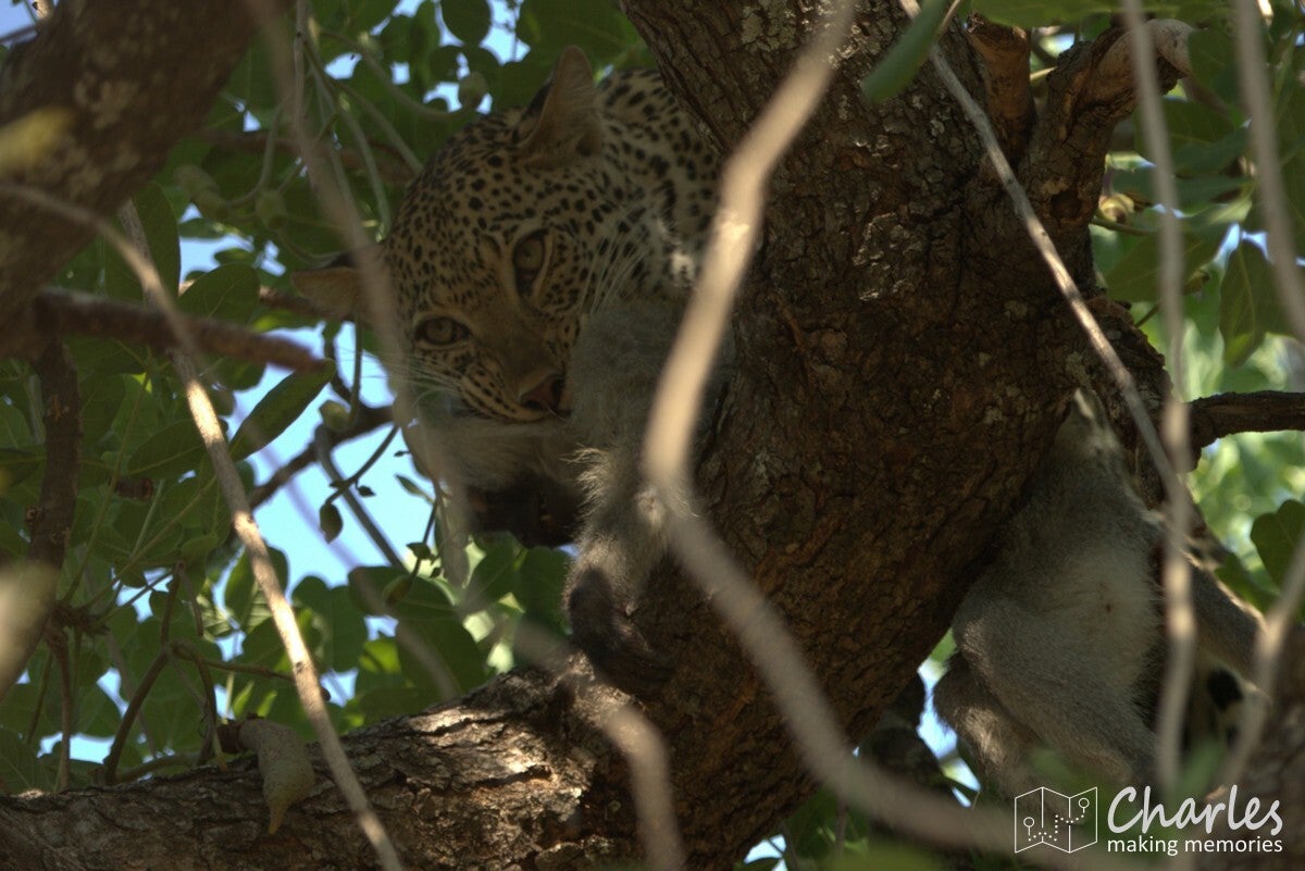 Voor het derde en laatste in het bijzonder te vermelden dier komen we weer terug bij een roofdier. Specifiek weer een katachtige: het luipaard. Onze gids was heel de dag relaxed aan het rondrijden, maar ineens kreeg hij na een telefoontje bijzonder haast. Gas op die lollie, we hadden gelijk het idee dat een andere gids iets had gespot. De plek waar we moesten zijn was echter niet makkelijk te vinden. Veel gerace, gebel en gezoek later kwamen we aan bij een grote boom waar ook twee andere wagens stonden. Even goed zoeken en we vonden in de boom een luipaard. Al snel hoorden we dat er sprake was van een bijzondere situatie, want het luipaard had apen achtervolgd. Een van deze apen was de boom in gevlucht, het luipaard was er achteraan geklommen. De aap zat ingesloten en het roofdier zat er op te loeren. Er was alleen al een poosje niets meer gebeurd, dus de andere jeeps gingen er weer vandoor. Zij waren nog maar net weg of het luipaard zette de aanval in. Een waar kat en muisspel, waarbij zowel jager als prooi van tak naar tak sprong. Het luipaard was wel zo slim om de weg naar beneden steeds te blokkeren. Na een paar minuten was er een duidelijke winnaar: het luipaard had de aap te pakken. Prijs was een lekker maal. Dit alles zagen wij dus voor onze neus gebeuren, ook het slepen met de aap en het haren plukken en eten achteraf en het bijkomen al liggend op een tak. Waanzinnig om mee te maken hoor.