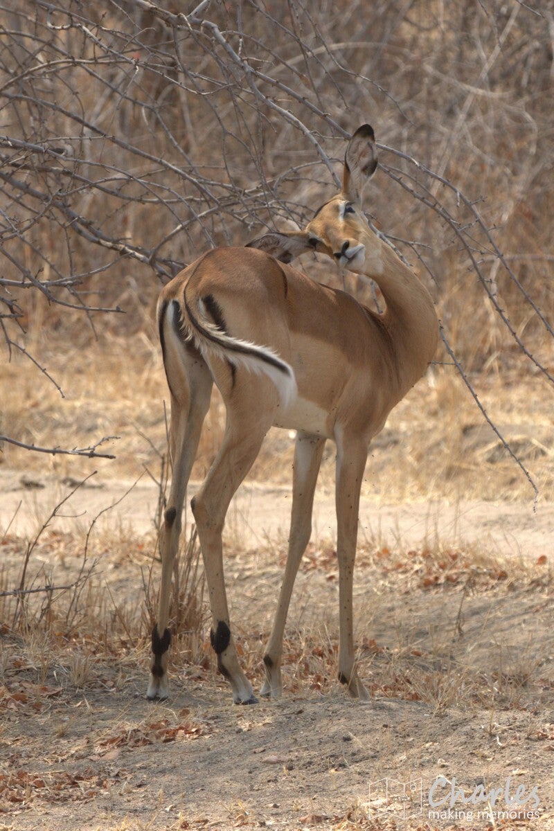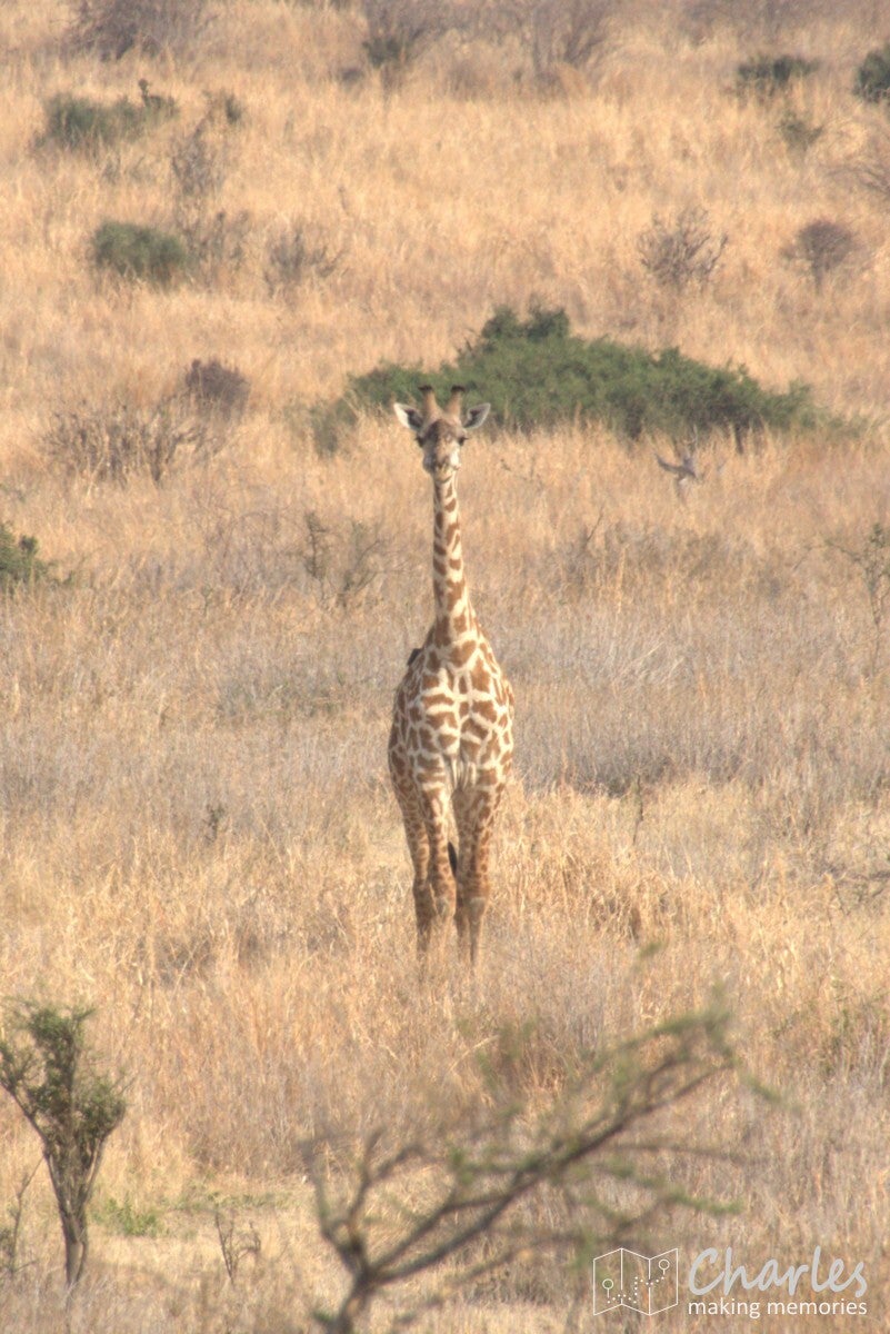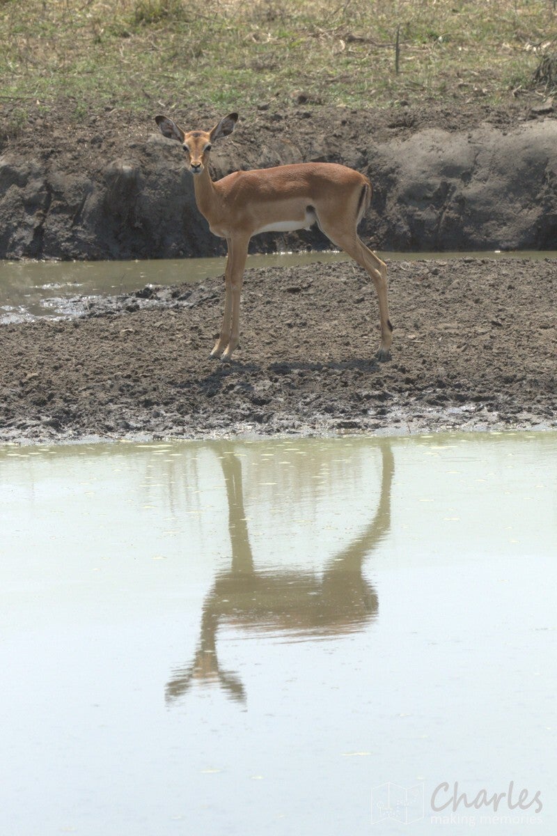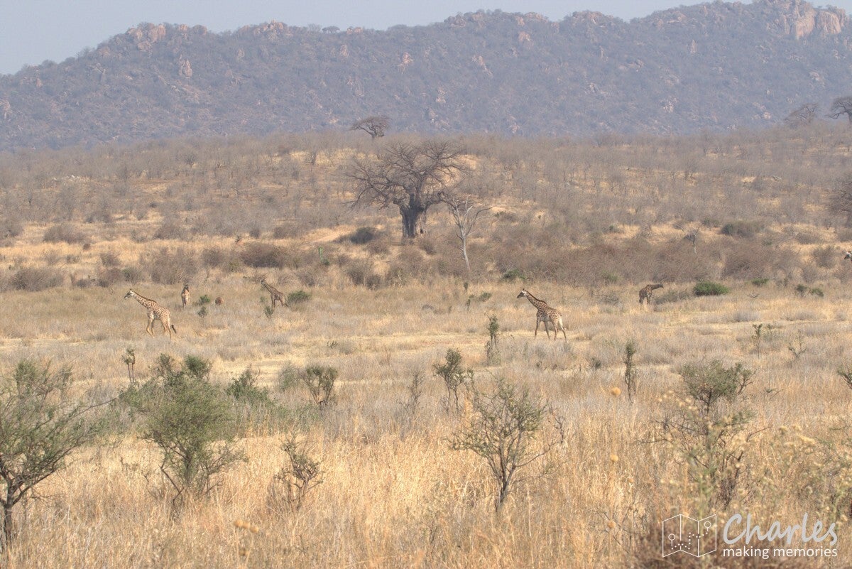 Na het uitstappen werden we begeleid naar een overkapte plek waar we konden wachten op onze gids. Er kwam net een soort safari-jeep aanrijden van de organisatie waar wij bij hadden geboekt. Na een paar minuten wachten toch maar daarnaartoe gelopen en gevraagd of hij toevallig Ben was, onze gids/chauffeur voor de komende twee weken. Het antwoord was ja, hij had ons alleen een uur later verwacht en had ons daarom nog niet gezocht. Terwijl alles in orde werd gemaakt, vermaakten wij ons met foto's maken. Er kwam in de verte namelijk van alles voorbij: giraffes, impala's en zebra's. Nog voordat we een meter hadden gereden, hadden we al bijna een halve SD-kaart volgeschoten.