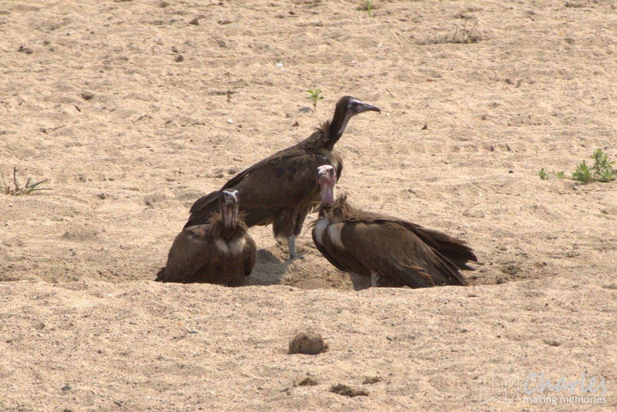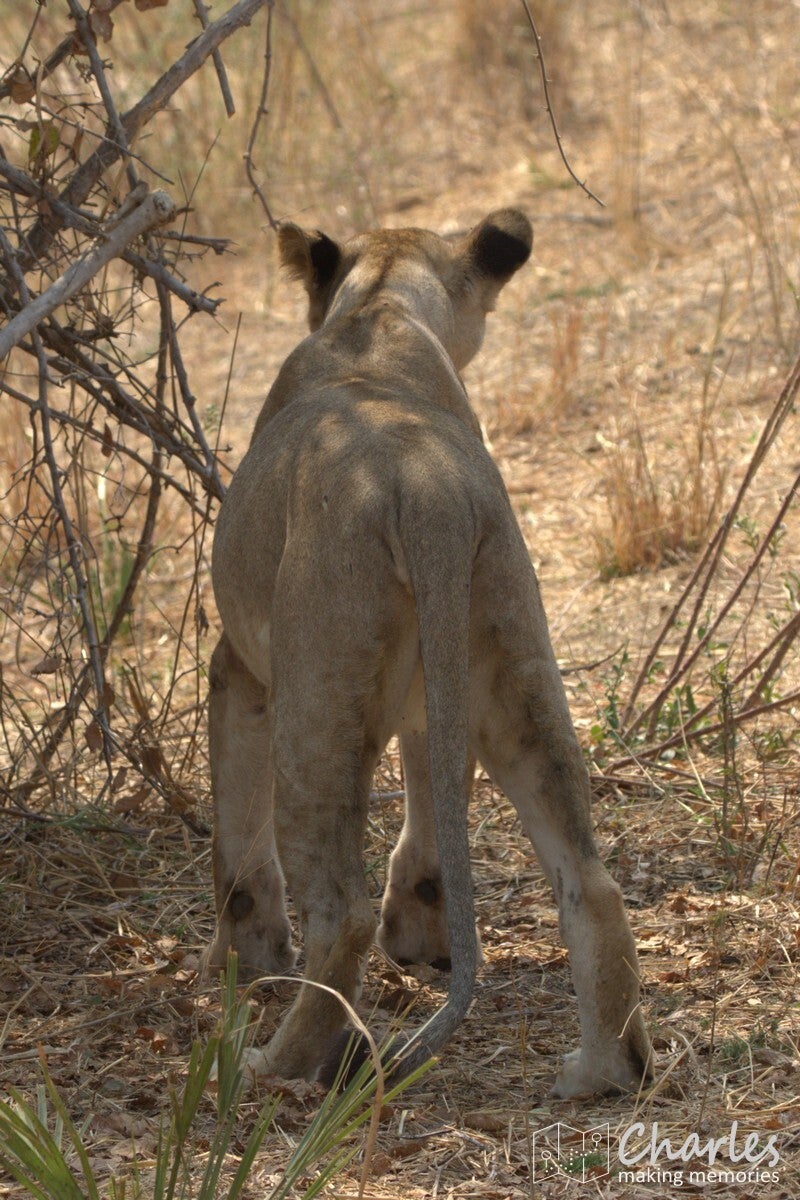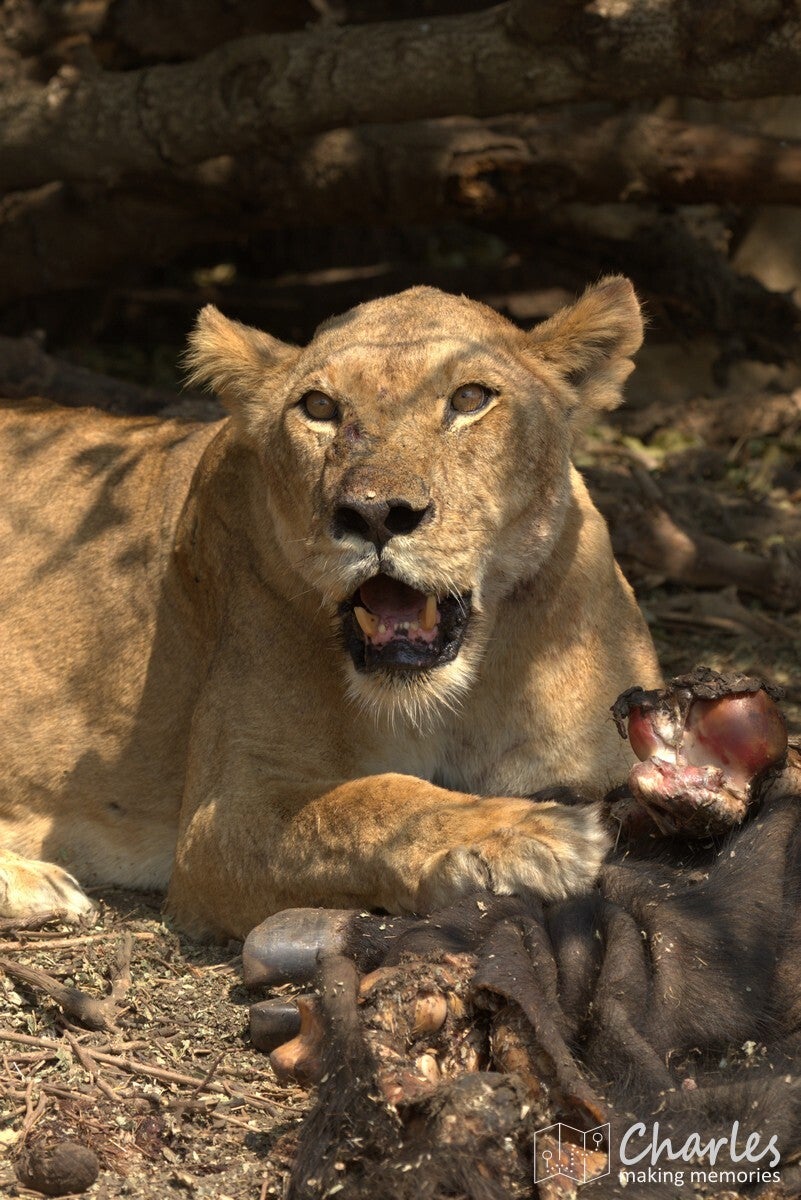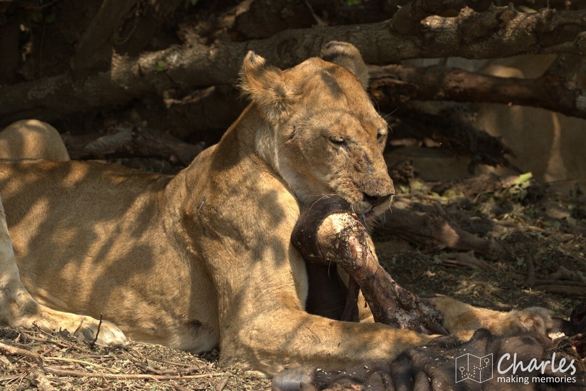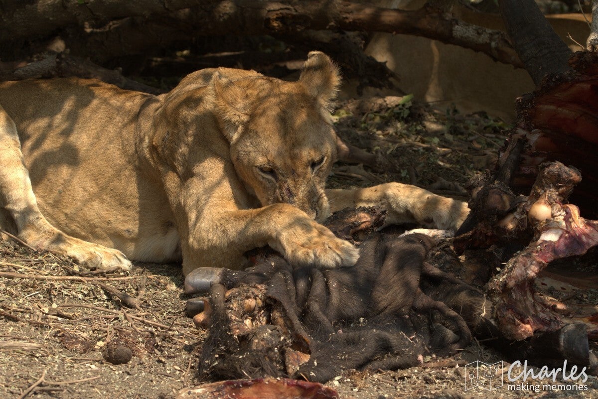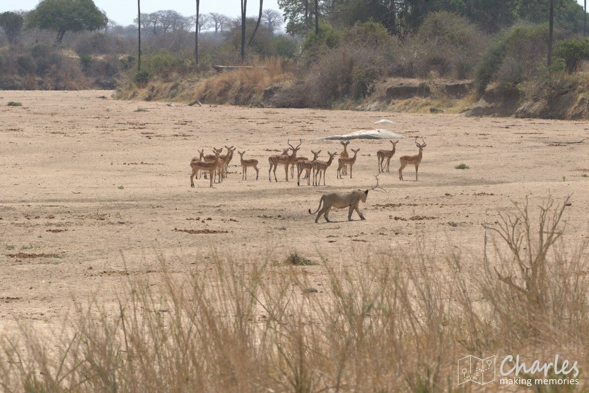 Allereerst het bijzondere geval van een grote groep leeuwen. Verspreid langs de oever van een drooggevallen rivier waren ze te vinden. Aan de overkant twee mannetjes met een aantal vrouwtjes, vooral lekker aan het niksen. Aan 'onze' kant twee vrouwtjesleeuwen, eerst nog liggend en daarna aan de wandel. Eentje leek wel geinteresseerd in de impala's die midden op de rivierbedding liepen. Ze liepen in ieder geval verder door, waarna we ze volgden. Er bleek een stuk verderop ook het karkas van een buffel te liggen, de reden waarom deze groep hier rondhing. Een vrouwtjesleeuw deed zicht tegoed aan het laatste vlees, met het hoofd soms diep tussen borstkast. Terwijl we dit tafereel van dichtbij bewonderden, moesten we ook die andere leeuwin in de gaten houden. Deze maakte aanstalten om op impalahacht te gaan. Uiteindelijk gebeurde er niets meer, de impala's gingen er op tijd vandoor. Wel gingen de twee actieve leeuwinnen nog even langs een picknickplaats, fijn dat daar niemand aan de boterhammen zat. Mooi om deze groep leeuwen bezig te zien, maar uiteindelijk moesten ook wij weer door. Uiteraard wel geleerd om tijdens de lunch goed op te letten.