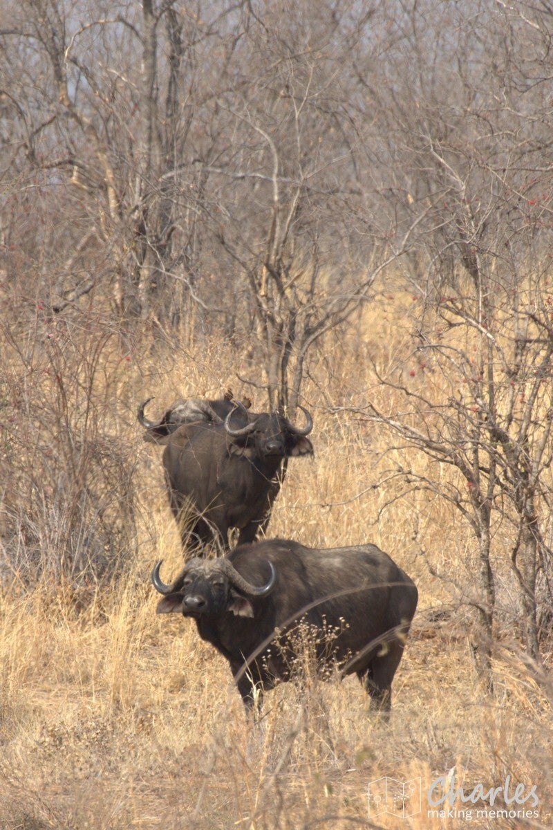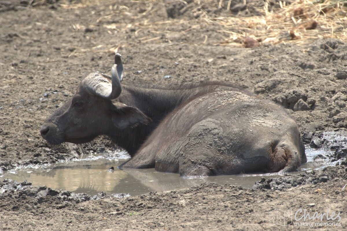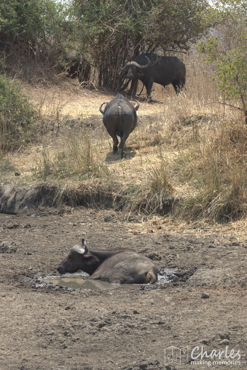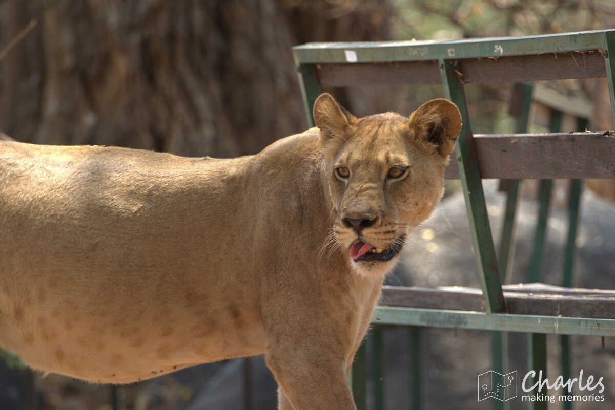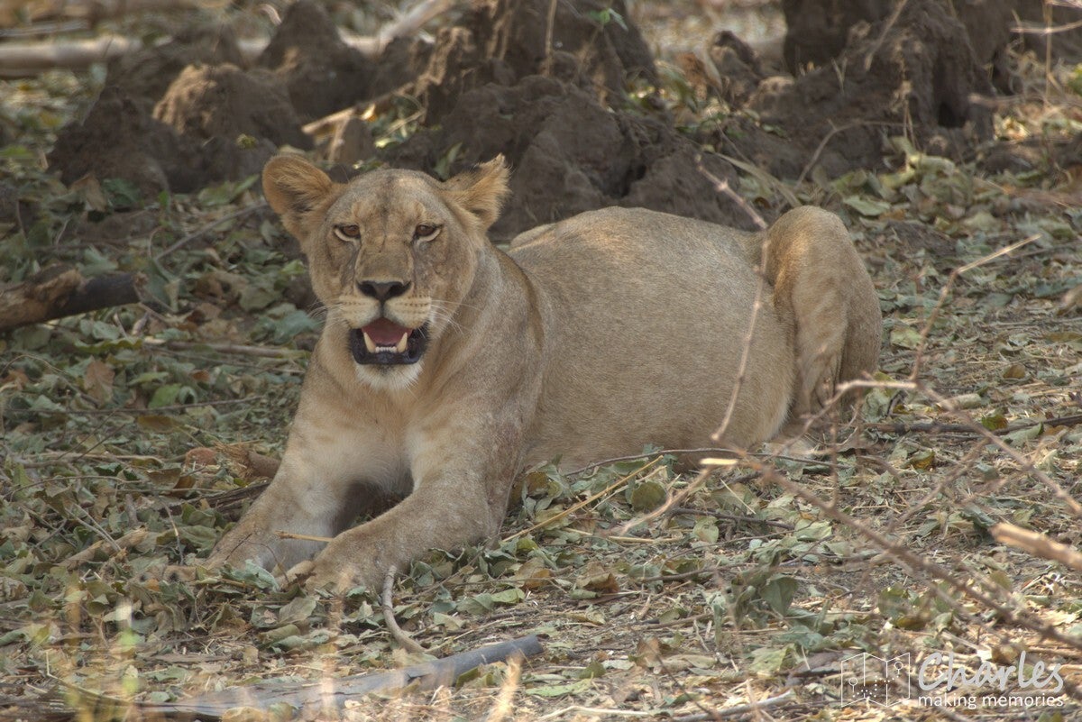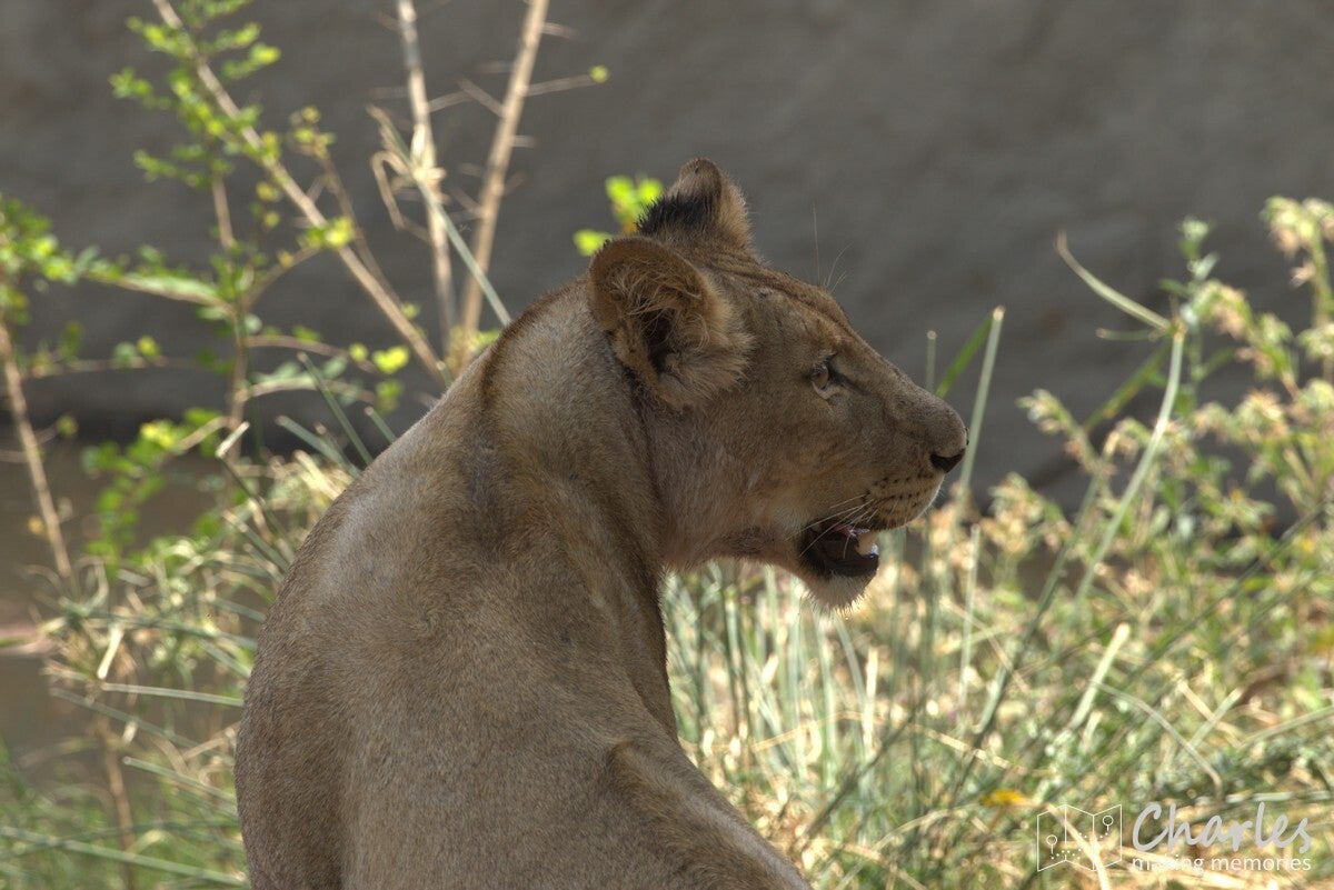 Allereerst het bijzondere geval van een grote groep leeuwen. Verspreid langs de oever van een drooggevallen rivier waren ze te vinden. Aan de overkant twee mannetjes met een aantal vrouwtjes, vooral lekker aan het niksen. Aan 'onze' kant twee vrouwtjesleeuwen, eerst nog liggend en daarna aan de wandel. Eentje leek wel geinteresseerd in de impala's die midden op de rivierbedding liepen. Ze liepen in ieder geval verder door, waarna we ze volgden. Er bleek een stuk verderop ook het karkas van een buffel te liggen, de reden waarom deze groep hier rondhing. Een vrouwtjesleeuw deed zicht tegoed aan het laatste vlees, met het hoofd soms diep tussen borstkast. Terwijl we dit tafereel van dichtbij bewonderden, moesten we ook die andere leeuwin in de gaten houden. Deze maakte aanstalten om op impalahacht te gaan. Uiteindelijk gebeurde er niets meer, de impala's gingen er op tijd vandoor. Wel gingen de twee actieve leeuwinnen nog even langs een picknickplaats, fijn dat daar niemand aan de boterhammen zat. Mooi om deze groep leeuwen bezig te zien, maar uiteindelijk moesten ook wij weer door. Uiteraard wel geleerd om tijdens de lunch goed op te letten.
