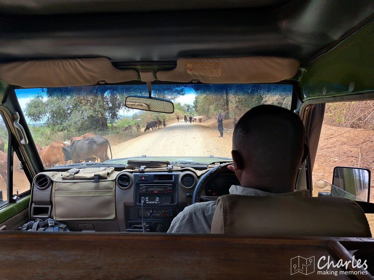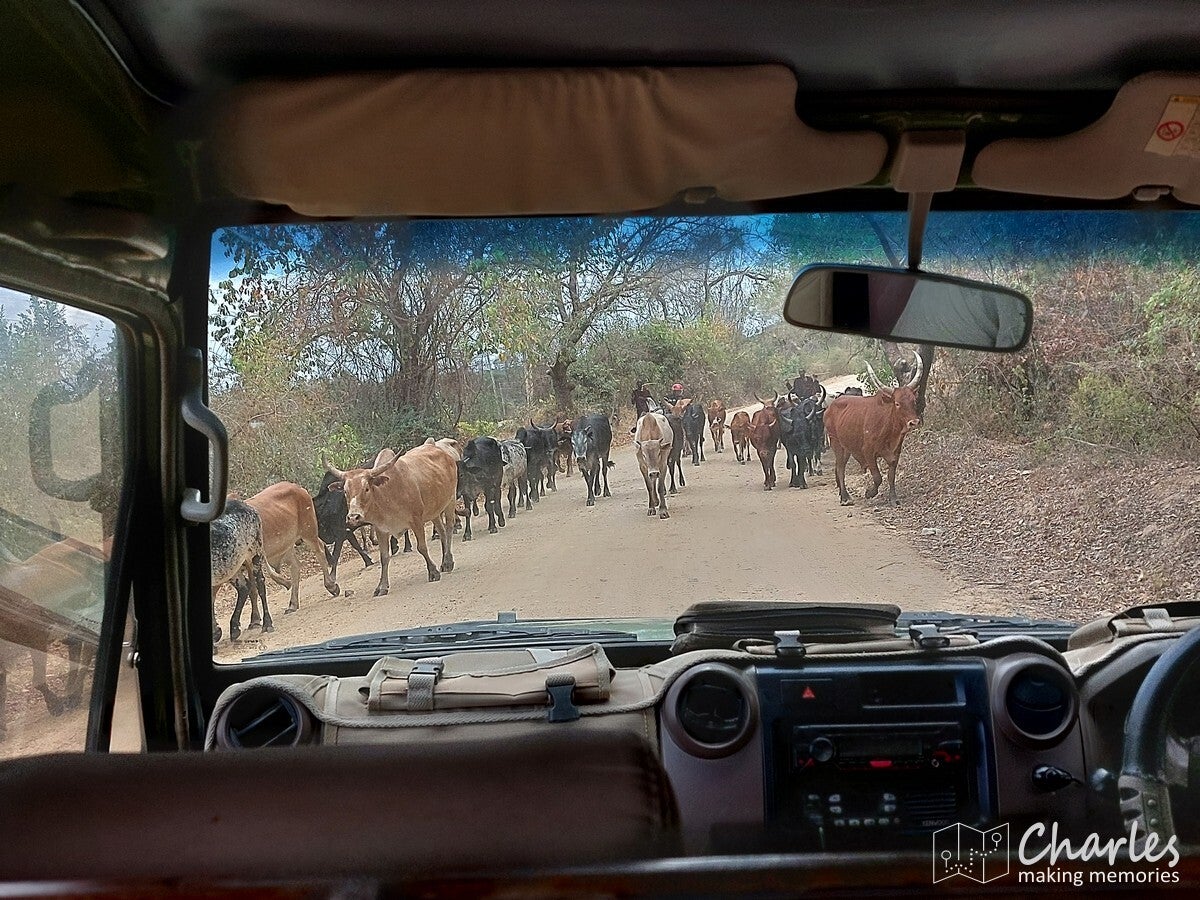 Om verder richting Nyerere te gaan, moesten we dwars door de heuvels/bergen. Direct na het verlaten van Moboro reden we de zeer groene heuvels in. Asfalt werd een zandweg en de vele vrachtwagens waren vervangen door vele motoren en brommers. Bizar hoe hoog ze goederen achterop een motor weten op te stapelen en hoe veel mensen er op zo'n tweewieler passen. De heuvels en bergen zijn niet goed geschikt voor vrachtwagens, dus dan maar op deze manier alles en iedereen vervoeren. De zandweg was kort geleden weer opgeknapt (glad geschoven), dus het reed prima. Midden door het groene landschap met hier en daar een dorpje en ergens diep in het gebied zelfs een verrassend groot stadje, het was een leuke tocht. Wel best lang rijden, want pas aan het begin van de middag zagen we vanuit de bergen een vlakte ver beneden ons. Nog even afdalen en we reden door dit vlakke gebied. Hier vielen vooral de kuddes met runderen op. Eerst liepen ze ons consequent tegemoet. Eenmaal in een stadje bleek dat te zijn vanwege een wekelijkse veemarkt. Al die kuddes kwamen daar dus vandaan. Na het stadje werkte het andersom. We reden de kuddes op de weg in de rug tegemoet. Dit bleef zo tot misschien wel 15 kilometer van de markt vandaan, indrukwekkend welke afstanden ze lopend afleggen.