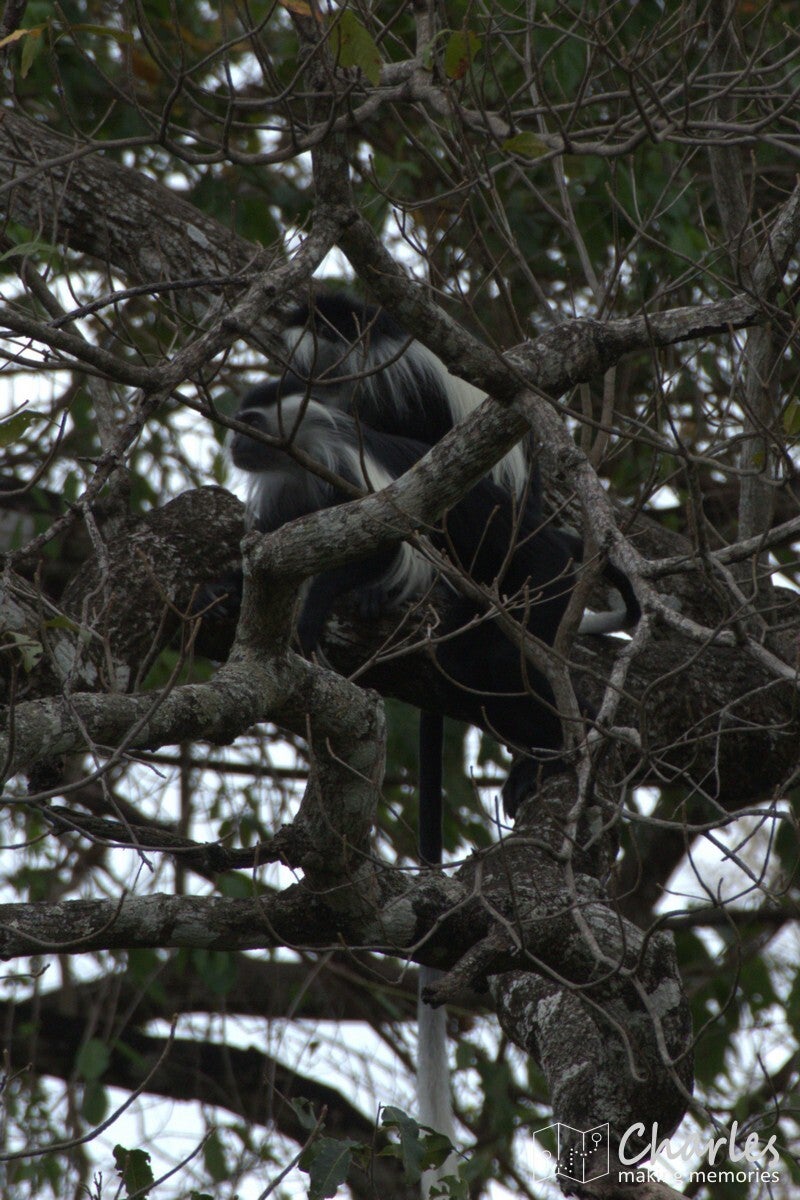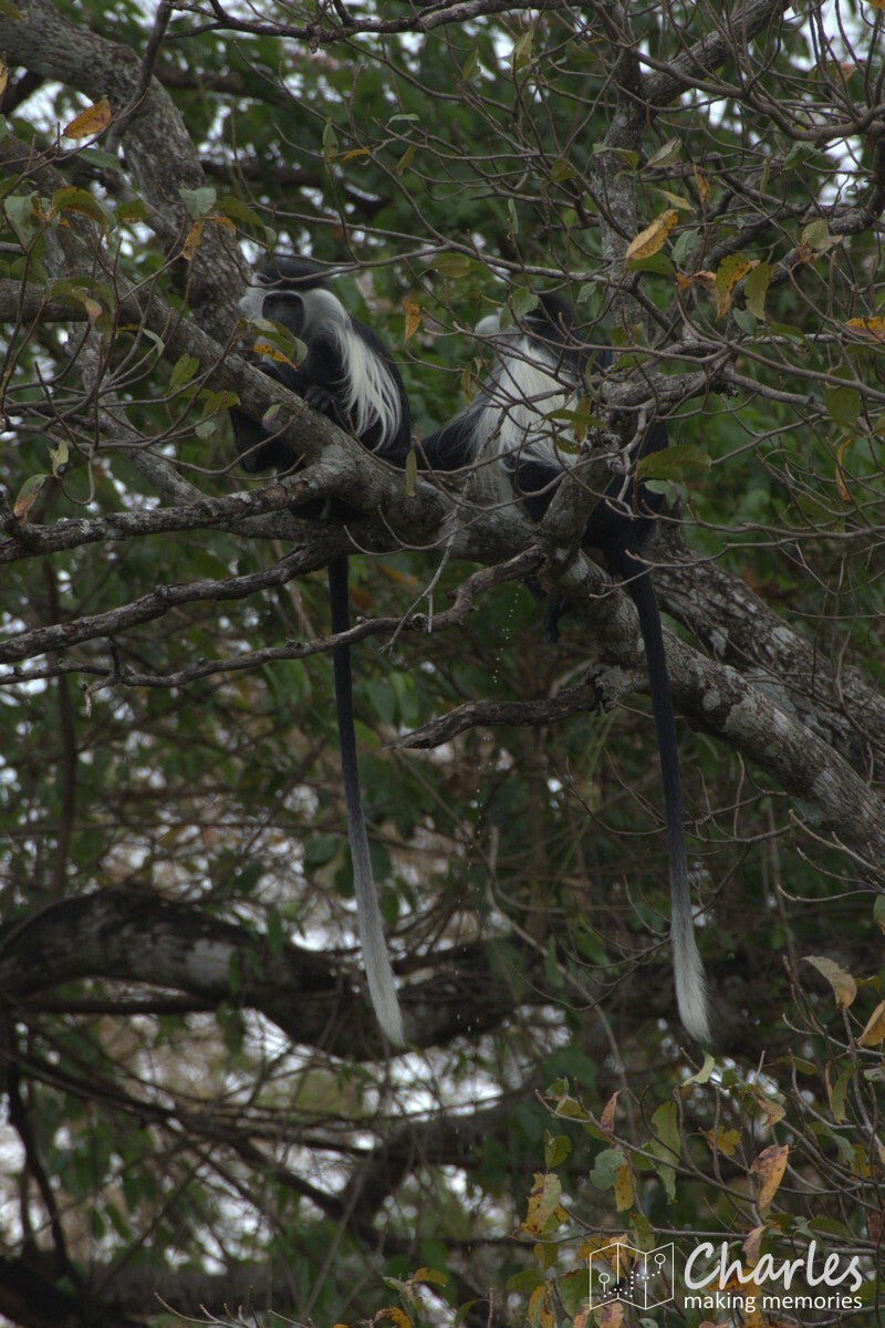 Nog een stadje door en om ongeveer half drie in de middag kon het laatste stuk van ongeveer 15 kilometer richting Nyerere NP. Het was voor ons vooraf niet geheel duidelijk, maar om bij onze lodge net buiten het park te kunnen komen, moesten we door het park heen. De lodge lag namelijk bij een andere ingang van het park. Toch nog een korte gamedrive vandaag, zelfs beginnend voor de poort (want de poort zelf ligt een stuk in het park). Al heel snel werden zwart-witte colobusapen gespot, dus snel camera's paraat en het dak omhoog. Klikken maar, de gamedrive was gelijk begonnen! Vlak na deze apen ook nog diadeemmeerkatten, wat een weelde. Dit stuk van het park is dichtbebost, dus hier ze je veel apen. Bij de ingang van het park nog even een stop voor een late lunch, met bijzondere voorbijgangers. Om de zoveel tijd liepen er wrattenzwijnen voorbij, onduidelijk of ze rondjes liepen of er steeds andere exemplaren langs kwamen paraderen. Uiteindelijk hebben we er op een gegeven moment drie tegelijk gezien, maar mogelijk waren het er dus meer.