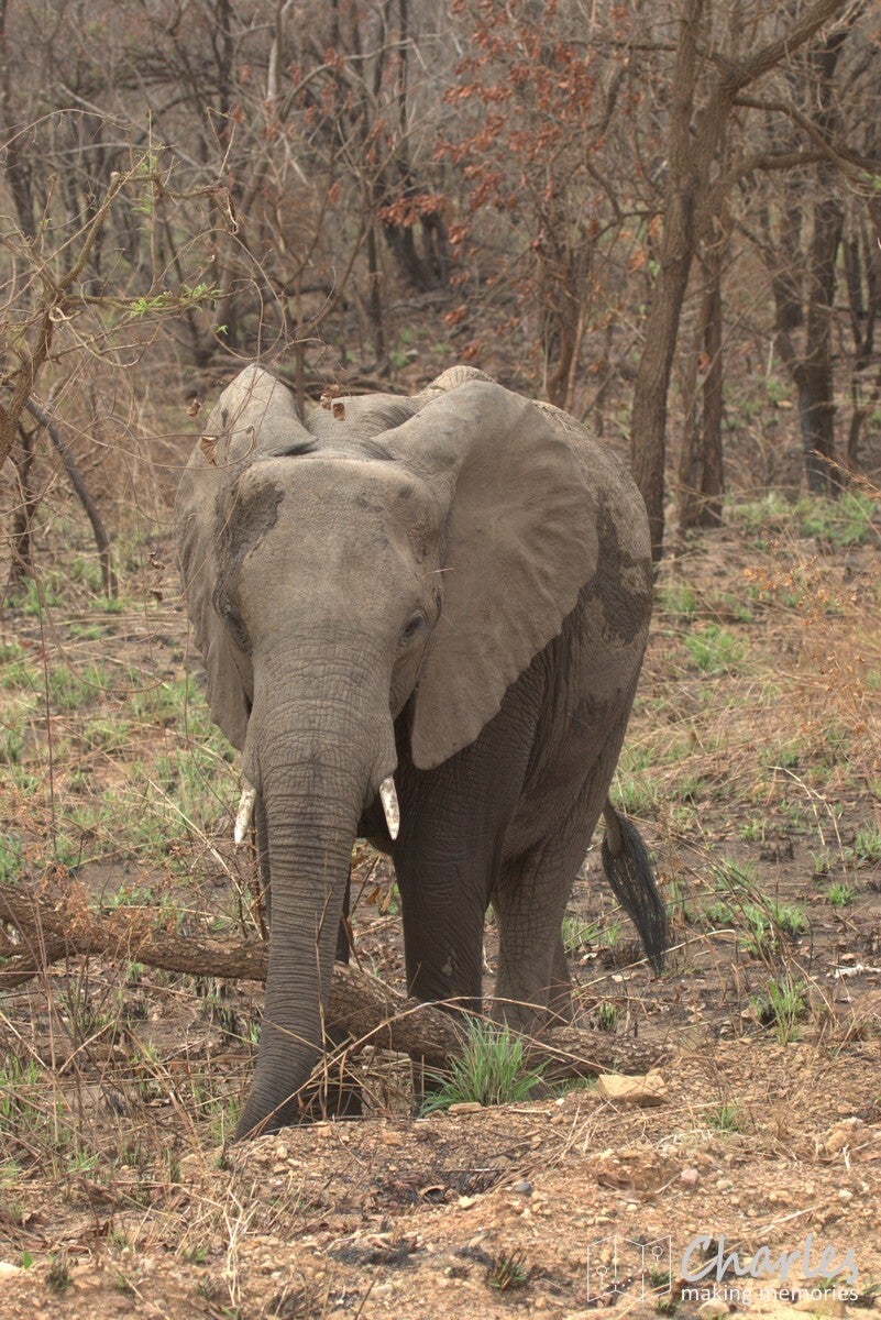 Om ongeveer 18.30 uur (het was al bijna donker) kwamen we aan bij de poort. Snel even afmelden en door naar de lodge. Deze lag in een dorp op een paar kilometer van de poort. Hier was nog even de nodige reuring, want er liep een kudde olifanten door het dorp. Wij in ieder geval snel door naar de lodge. Even inchecken, snel omkleden en gelijk aan het diner. Na het diner werden we nog even gewaarschuwd dat er olifanten bij het huisje liepen (waarschijnlijk dezelfde die eerder in het dorp liepen), er ging voor de zekerheid maar even een bewaker mee. Voorbij het huisje zag je de nodige struiken en bomen bewegen, je kon de olifanten ook goed ruiken. Ze waren onderweg naar de rivier en hadden weinig interesse in ons. Wij in ieder geval blij veilig in het huisje te zijn, duidelijk dat je goed om je heen moet kijken als je van of naar je huisje gaat. Nu konden we in ieder geval lekker naar bed, morgen vroeg op.