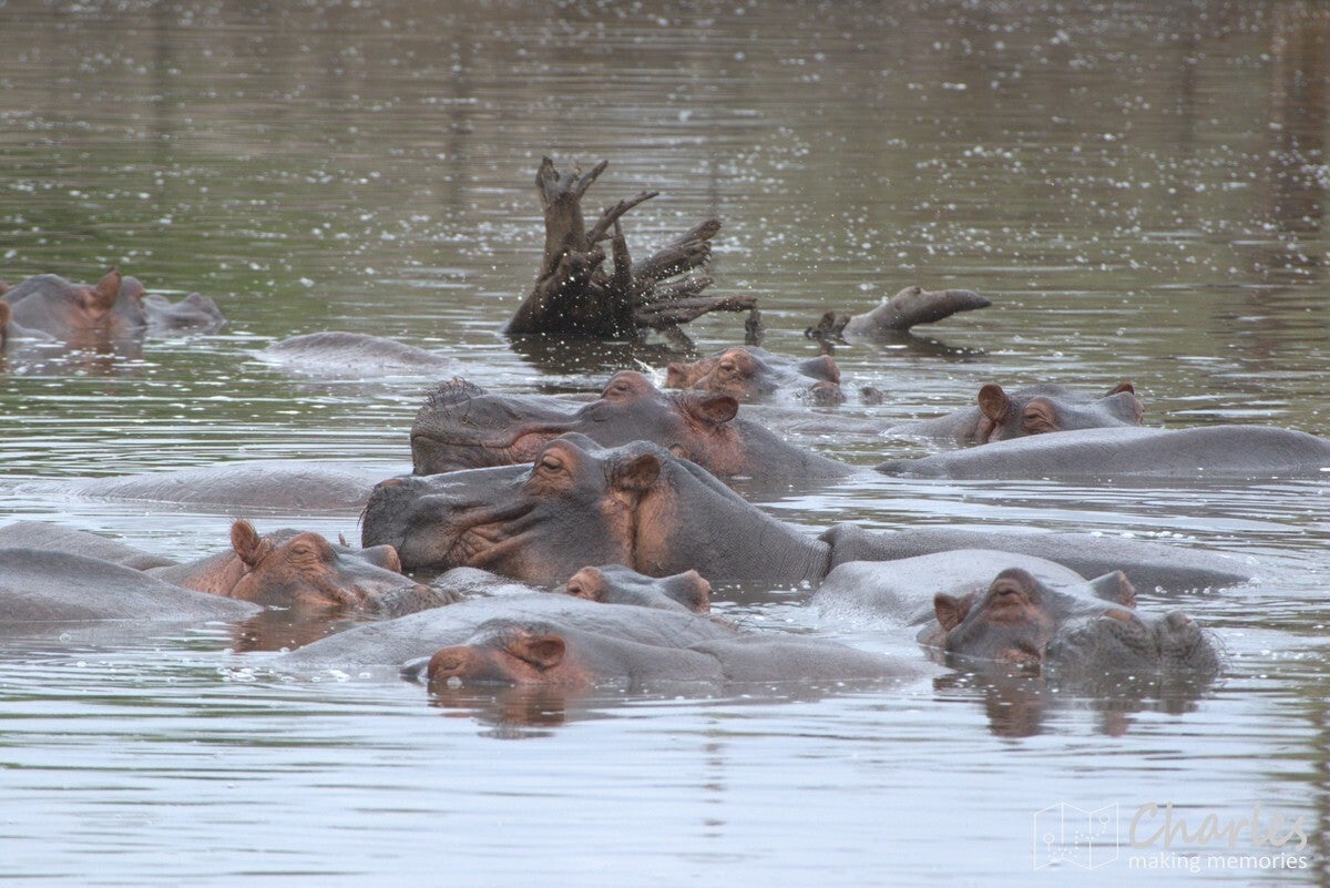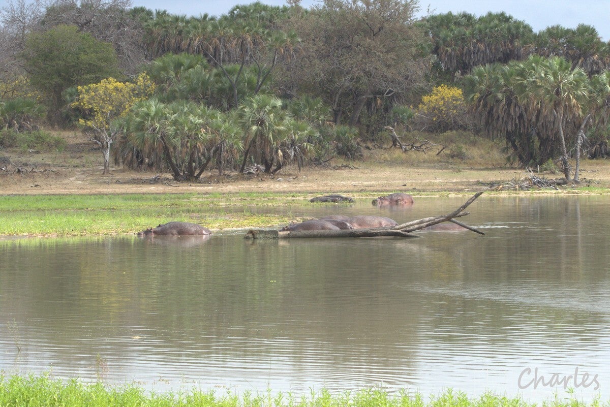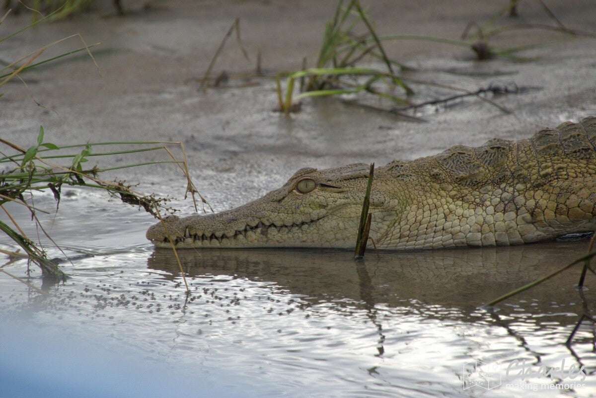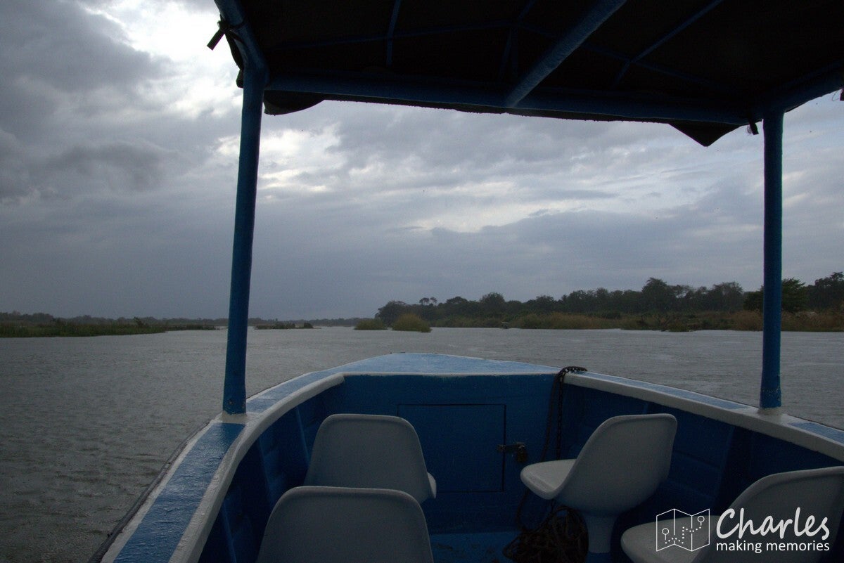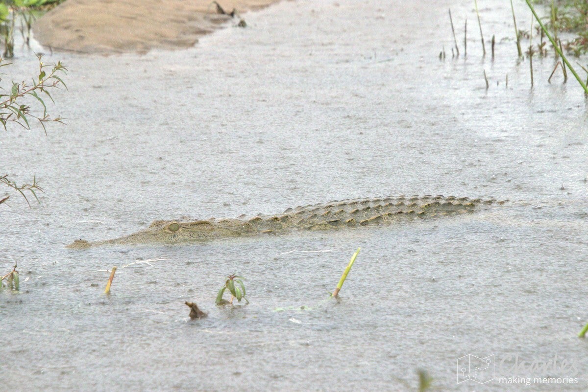 Aan het begin van de middag gingen we terug naar de lodge voor een late lunch. Terwijl vlak voor de lodge een kudde olifanten voorbijkwam moesten we nog even lachend terugdenken aan die hele rij auto's om een bosje waar twee olifanten verstopt zaten. Hetzelfde herhaalde zich trouwens nog eens bij het avondeten. Iets minder was dat er nog wel wat buitjes voorbij bleven komen, de 10 mm werd vandaag makkelijk overschreden. Ook tijdens de volgende activiteit bleef het niet droog: een boottocht op de rivier. De regen hield de dieren in ieder geval niet tegen: voldoende krokodillen, nijlpaarden en vogels om te bewonderen. Ook werd veel uitgelegd over het park, het dorp, het leven hier en de planten die langs de oever te vinden waren. Best leerzaam allemaal, de boottocht was helemaal prima. In de avond geen programma, gewoon lekker dineren in de lodge en verder rustig aan.