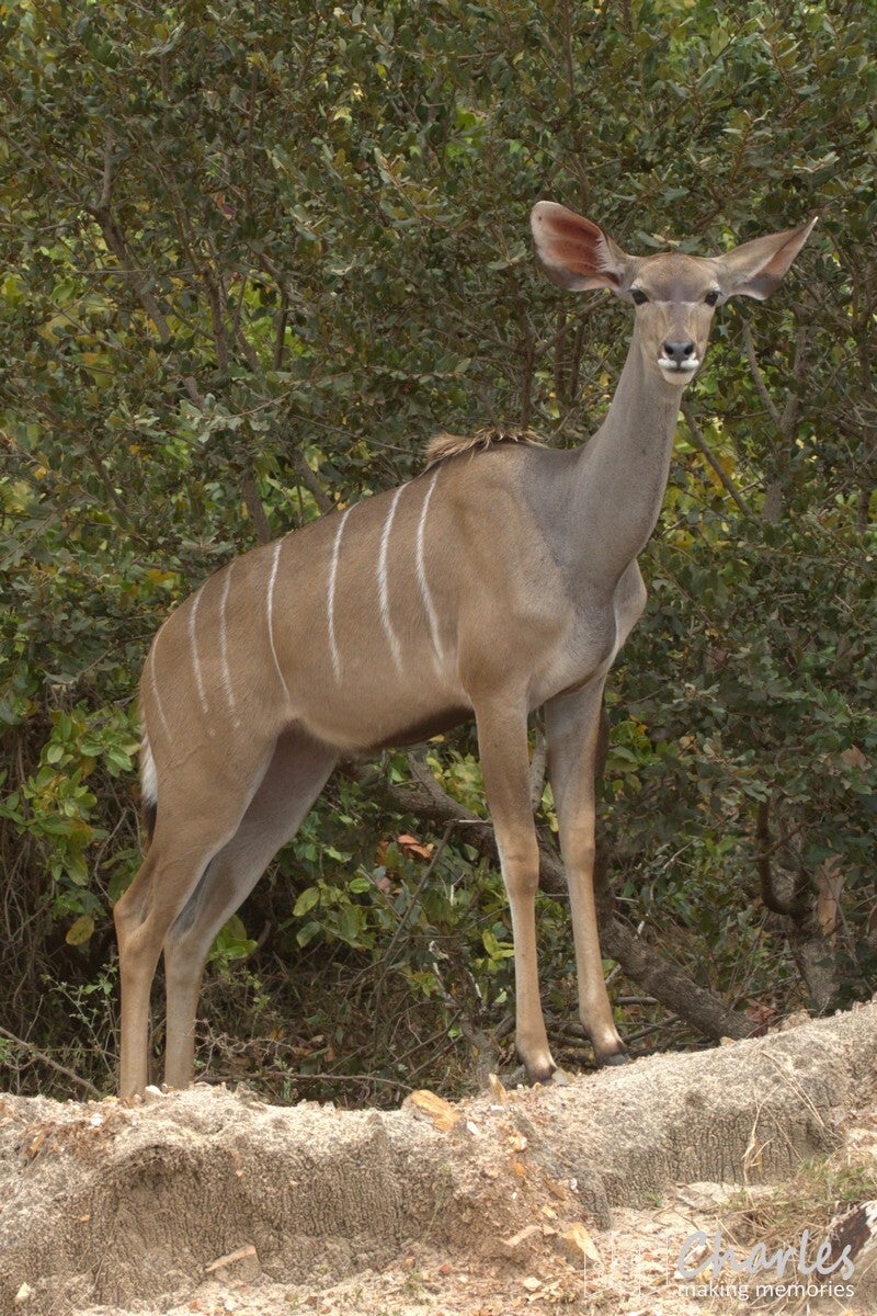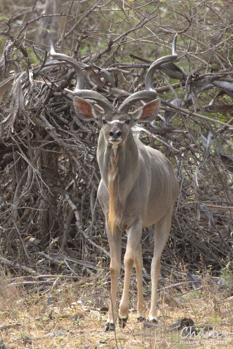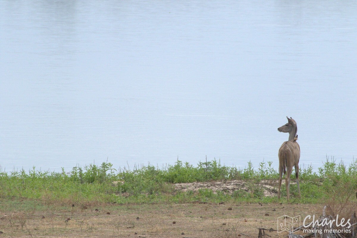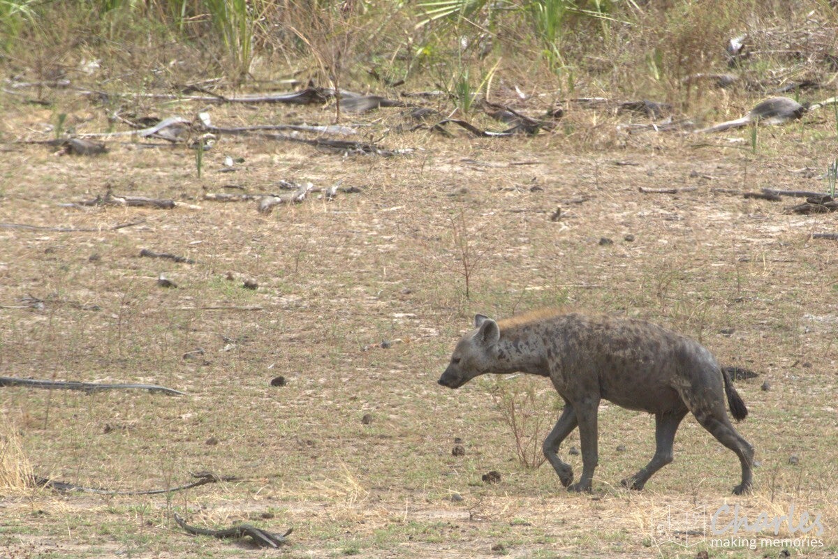 Na een tijd rondrijden in het gebied waar veel jeeps rondreden, gingen we steeds verder weg en dat betaalde zich uit. Langs een meer kwamen we een kudde kudu's (of koedoes) tegen. Vooral de mannetjes met een gigantisch gewei waren echt prachtig. Terwijl we stonden te genieten, riep onze gids ineens dat er een hyena liep. Wij dachten dat er een geintje werd gemaakt, maar zo'n dertig meter voor onze neus kwam er inderdaad een hyena op zijn gemak voorbijlopen. Een heel stuk verderop zagen we nog een tweede exemplaar, die zijn we ook nog dichterbij gaan bekijken. Hoe dan ook werd een beetje gezapige gamedrive ineens een hele leuke.