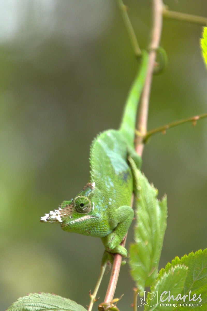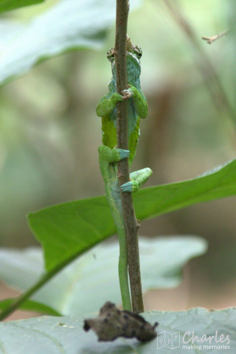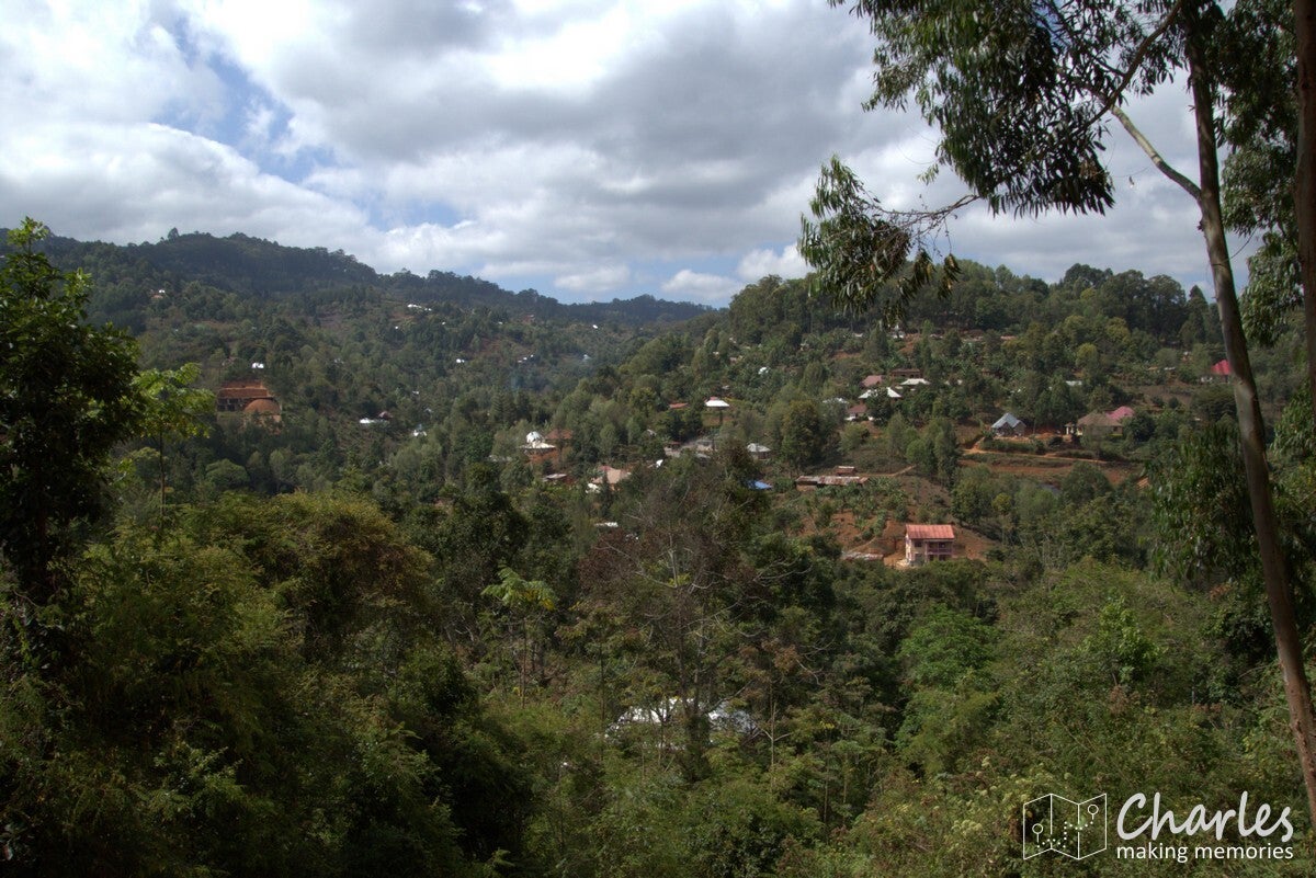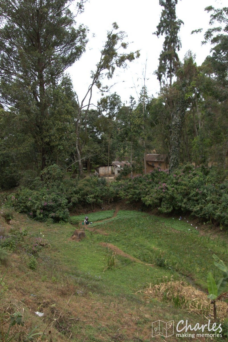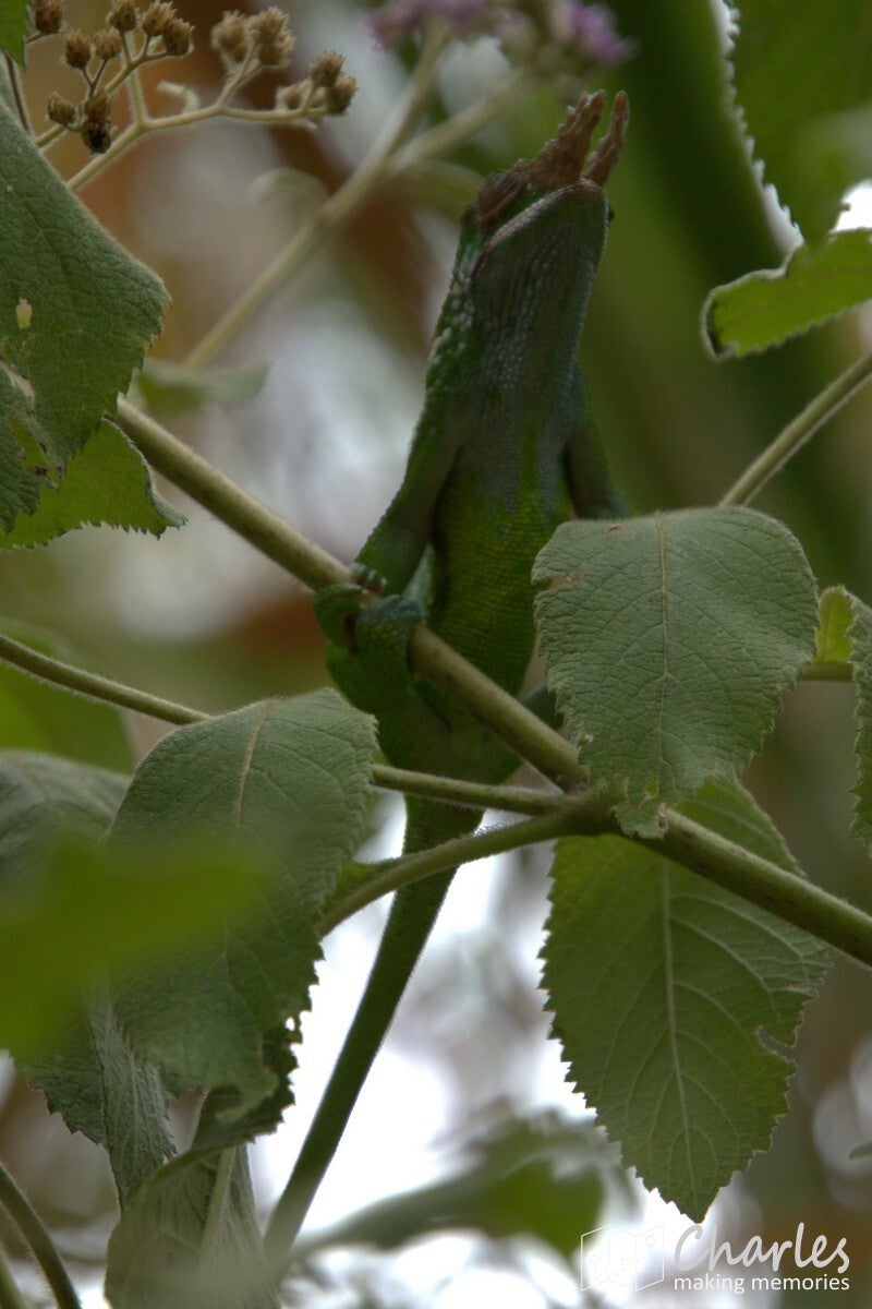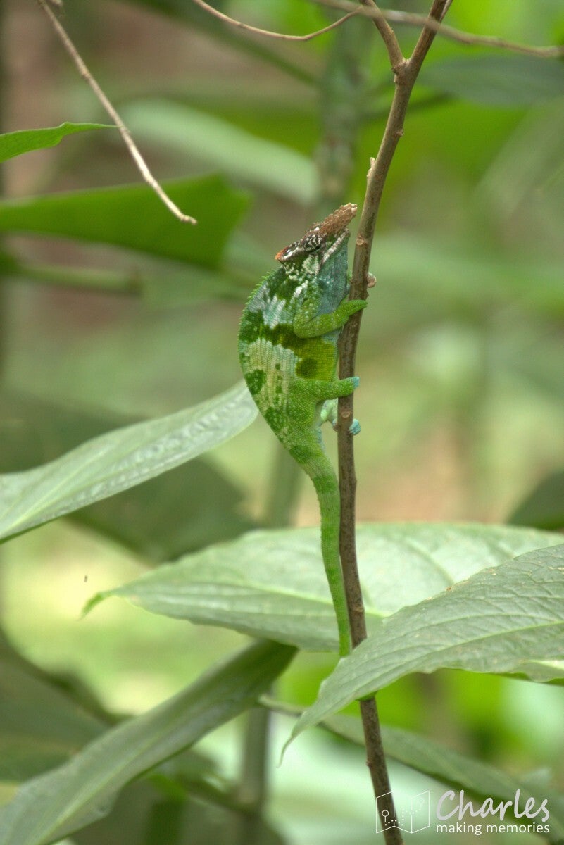 Omdat het vandaag marktdag is in Lushoto, nam hij ons eerst mee dwars door het centrum van het plaatsje. Beetje onwennig voor ons, want wij waren ingesteld op een wandeling door landelijk gebied en de natuur. Gelukkig was de route door de stad niet al te lang en we kunnen nu toch maar mooi zeggen dat we het centrale plein (meer een grasveld), de markt, het busstation en de katholieke kerk van Lushoto hebben gezien. Eenmaal buiten het centrum waren we ook heel snel in het meer landelijk gebied. Ergens een klein paadje in en we liepen in het groen en begonnen aan een gestage klim. Soms over een zandweg, soms een kortere route over een smal paadje of over een erf. Niemand leek zich druk te maken als je even over privéterrein ging om je weg weer te vervolgen. Even een vriendelijk 'jambo' en een klein gesprekje al lopend tussen gids en bewoner en alles was helemaal prima. Voor wat betreft de zoektocht naar kameleons: die was 300 meter buiten de stad al geslaagd en er zouden nog vele exemplaren volgen. Qua klimmen was het voor ons aanpoten, gelukkig was er alle tijd om een eigen tempo aan te houden. Tussendoor ook voldoende stops waarbij Nicolas van alles uitlegde over eerst de omgeving, de mensen en de vegetatie en later over het natuurgebied en alles wat er leeft.