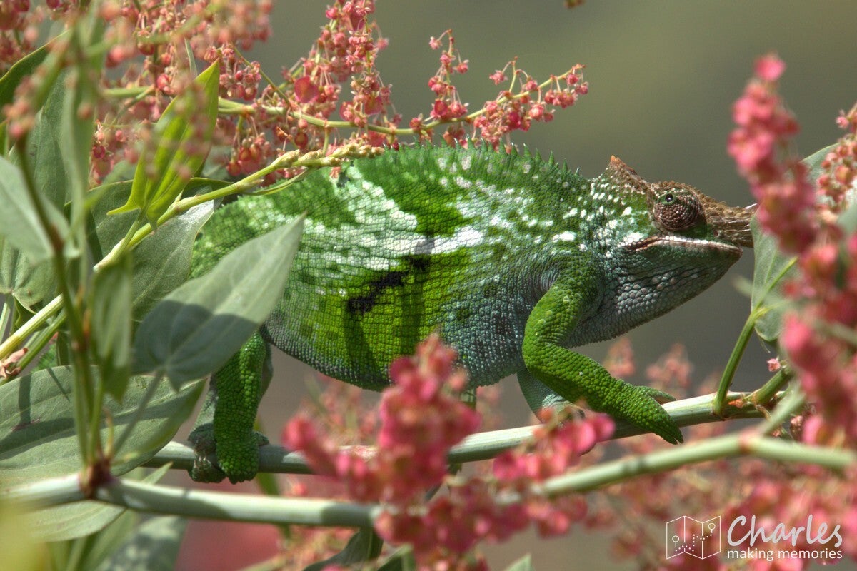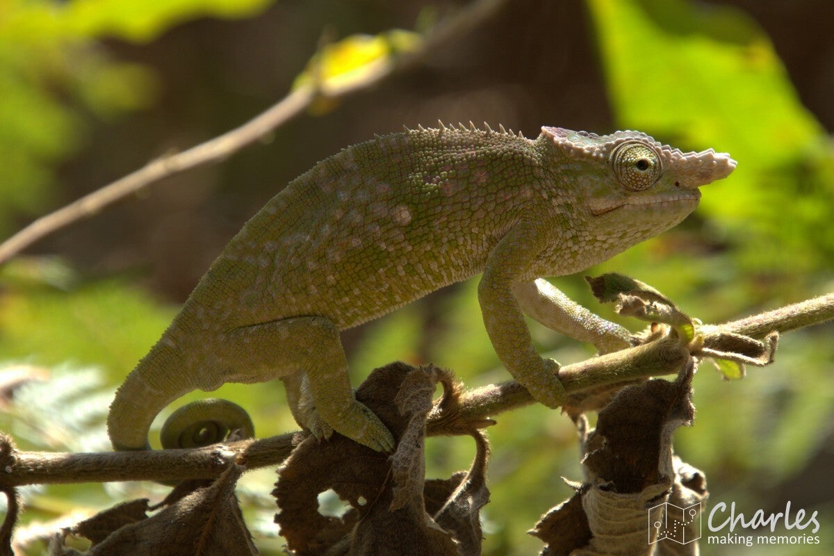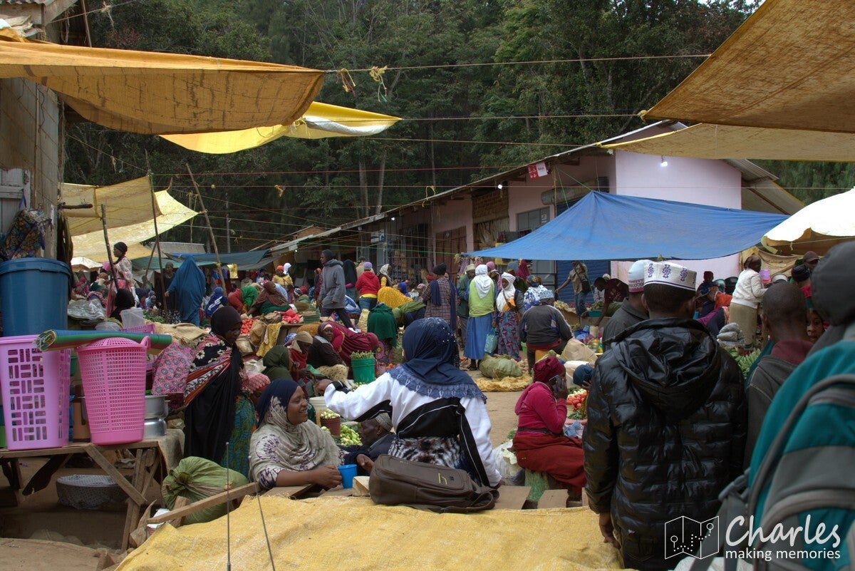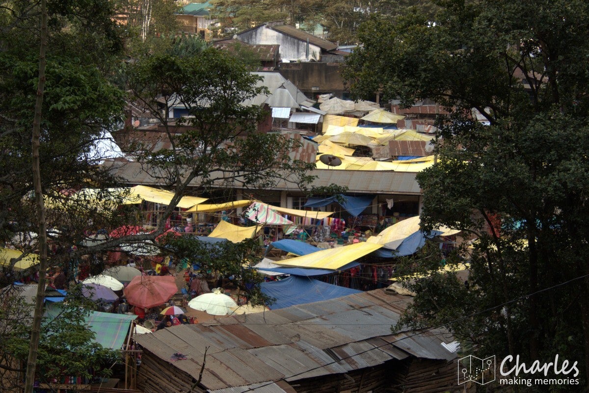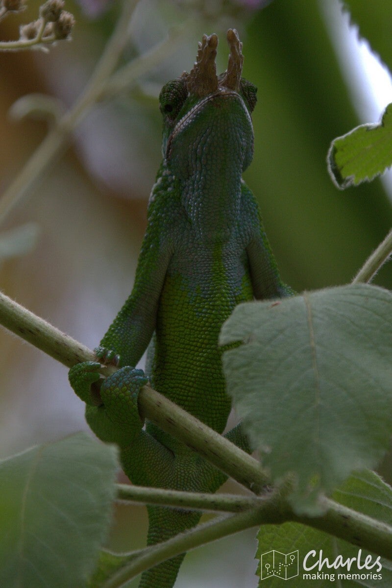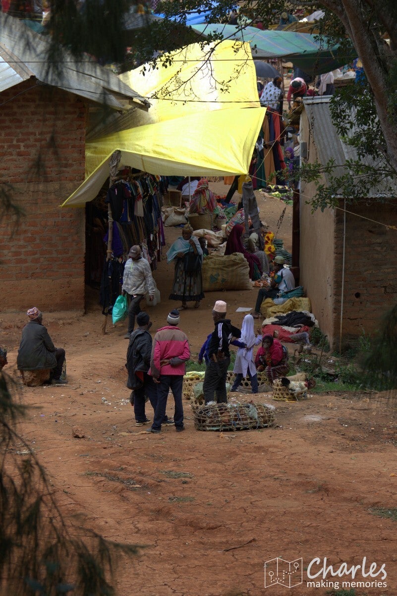 Omdat het vandaag marktdag is in Lushoto, nam hij ons eerst mee dwars door het centrum van het plaatsje. Beetje onwennig voor ons, want wij waren ingesteld op een wandeling door landelijk gebied en de natuur. Gelukkig was de route door de stad niet al te lang en we kunnen nu toch maar mooi zeggen dat we het centrale plein (meer een grasveld), de markt, het busstation en de katholieke kerk van Lushoto hebben gezien. Eenmaal buiten het centrum waren we ook heel snel in het meer landelijk gebied. Ergens een klein paadje in en we liepen in het groen en begonnen aan een gestage klim. Soms over een zandweg, soms een kortere route over een smal paadje of over een erf. Niemand leek zich druk te maken als je even over privéterrein ging om je weg weer te vervolgen. Even een vriendelijk 'jambo' en een klein gesprekje al lopend tussen gids en bewoner en alles was helemaal prima. Voor wat betreft de zoektocht naar kameleons: die was 300 meter buiten de stad al geslaagd en er zouden nog vele exemplaren volgen. Qua klimmen was het voor ons aanpoten, gelukkig was er alle tijd om een eigen tempo aan te houden. Tussendoor ook voldoende stops waarbij Nicolas van alles uitlegde over eerst de omgeving, de mensen en de vegetatie en later over het natuurgebied en alles wat er leeft.