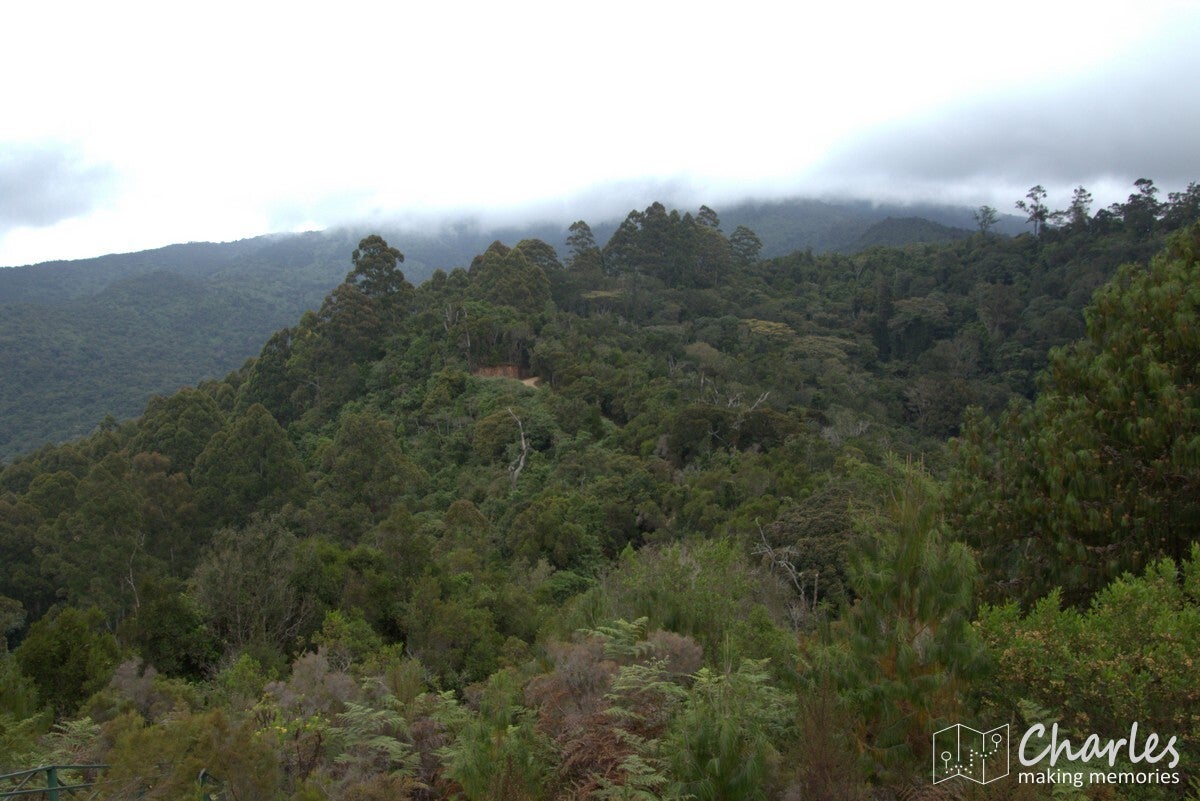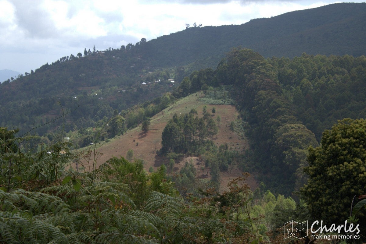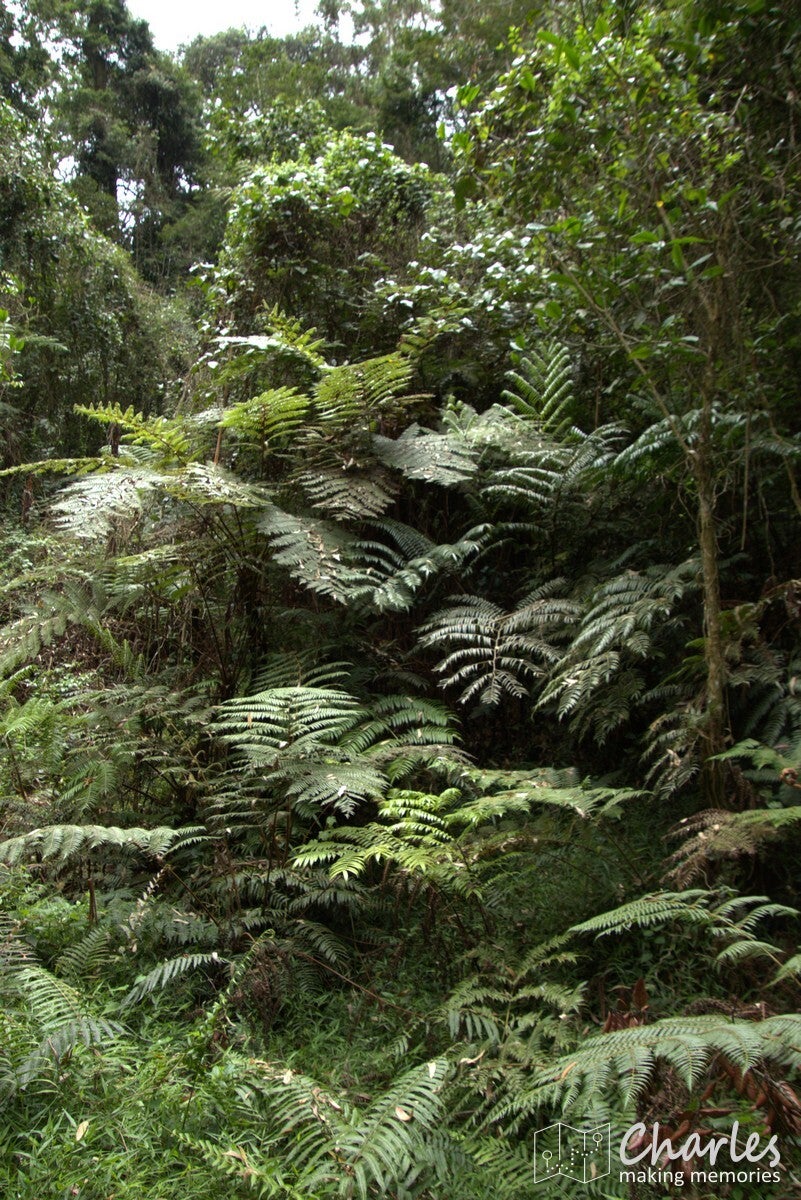 Na iets meer dan twee uur kwamen we aan bij de grens van Magamba. Een scherpe grens tussen bewoond gebied en het regenwoud, duidelijk dat achter de met een rij bomen aangegeven grens geen menselijk ingrijpen meer is toegestaan. Het regenwoud was indrukwekkend, met gigantisch hoge bomen. Niet vergelijkbaar met tropisch regenwoud, zoals we dat kennen van Azië en Zuid-Amerika, maar koeler en toch wat droger. Veel varens en mossen en zoals gezegd echte woudreuzen. Het klimmen werd in het bos in ieder geval intenser: veel modder en boomwortels en soms echt hele steile stukken. Bijna bovenop de heuvel kwamen we uit bij een oude Duitse schuilplaats (tijd van WW1), daarna nog een laatste stuk helling met treden op voordat we de top met de naam Kigulu Hakwewa hadden bereikt. We stonden nu op 1.840 meter hoogte en hadden een weids uitzicht over Lushoto en omgeving.