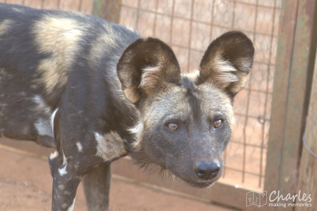 Heel wat krassen (van rondzwiepende takken) maar ook mooie ervaringen rijker stapten we weer over in de wagen van Ben. Toch wel blij dat hij met wat meer beleid rondrijdt. Na een korte rit kwamen we aan bij nog een sanctuary, namelijk voor de afrikaanse wilde hond. Hier geen gigantusch gebied, maar een klein omheind terrein. Zeven vrouwtjes en één mannetje moeten voor nageslacht gaan zorgen. Belangrijk voor de soort, want in het complete natuurgebied (inclusief het Keniaanse deel) loopt nog maar één roedel rond in het wild. Hopelijk wordt dit programma dus een succes. Voor nu was het wel even indrukwekkend om deze dieren van dichtbij te zien, maar hopelijk komt er toch ooit een dag om ze echt vrij te zien rondlopen.