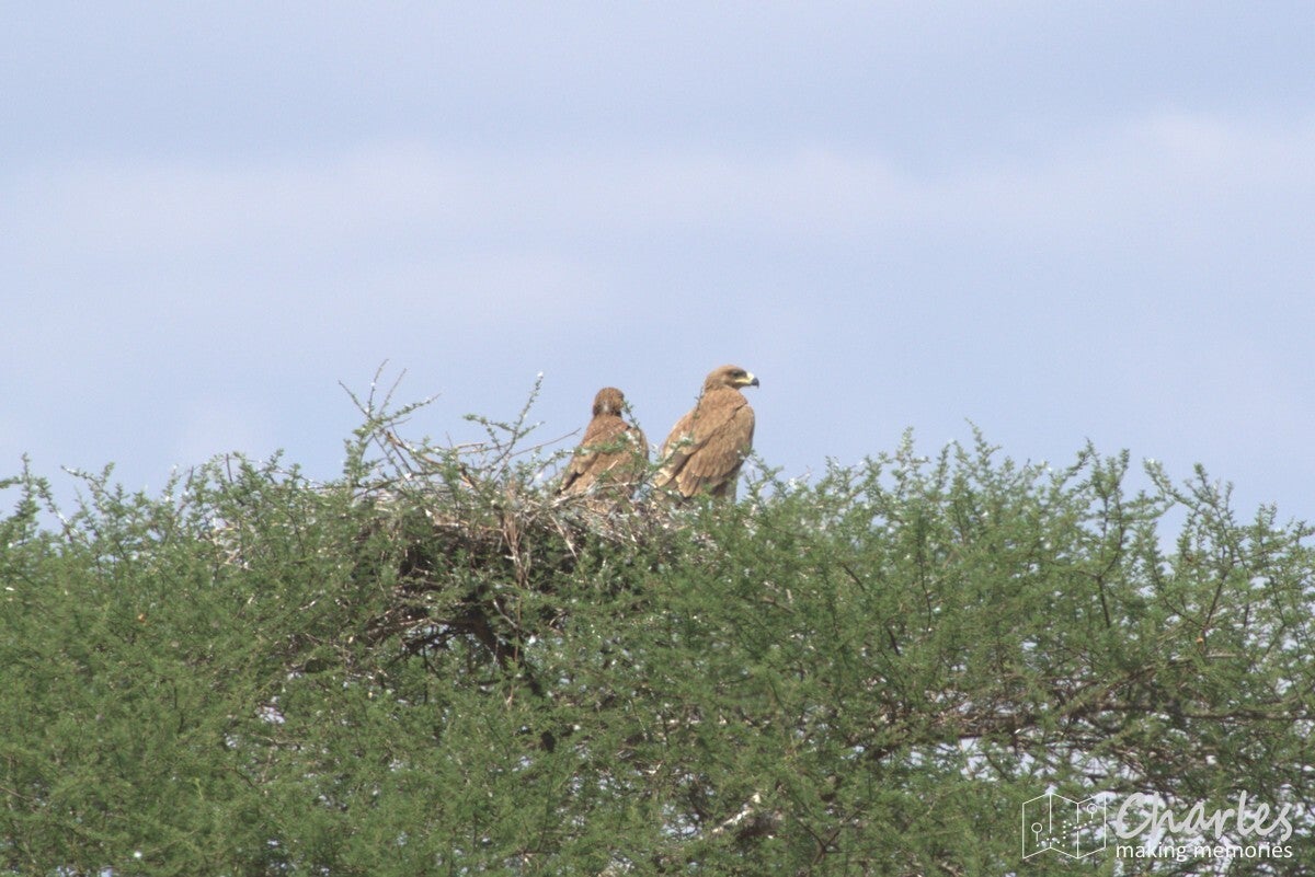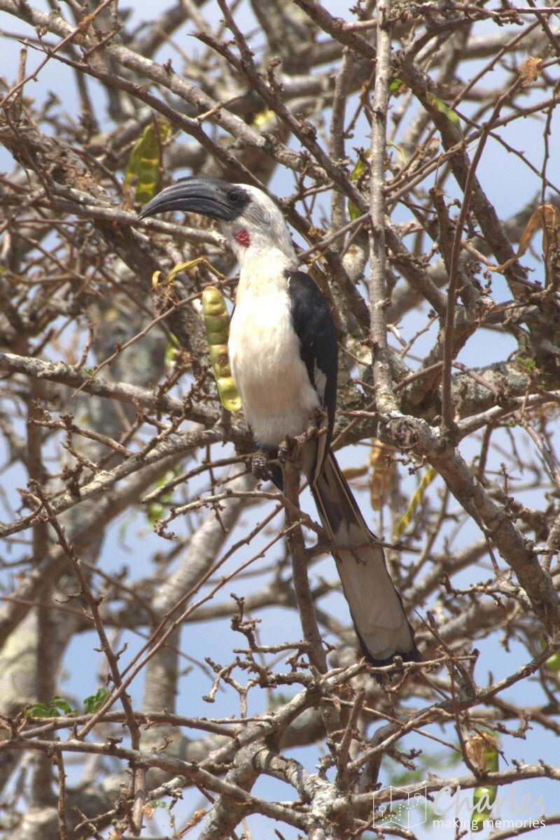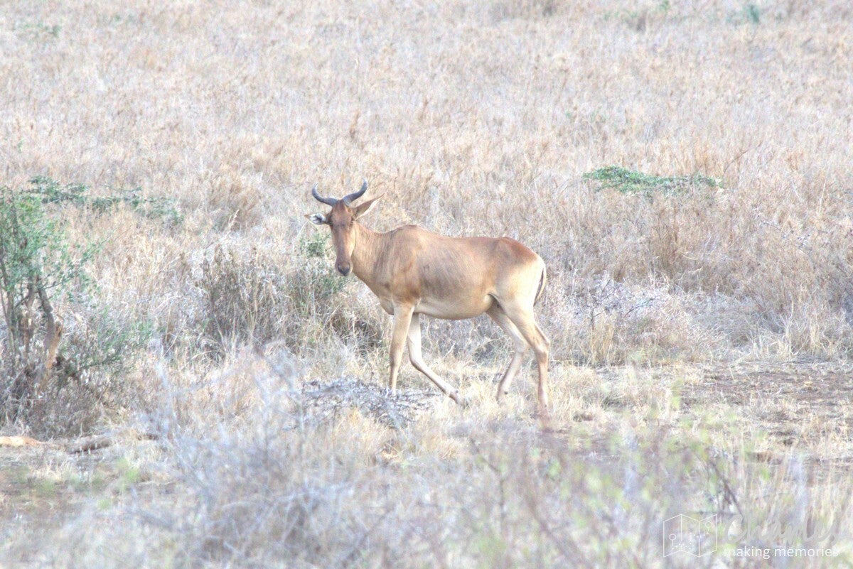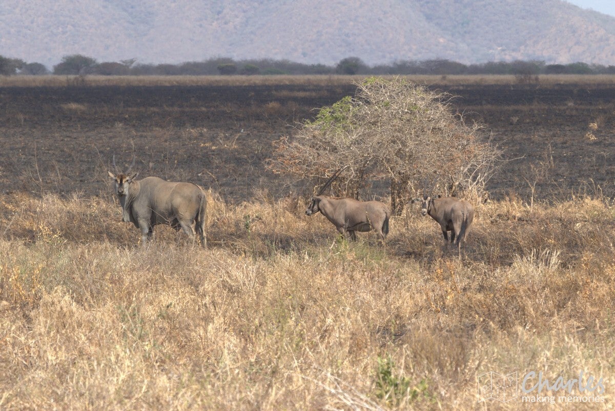 Eerst moet dan wel het entreegeld voor het park worden betaald en dat nam een flinke tijd aan administratieve handelingen in beslag. Niemand in de rij en het personeel gewoon aanwezig, maar toch 25 minuten voordat de poort voor ons open ging. Maar gelukkig hadden een aantal dieren netjes op ons gewacht (dat houden we onszelf maar voor), er was al snel genoeg te zien. Het eerste stuk gamedriven was maar een korte, want ons kamp lag slechts enkele kilometers van deze ingang van het park. Eerst even inchecken en de koffers op de kamer. Daarna een snelle lunch en gelijk weer op pad. We waren een beetje ongeduldig om weer wild te gaan spotten. Ook nu al weer snel de eerste dieren, vooral toen we op de meer open vlaktes kwamen. Giraffes worden vanwege de lange nek op deze vlaktes heel makkelijk gezien, maar ook de zebra's, elandantilopes en oryxen waren niet te missen. Later nog hartebeesten, struisvogels en een glimp van de grant's fazelle. De bingokaart liep dus lekker vol.