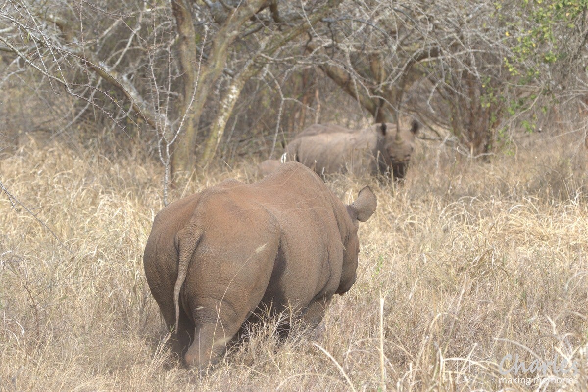 Na het eerste deel volgde een kort bezoek aan de weesneushoorn. Sinds ze drie maanden oud was, had ze geen moeder meer. De zorg is sindsdien overgenomen door twee parkwachters. De inmiddels vijfjarige neushoorn is dus totaal gewend aan mensen en vind het heerlijk om tegen de jeep aan te schuren. Geen idee of zij ooit nog het wild in zou kunnen, misschien leert ze wel weer neushoorngedrag als ze oud genoeg is om bij andere neushoorns te worden geïntroduceerd. In het derde deel van het gebied zagen we dat het terrein toch echt best groot is. Twintig minuten rondrijden en geen spoor gevonden. Wel veel andere dieren, die hier ook gewoon wonen om een zo natuurlijk mogelijke situatie na te bootsen. Alle dieren behalve olifanten, want zij zouden te veel concurreren om het aanwezige voedsel. Terug in het eerste gebied weer dezelfde neushoorns gezien (er liep daar ook een ranger, dat verklaart wel wat), waardoor er weer een wilde rit volgde achter deze dieren aan. Er werden zelfs struiken omver gereden.