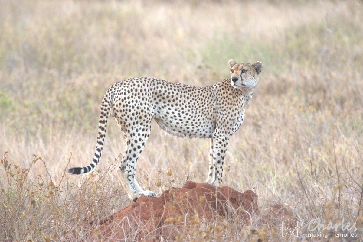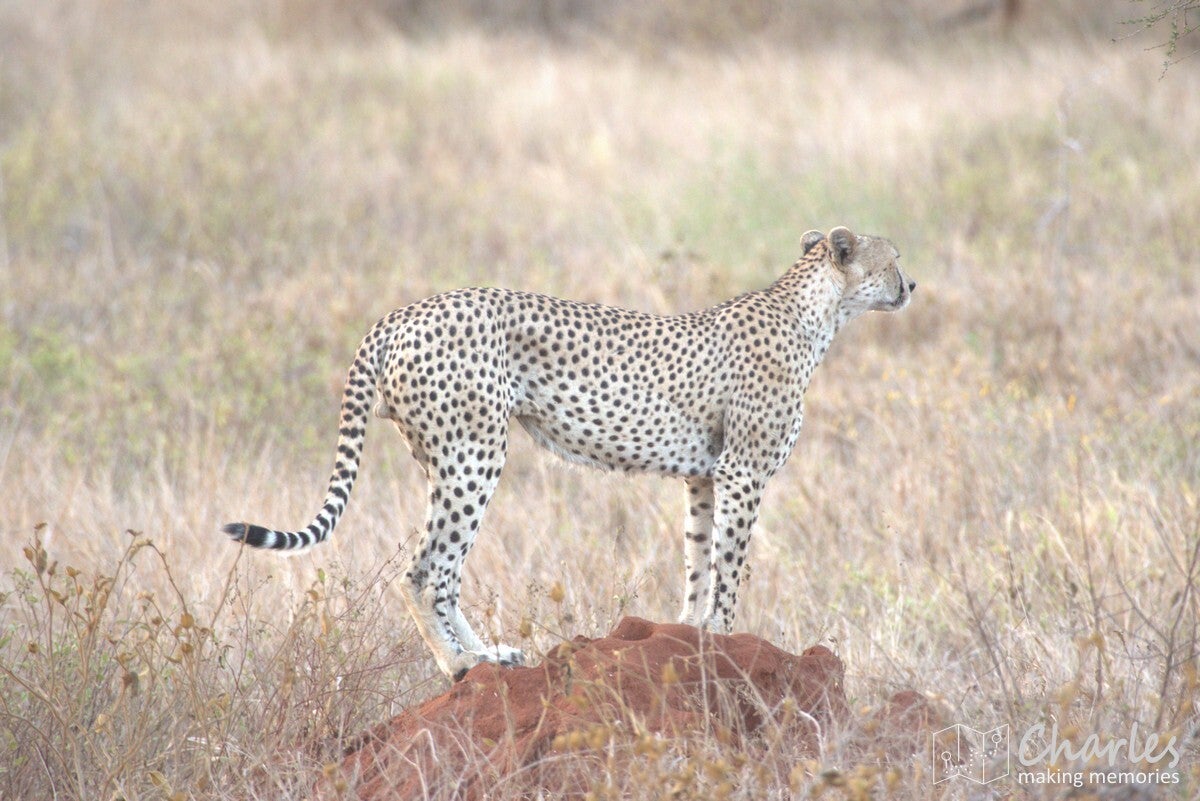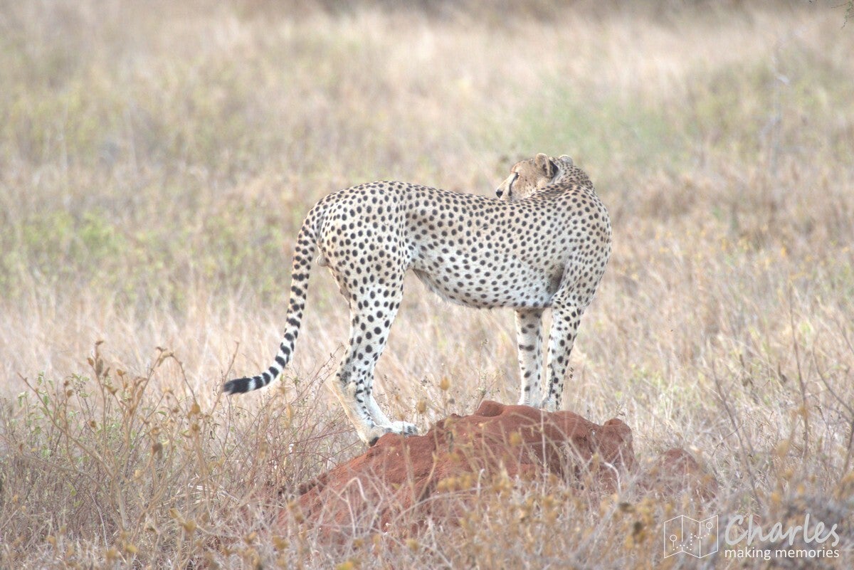 Inmiddels was het laat in de middag, tijd om weer richting lodge te gaan rijden. Uiteraard op slakkentempo, want juist in dit laatste uur voor zonsondergang is de kans het grootst om mooie dieren te zien. En dat hebben we geweten. Inderdaad veel verschillende dieren, maar toch één extra bijzondere: een cheetah. Ben had aan het begin van de reis nog gezegd dat we nergens een cheetah zouden gaan zien, daarvoor zouden we naar de Serengeti of Ngorogoro krater moeten gaan. Hij was dus zelf nog het meest verbaasd dat hij ineens in de struiken naast de weg een cheetah zag. Het dier was net zo verbaasd om ons te zien en ging er dus snel vandoor. We konden echter makkelijk volgen waar hij heen ging, dus parallel volgden wij de weg. Op een gegeven moment liep hij een termietenheuvel op om de omgeving te overzien. Voor ons een echt wauw-moment. Ook na dit gigantische mazzelmoment (van de mensen die er werkten had nog niemand ooit een cheetah in dit park gezien) was er nog steeds veel te zien, al werd het steeds donkerder. Op een gegeven moment dus maar gewoon doorrijden, het eten stond al ongeveer klaar.