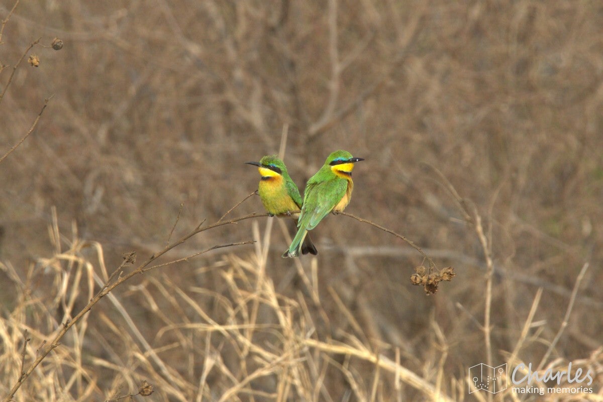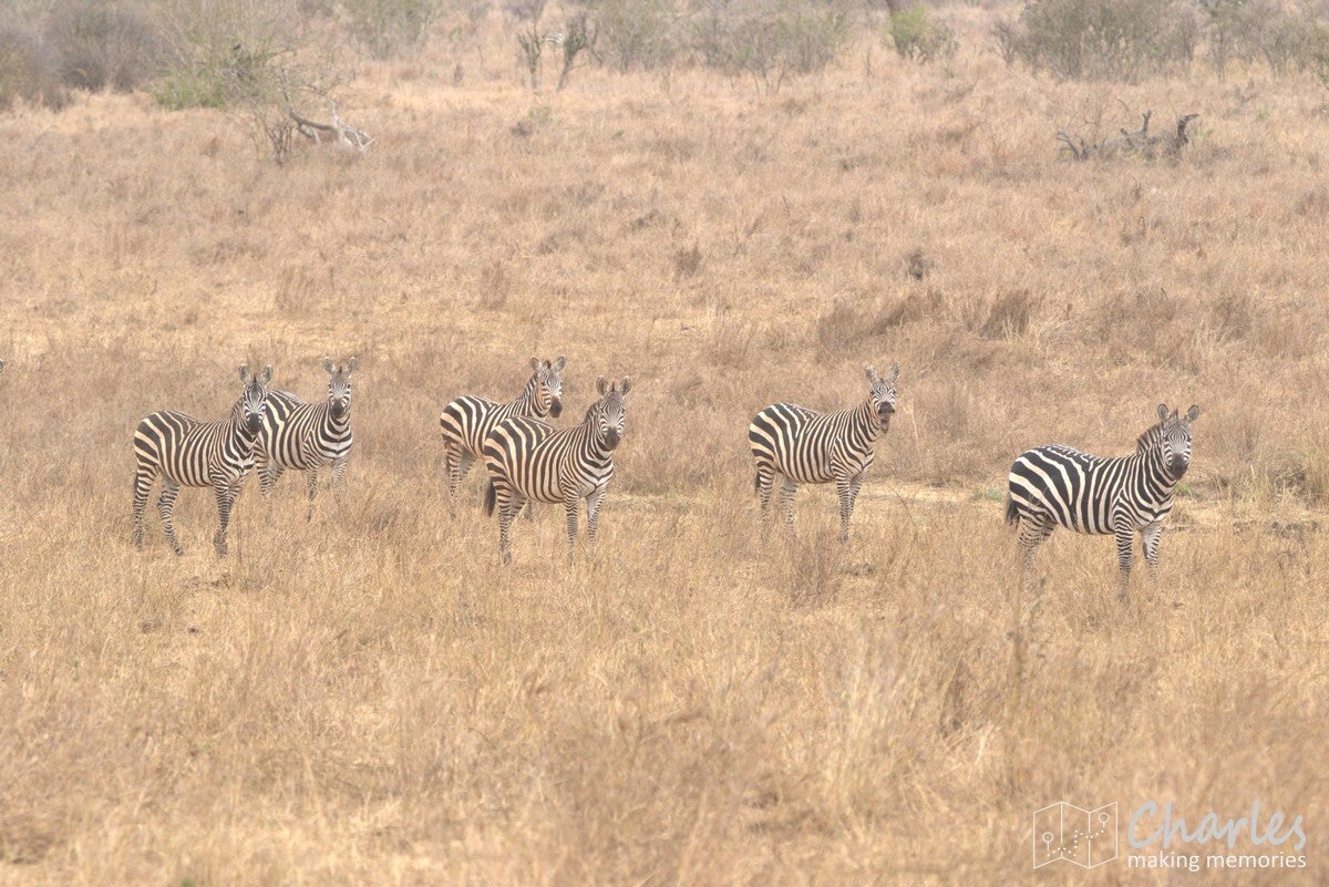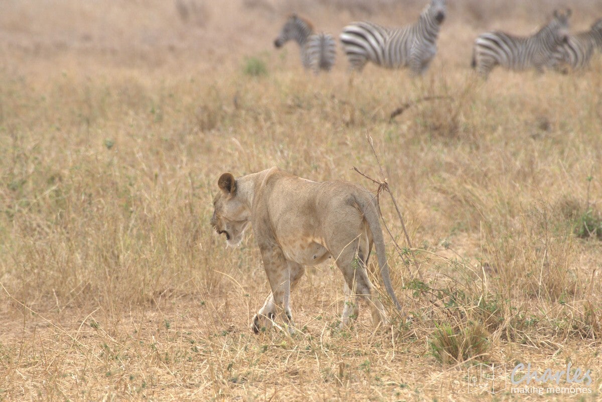 De grote kudde zebra's was in twee delen gesplitst en ze waren flink naar elkaar aan het roepen. Daartussen zag Ben een aantal leeuwen in beweging in en rond een droge rivierbedding. Een deel van de zebra's was al voorbij aan de leeuwen, anderen nog niet. Een soort patstelling dus. Ernaar toe rijden was geen optie, want we zouden de schichtige leeuwen wegjagen. Dan dus maar naar halverwege een helling om het hele tafereel van een afstandje en van boven te aanschouwen. Eenmaal positie ingenomen op.zoek naar in ieder geval één leeuw, zodat je in de gaten hebt wanneer ze in beweging komen. Toen dat was gelukt, begon het wachten. De zebra's zochten een veilige route, de leeuwen lagen rustig te loeren. Dat duurde een flinke poos en dat gaf ons een probleem: we moesten onderhand wel op pad om op tijd uit het park te zijn. Het 48 uurs-ticket liep bijna af. Uiteindelijk toch maar de keuze om er vandoor te gaan en daarmee het hele tafereel te verstoren. Dat gebeurde dus ook, toen we aan kwamen rijden verliet in ieder geval één leeuw de stellingen. De zebra's hadden deze leeuwin gelijk weer in de gaten, het spel kon weer opnieuw beginnen.