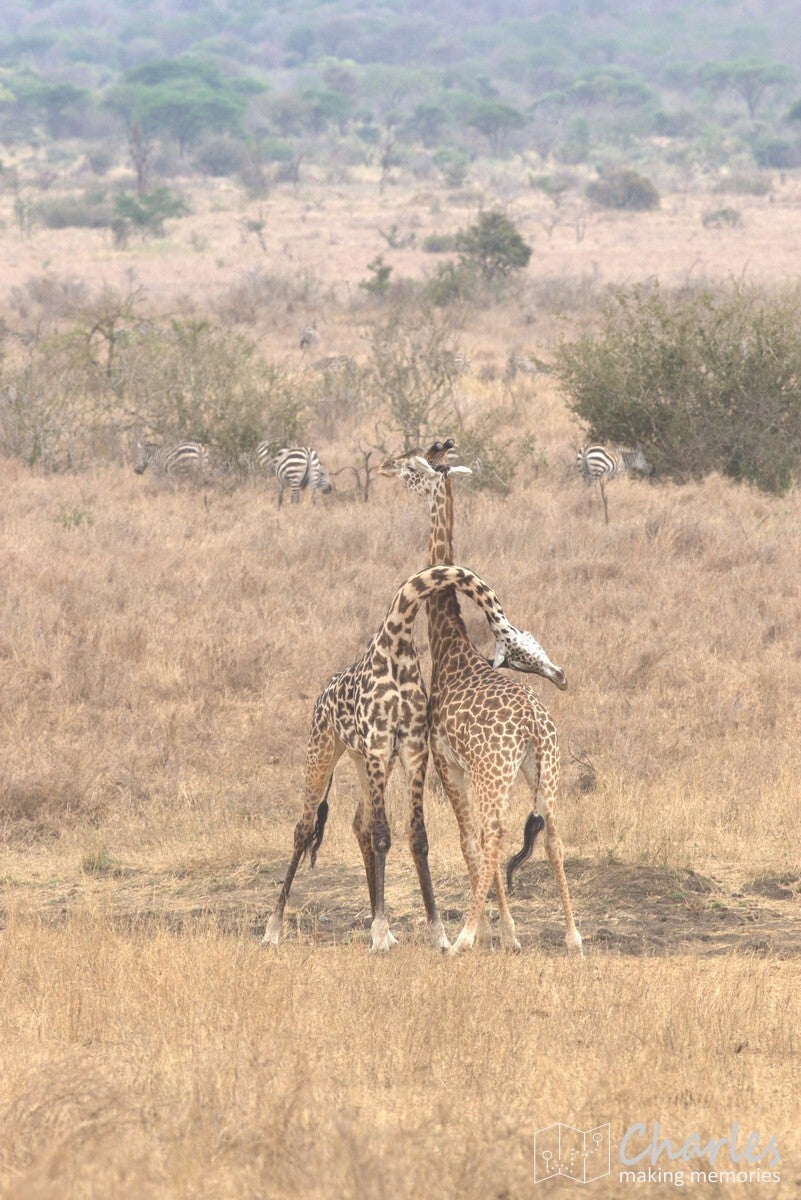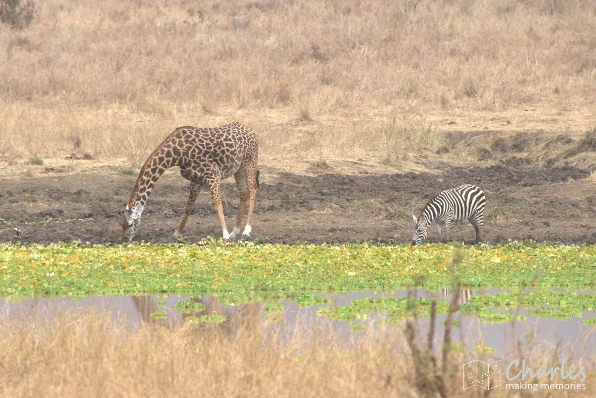 Vandaag weer net als gisteren richting de dam. Via de portofoon leek een bericht van een andere gids te komen dat er iets bijzonders te vinden moest zijn vlakbij de dam. Tempo dus iets omhoog, maar Ben leek niet te vinden waar hij naar op zoek was. Dan dus maar door en over de vlakte op zoek naar ander moois. En dat was er zoals gezegd genoeg. Bijna alle dieren die we eerder hadden gezien kwamen wel weer voorbij. Uiteindelijk kwamen we uit bij het meer, waar vooral een grote groep giraffes de aandacht trok. Heel bijzonder om te zien hoe deze dieren door de poten zakken om te kunnen drinken. Na nog een rondje om het meer besloten we een poos stil te gaan staan en gewoon af te wachten welke dieren voorbij zouden komen. Na een tijdje kwam een flinke kudde impala's op korte afstand voorbij en waren ook de giraffe's flink dichterbij gekomen. In de verte was een gigantische kudde zebra's gemixt met elandantilopes bij het meer gaan drinken. Toen zij weer weg waren gelopen, gingen wij ook weer verder. En dat bleek een gouden timing.