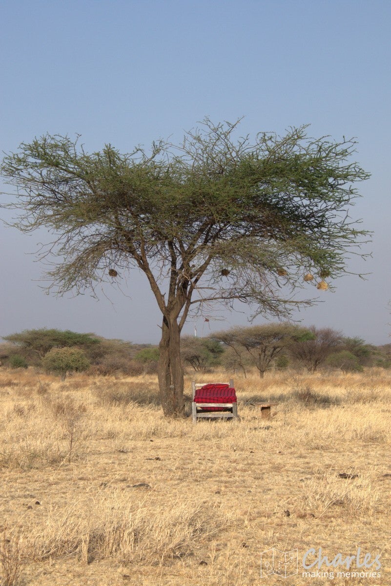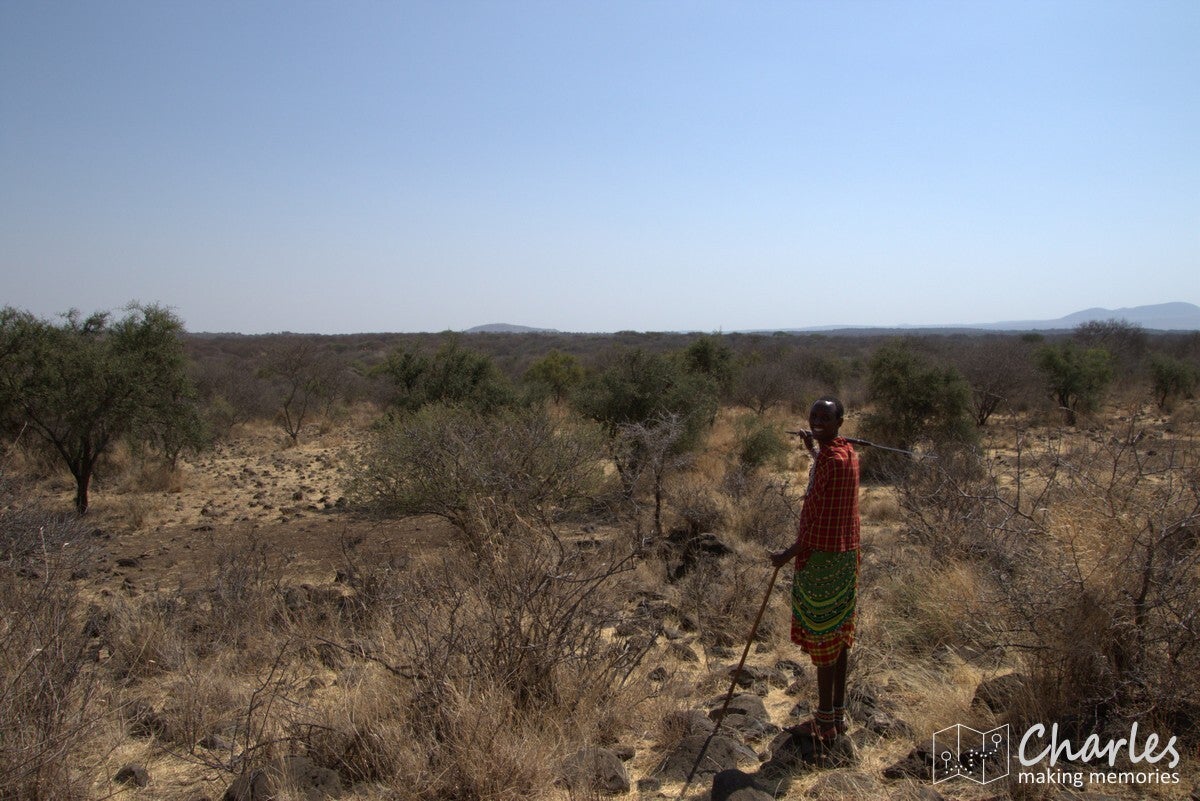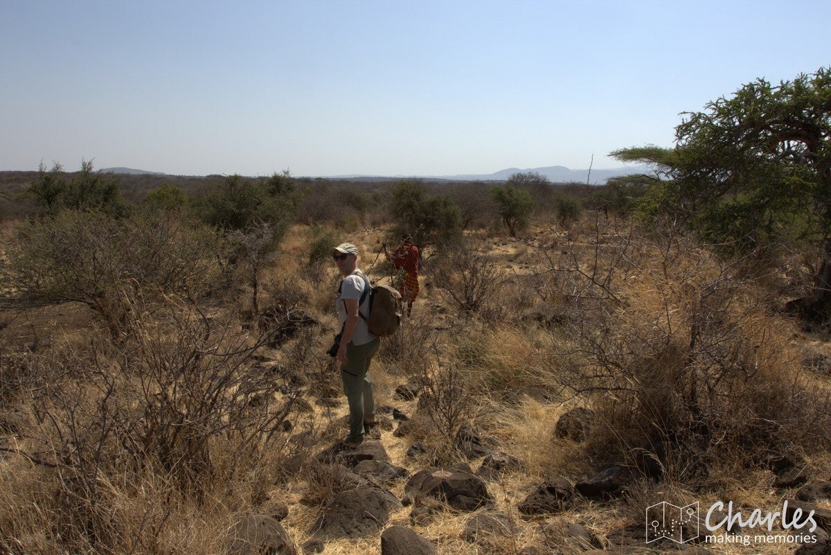 Ons verblijf is behalve leerzaam en leuk dus ook nog eens nuttig. Fijn om een klein steentje te kunnen bijdragen. Vanmiddag stond voor ons ook een bezoek aan de school op het programma, maar eerst in de ochtend nog een zogenaamde bushwalk. Onder begeleiding van een maasaikrijger een wandeling door de wildernis. Normaliter een garantie om geen wild te zien (want wij toeristen stampen te luid rond), maar in dit geval leek het ons toch leuk vanwege de uitleg die we zouden krijgen over de planten en het gebruik hiervan door de Maasai. Onze verwachtingen kwamen helemaal uit. De 'wildscore' was een wandelende tak, een schildpad en drie vogelsoorten, maar het plantendeel en culturele deel was leuk en leerzaam. En daarnaast altijd toch de spanning of je geen enge of gevaarlijke dieren tegenkomt. Verder ook goed uitkijken waar je loopt, het is een continue doornstruiken-, stenen- en poepslalom. Qua planten veel bijzondere gebruiken, vooral die van de olifantenpoep waren bijzonder te noemen. Heb je hoofdpijn? Steek olifantenpoep in de fik en gebruik het om boven te stomen. Ik ga het maar niet proberen. Verder is het leuk om een droge olifantendrol te gebruiken als voetbal. Niet dat we er beter van gingen voetballen, maar best grappig om een 'balletje' te trappen op de savanne. Misschien als ik thuis ben mijn schoenen maar eens wassen. De medicinale gebruiken waren uiteraard veel serieuzer, vooral de verschillende soorten acacia's kennen veel gebruiken. Na ruim twee uur rondwandelen in de hitte was het fijn om toch weer terug te komen bij de lodge en even in de schaduw wat te drinken en relaxen. Dat was goed uit te houden tot aan de lunch.