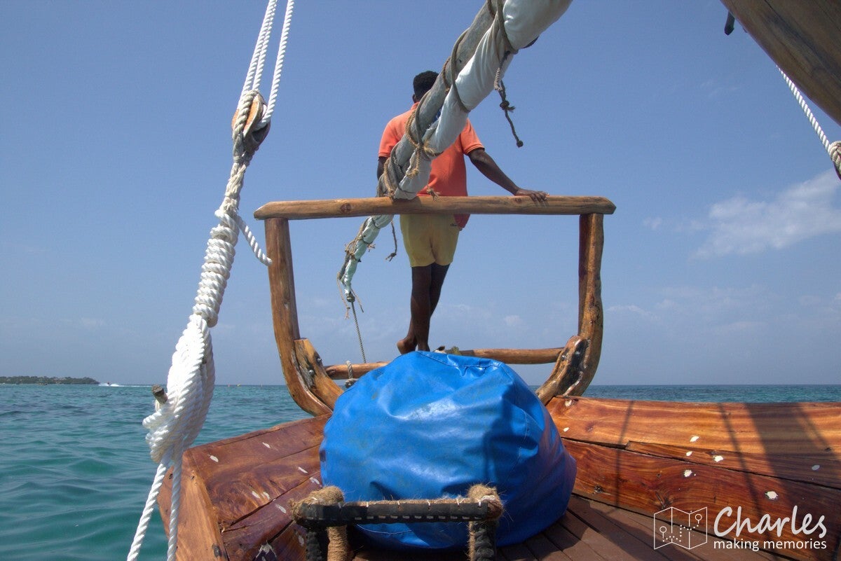 Rond een uur of half drie konden we terug naar het vasteland. Er was bedacht om te gaan zeilen en daar houdt men zich dan ook aan. Dat de wind was aangetrokken en daarmee ook de golven flink waren, was geen reden om dit plan om te gooien. Het werd dan ook een vervelende terugreis. Iedereen zeiknat vanwege de golven die binnenboord sloegen, een onprettige deining omdat de koers met de golven in de zij was en zelfs sommige passagiers in doodsangst. Waarom zou je ook rekening houden met je passagiers? Plan is plan, gezeild moet er worden. Voor mij een beetje een flashback naar een boottocht in Mozambique jaren geleden, misschien zijn boottochten in Oost-Afrika gewoon geen goed idee. Uiteindelijk waren we na een onplezierige tocht weer terug bij de kust, maar daar ontstond het volgende probleem. Het was nu hoog water, dus het strand was onder water verdwenen. Er was nog wel een zandstrook, maar dan moest je vervolgens tussen de rotsen naar de trap. Dat werd dus een zeiknatte landing, zo blij dat we een waterdichte zak hadden voor de waardevolle spullen.