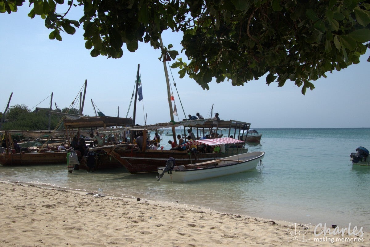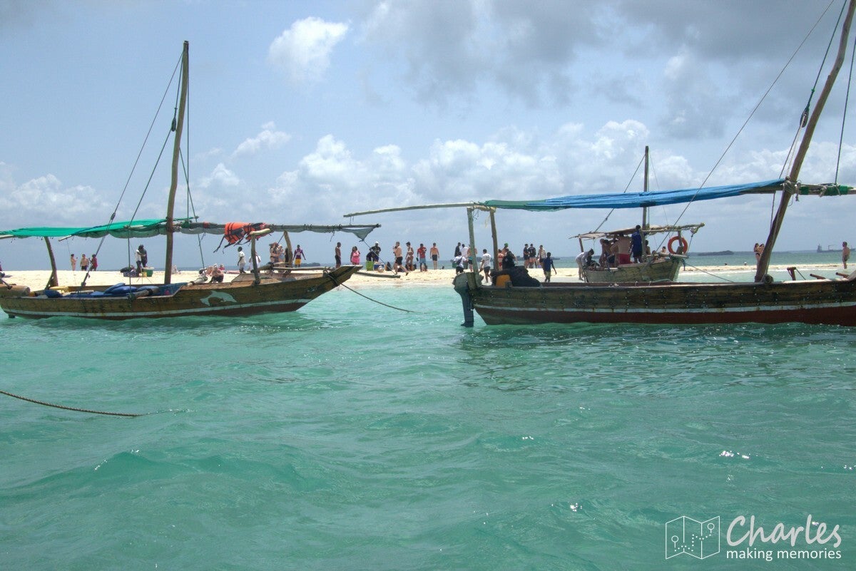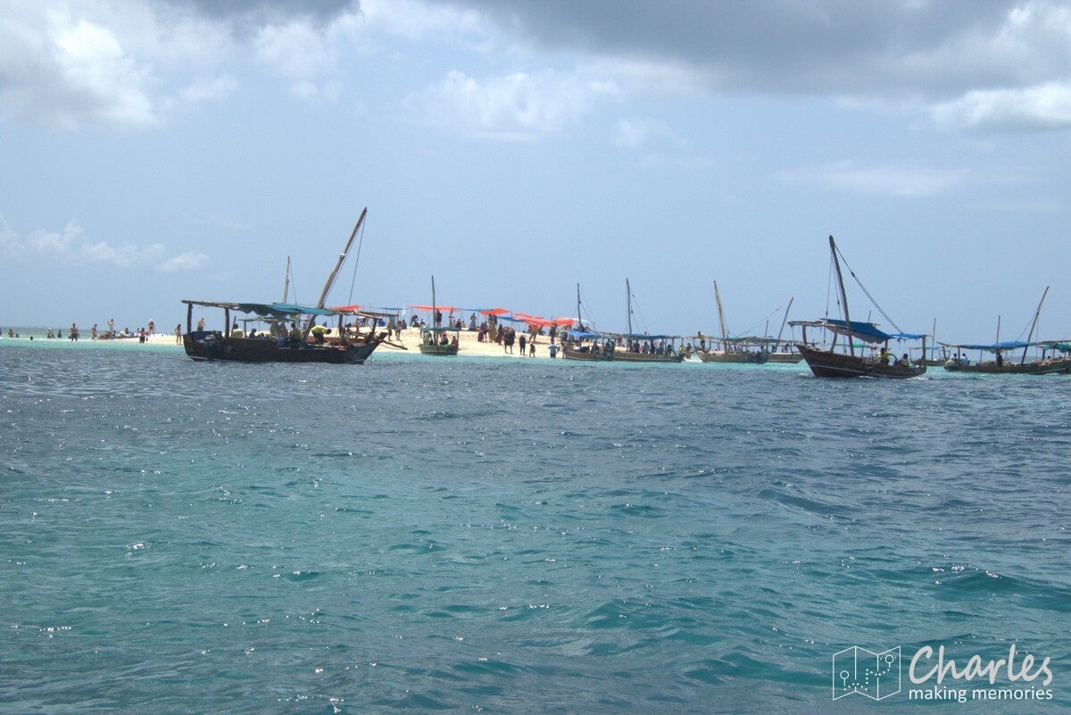 De boot was een typische afrikaanse houten zeilboot, maar wel ook met motor. De heenrit was met de motor, dus al snel kwam de eerste bestemming in beeld: een zandbank. Eerder nog omschreven als een 'stunning sandbank', maar in de praktijk verstopt achter alle boten die lagen aangemeerd en onder de drommen mensen die er rondliepen. Een bezoek aan deze zandbank moest nog even wachten, eerst gingen we een uurtje snorkelen vlakbij. Binnen een met boeien gemarkeerd gebied werd een plekje gezocht, ook daar was het best dringen geblazen met de boten. Uitrusting aan en plonzen maar, eens kijken wat er onder water te zien was. Misschien zijn wij verwend, maar het was niet bijster interessant. We hebben inderdaad wel wat vissen gezien, maar er was weinig koraal. Dat moet volgens de verhalen toch wel beter kunnen in de wateren rond Zanzibar. Wat er wel veel zat, waren kleine kwalletjes. En daar zaten we dan weer net niet op te wachten. Binnen de kortste keren overal prikjes en jeuk, ik hield het daardoor zelf al snel voor gezien en klom weer terug op de boot. Sommigen hielden het wel langer vol en zochten ook wat verderop, waardoor ze nog best wat gezien hebben.