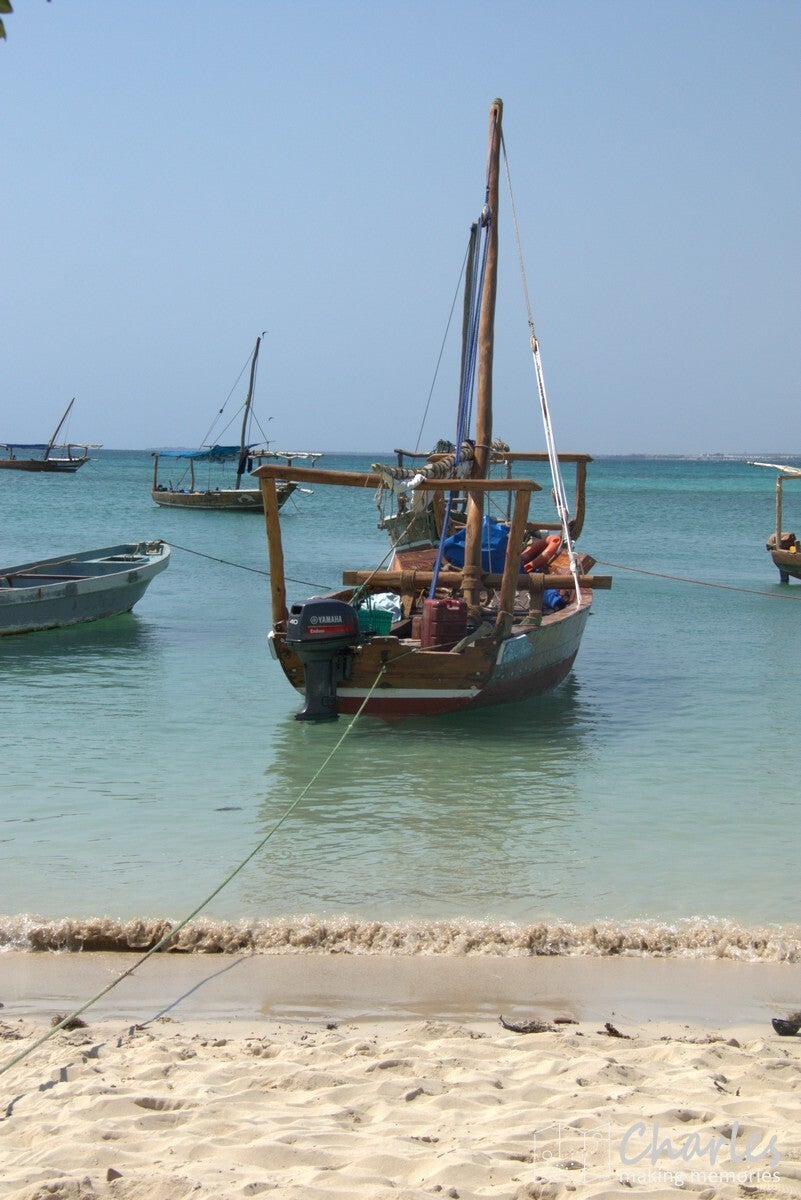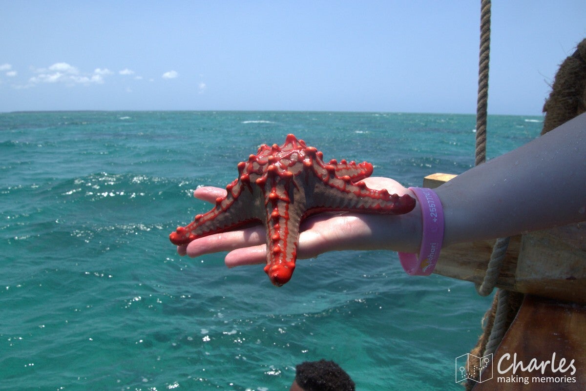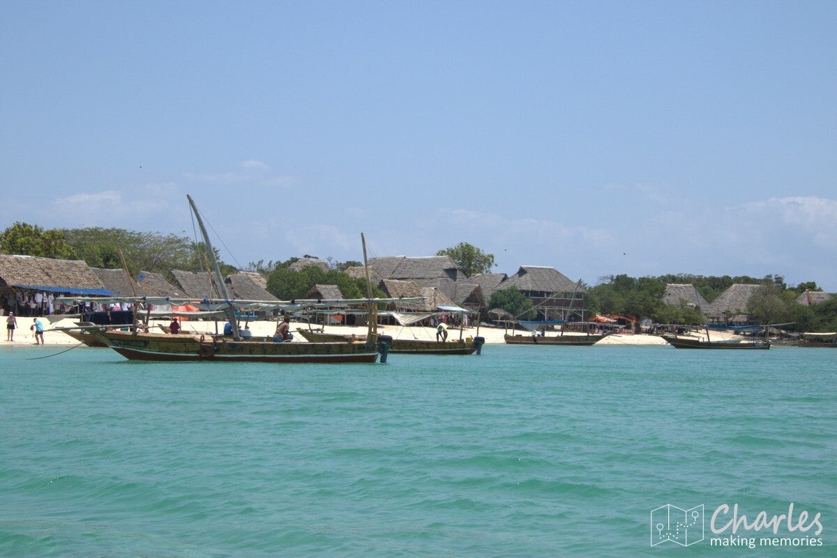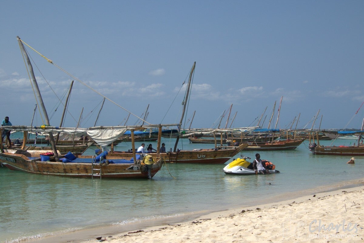 De boot was een typische afrikaanse houten zeilboot, maar wel ook met motor. De heenrit was met de motor, dus al snel kwam de eerste bestemming in beeld: een zandbank. Eerder nog omschreven als een 'stunning sandbank', maar in de praktijk verstopt achter alle boten die lagen aangemeerd en onder de drommen mensen die er rondliepen. Een bezoek aan deze zandbank moest nog even wachten, eerst gingen we een uurtje snorkelen vlakbij. Binnen een met boeien gemarkeerd gebied werd een plekje gezocht, ook daar was het best dringen geblazen met de boten. Uitrusting aan en plonzen maar, eens kijken wat er onder water te zien was. Misschien zijn wij verwend, maar het was niet bijster interessant. We hebben inderdaad wel wat vissen gezien, maar er was weinig koraal. Dat moet volgens de verhalen toch wel beter kunnen in de wateren rond Zanzibar. Wat er wel veel zat, waren kleine kwalletjes. En daar zaten we dan weer net niet op te wachten. Binnen de kortste keren overal prikjes en jeuk, ik hield het daardoor zelf al snel voor gezien en klom weer terug op de boot. Sommigen hielden het wel langer vol en zochten ook wat verderop, waardoor ze nog best wat gezien hebben.
