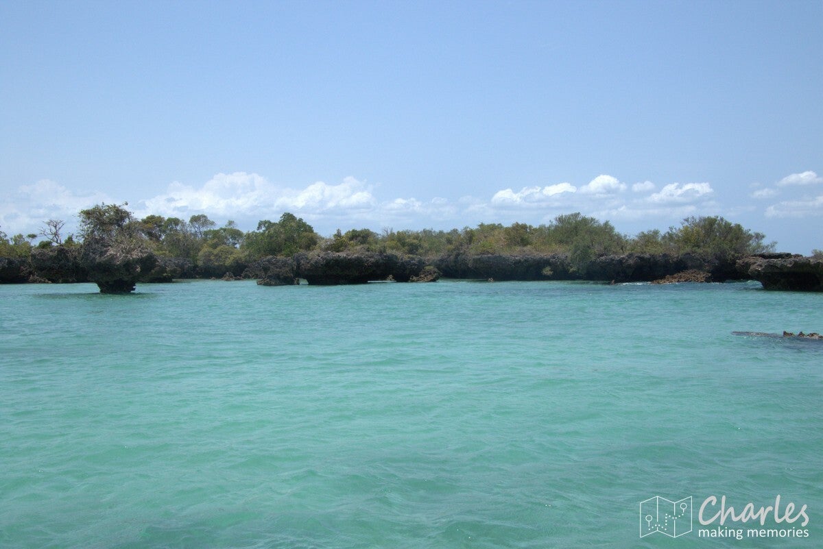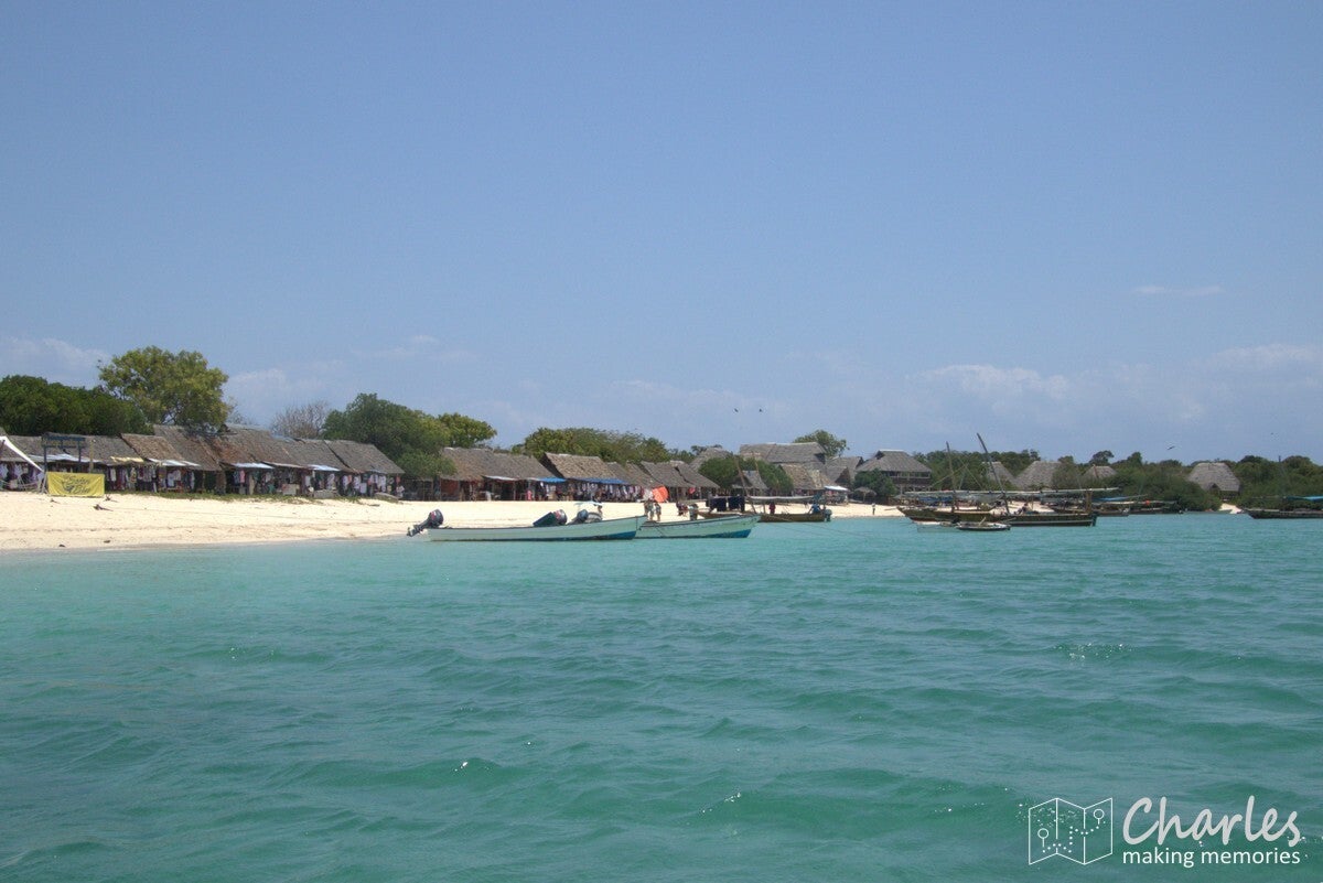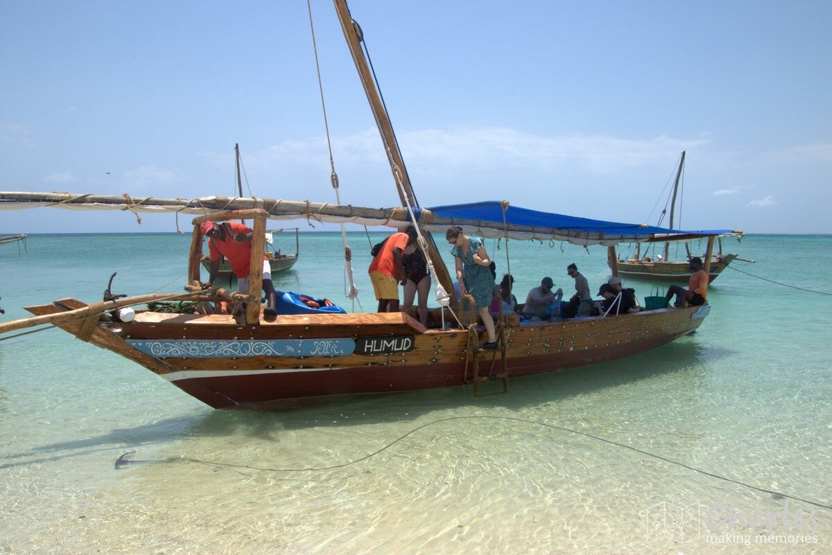 Vertrek was op tijd, dus er moest een wekker worden gezet. Bij het opstaan bleek het mooi weer te zijn en (nog belangrijker) was de zee heerlijk kalm. Wel zo fijn als je op die zelfde zee wil gaan varen. Om 8 uur werden we opgehaald door een chauffeur. Privévervoer, dus lekker alle ruimte in de auto en op de achterbank de tijd om nog even echt wakker te worden. Ondanks dat de boottocht aan de zuidwestkant zou gaan plaatsvinden en onze lodge aan de zuidoostkant ligt, was het nog best ver rijden. Schijnbaar geen goede wegen langs de kust, want we moesten eerst tot bijna Zanzibar-stad om daarna pas via de westkust naar beneden te rijden. Al met al een uur en een kwartier voordat we ergens langs de kust stopten. Daar waren een paar overkappingen gemaakt, zodat we in de schaduw konden wachten. Gelijk maar van de gelegenheid gebruik maken om goed te smeren met zonnebrand, het zou op en in het water wel nodig zijn. In de tussentijd arriveerden de bemanning van de boot en overige passagiers. Terwijl ergens beneden aan het strand de boot werd geladen, konden wij flippers passen en uitkiezen. Vervolgens ook de trap af en via het strand door het water om in te stappen. Er waren ook een paar afrikaanse dames bij onze groep, die keken al moeilijk bij deze manier van instappen. Waarschijnlijk hadden ze vooral een Instagramtrip bedacht met mooie foto's en niet nagedacht over de wat meer avontuurlijke onderdelen van de trip.
