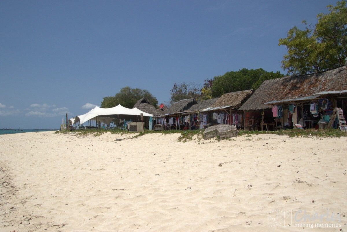 Vijfde en laatste stop was Kwale Island. Dat zou best een mooi eiland kunnen zijn met zijn tropische begroeiing en witte stranden, ware het niet dat het helemaal was volgebouwd met souvenirshops en restaurants. Iedere touroperator heeft zijn eigen gebouwde overkapping waar gasten kunnen zitten en waar het eten wordt bereid. De 'fresh seafood lunch' werd daar geserveerd. Smaakte prima met een gevarieerd aanbod aan eten. Daarna was het wachten tot iedereen klaar was en het personeel ook alles had opgeruimd. Gelukkig vonden we twee bedjes onder een parasol, het souvenir shoppen lieten we maar aan anderen over.