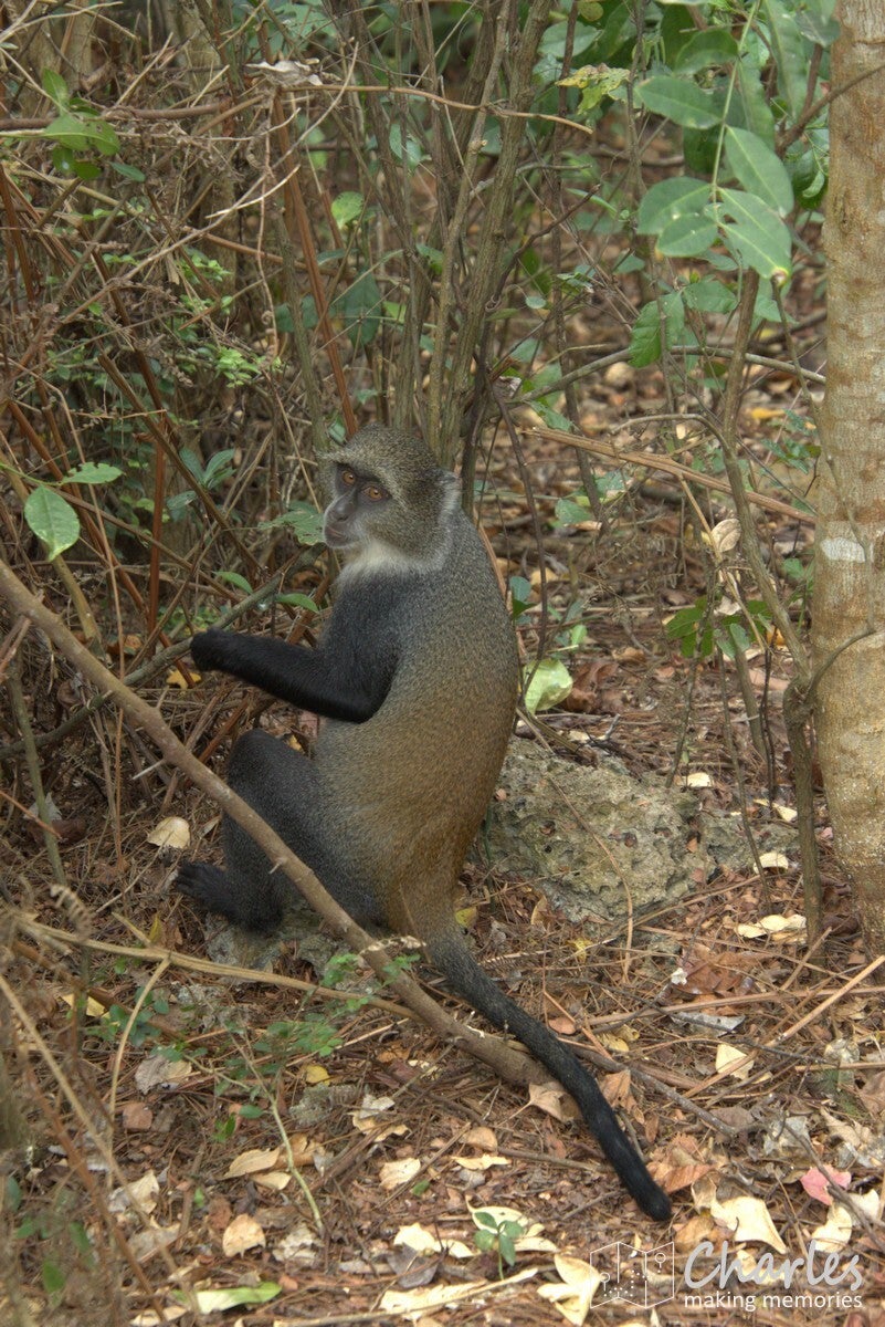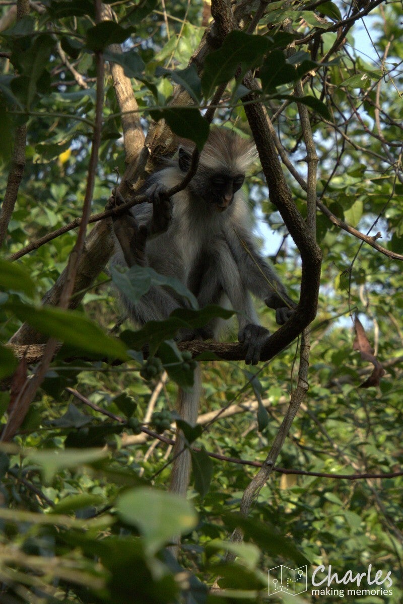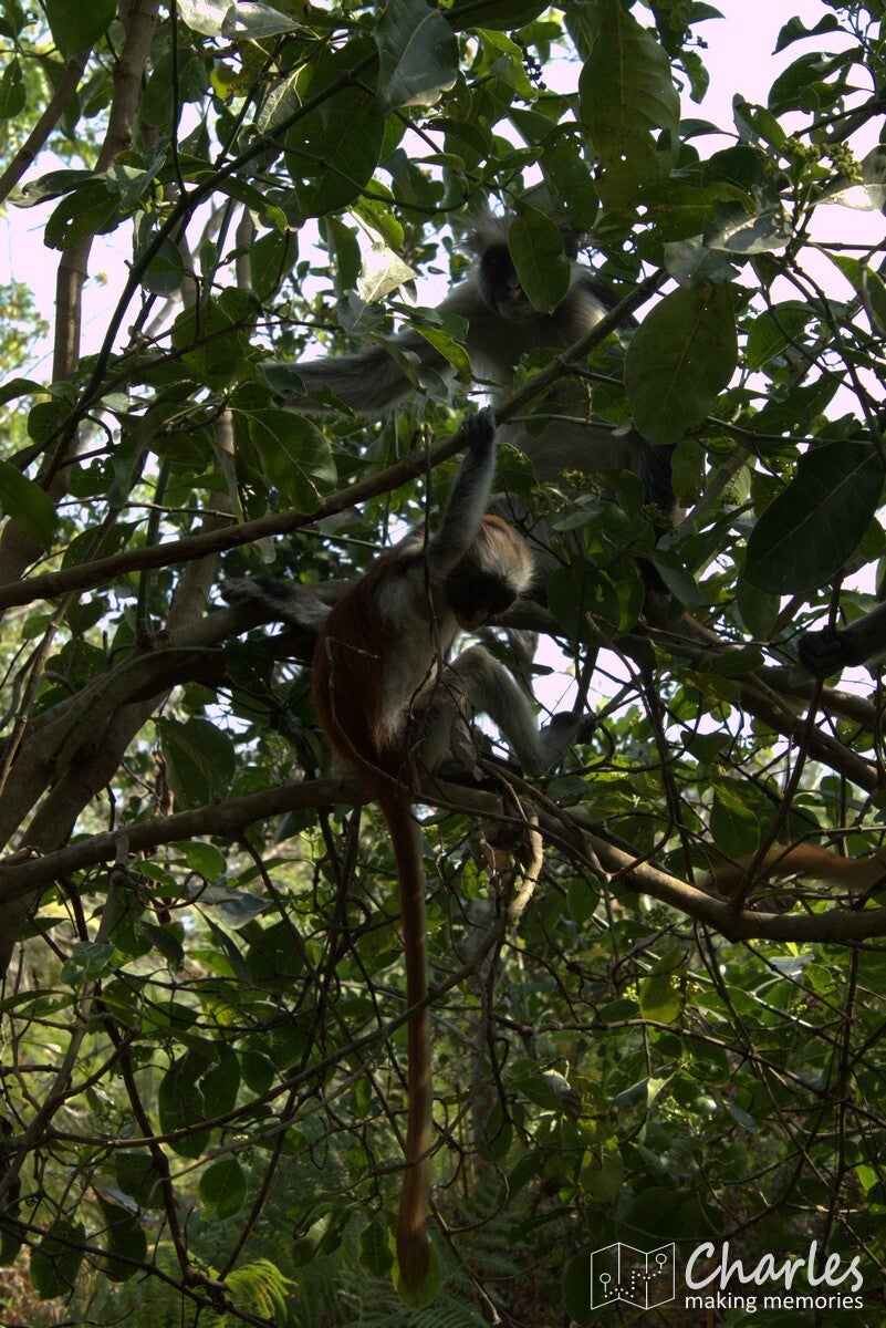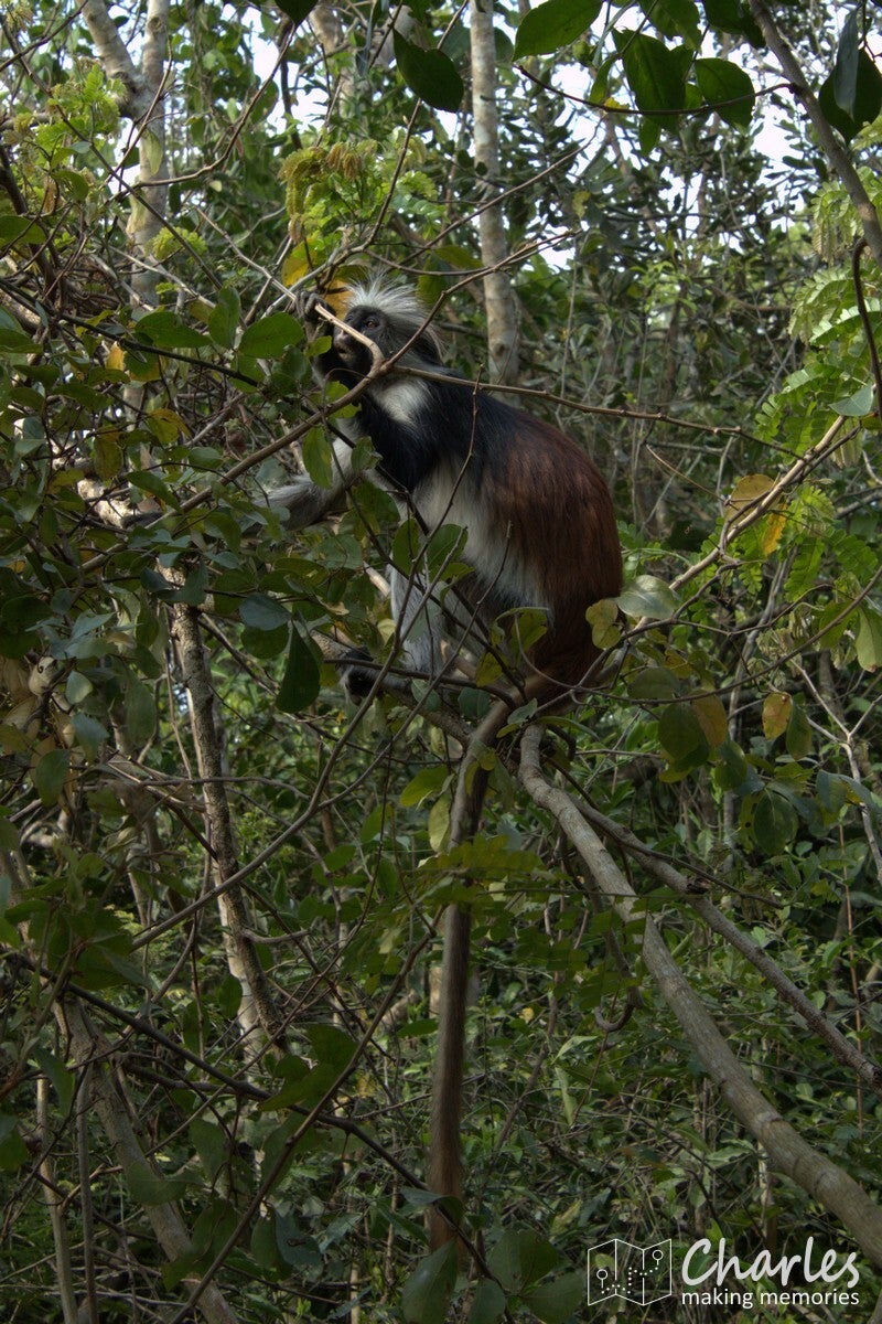 Vanaf de ingang steken we met de auto de weg over en rijden daar een aantal honderden meters over een zandpad. Op grond van waar andere auto's staan geparkeerd, wordt ingeschat waar zich een grote groep apen bevindt. Vanaf hier gaan we het bos in. Totaal niet vergelijkbaar met het eerdere bos, de bomen zijn hier laag en het is vooral veel struikgewas. Al snel zien we eerst nog een paar diadeemmeerkatten, maar daarna een aap met een opvallend rode rug, de Zanzibarrodefranjeaap. Eenmaal dichtbij deze aap zien we er steeds meer. Ze zijn als groep in beweging en de ene na de andere komt langs. Of ze springen via de takken van de bomen over je heen, of ze lopen gewoon vlak langs je benen alsof je niet bestaat. Een mooi schouwspel van heel mooie apen met karakteristieke gezichten. Na een minuut of tien is de hele groep wel gepasseerd, het is voor ons ook weer tijd om te gaan.