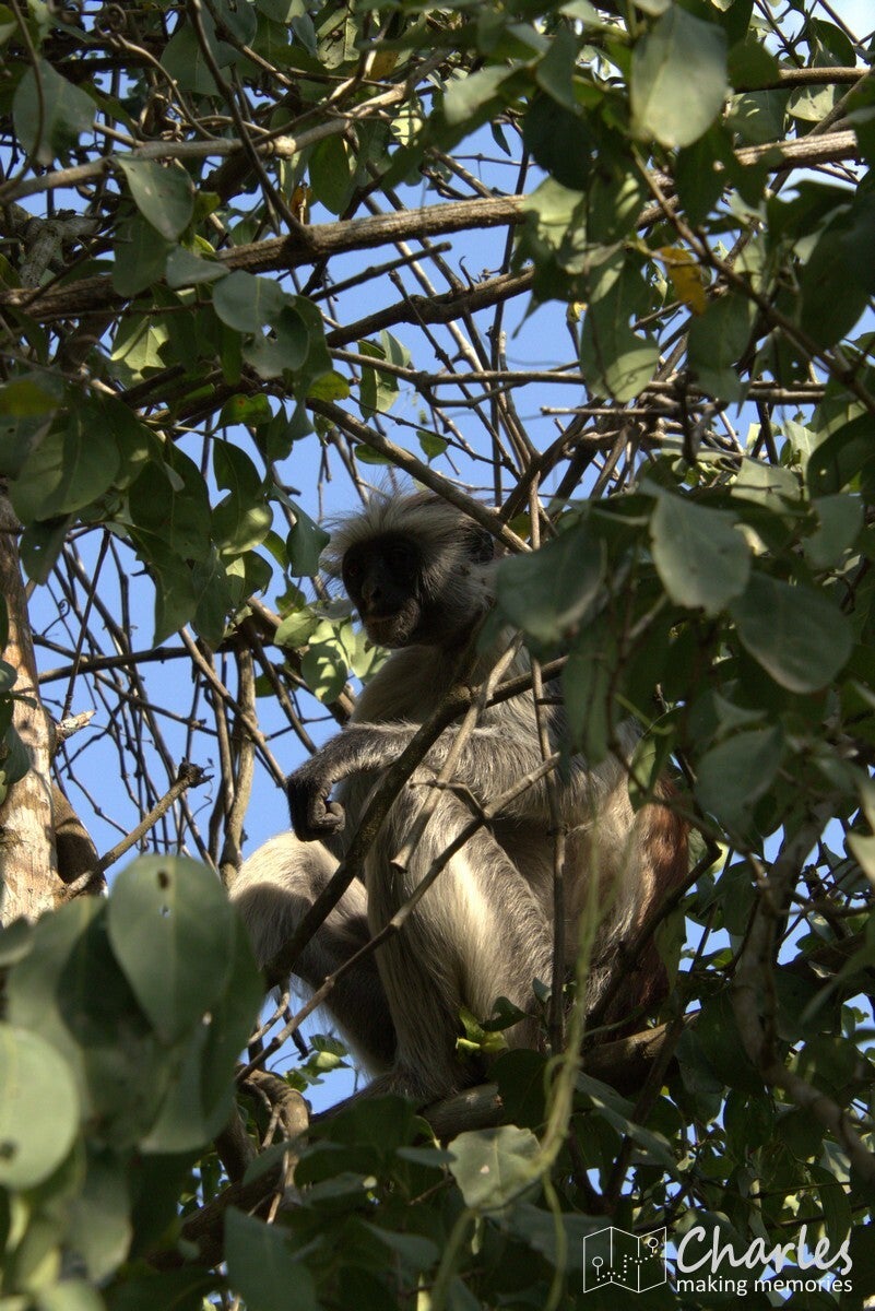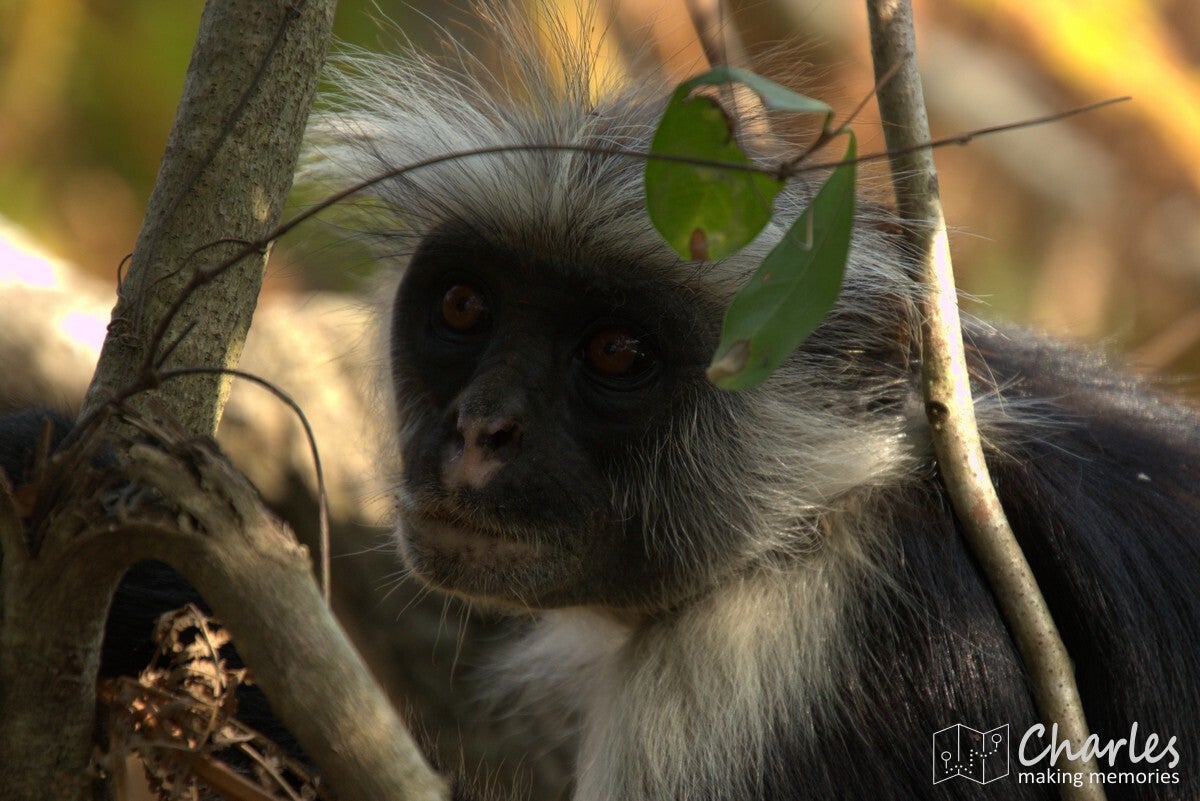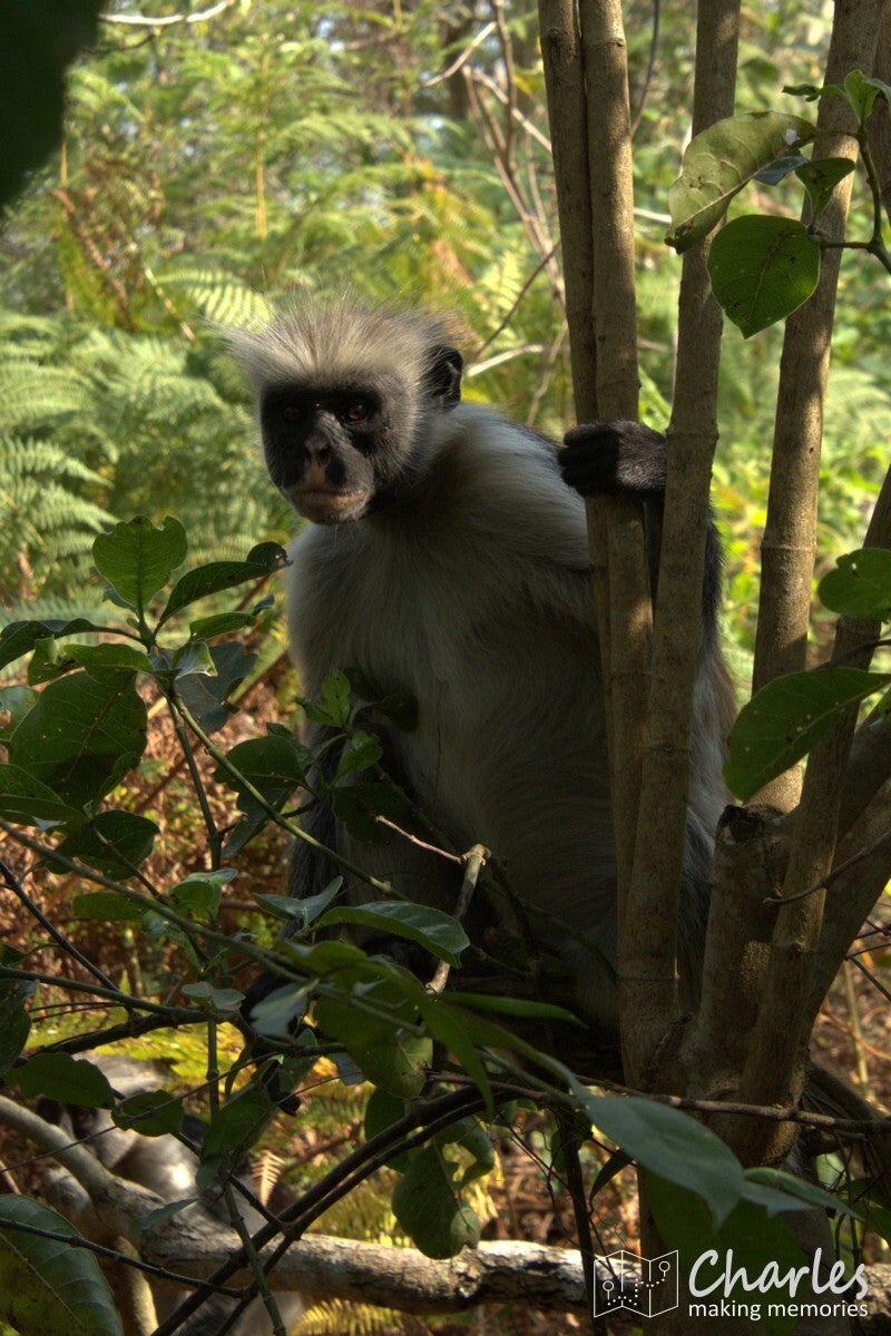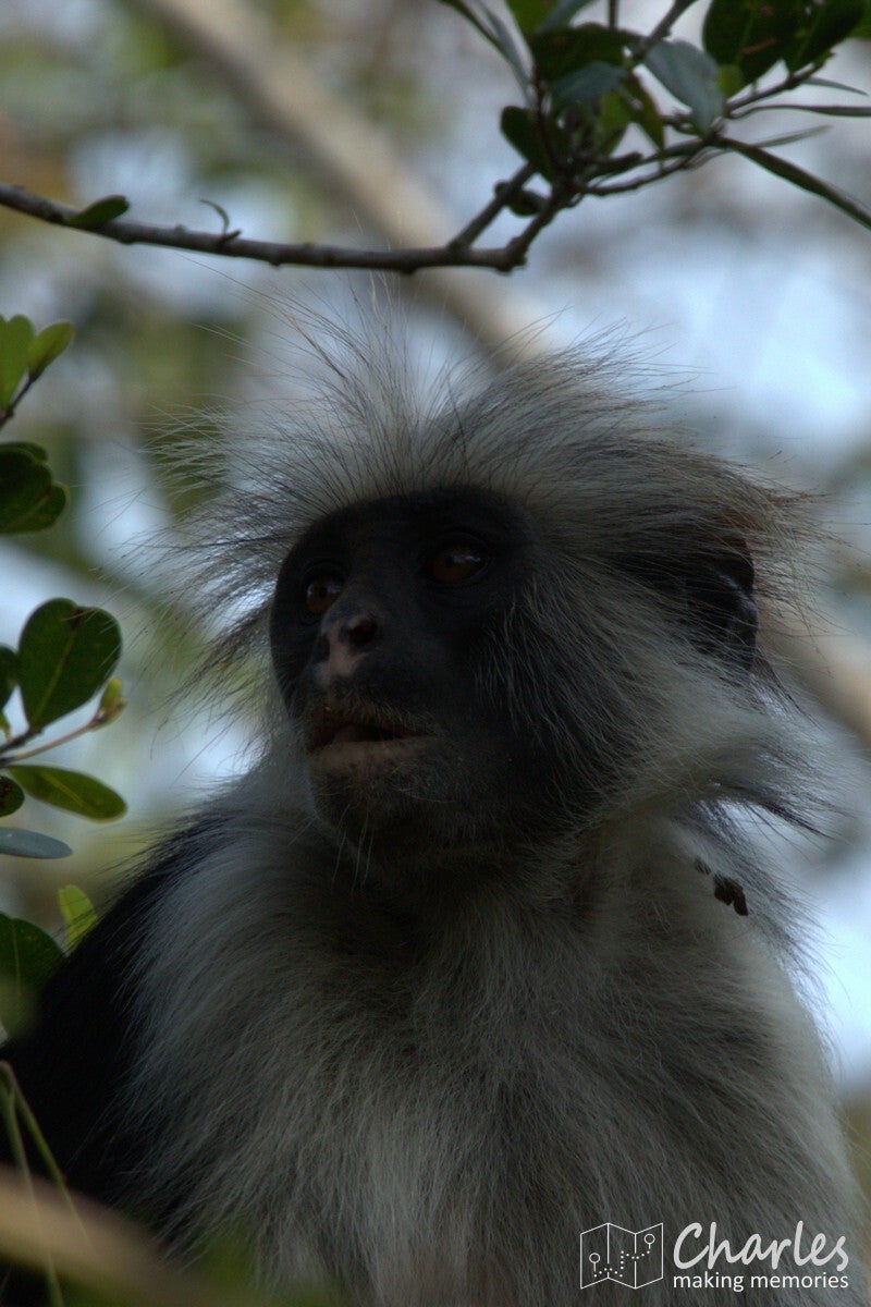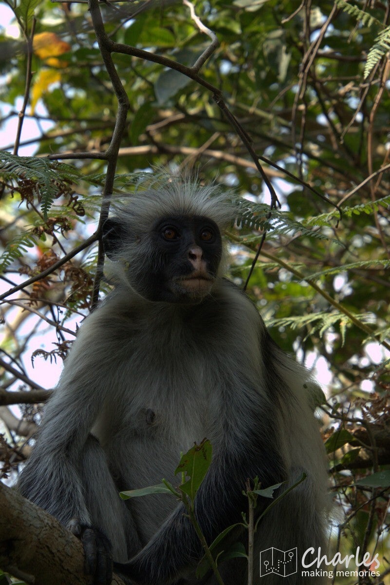 Vanaf de ingang steken we met de auto de weg over en rijden daar een aantal honderden meters over een zandpad. Op grond van waar andere auto's staan geparkeerd, wordt ingeschat waar zich een grote groep apen bevindt. Vanaf hier gaan we het bos in. Totaal niet vergelijkbaar met het eerdere bos, de bomen zijn hier laag en het is vooral veel struikgewas. Al snel zien we eerst nog een paar diadeemmeerkatten, maar daarna een aap met een opvallend rode rug, de Zanzibarrodefranjeaap. Eenmaal dichtbij deze aap zien we er steeds meer. Ze zijn als groep in beweging en de ene na de andere komt langs. Of ze springen via de takken van de bomen over je heen, of ze lopen gewoon vlak langs je benen alsof je niet bestaat. Een mooi schouwspel van heel mooie apen met karakteristieke gezichten. Na een minuut of tien is de hele groep wel gepasseerd, het is voor ons ook weer tijd om te gaan.