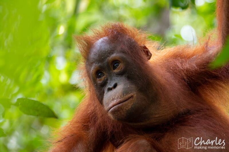Nadat het weer wat rustiger werd bij de voederplaats, doken we weer ergens een zijpad in, daar waar de overige toeristen de kortste route richting boten koos. Deze afwijkende route bood ons veel te zien. Het bos was hier meer open (het betrof eerdere landbouwgrond waar kort geleden bomen waren herplant), waardoor er bijvoorbeeld ook bekerplanten groeiden. Ook kwamen we een moeder oerang oetan met jong tegen op ons pad. We stapten rustig van het pad, waarna de oerang oetan heel voorzichtig langs ons liep, waarschijnlijk nog op weg naar de voederplaats. Wat een bijzondere ervaring, een oerang oetan die op tientallen centimeters afstand voorbij komt lopen! De wandeling leverde verder nog een aanvaring met vuurmieren op, niet echt prettig juist op het moment dat op sandalen wordt gewandeld. Al met al waren we maar wat blij met de extra stukken die we hebben mogen lopen.
