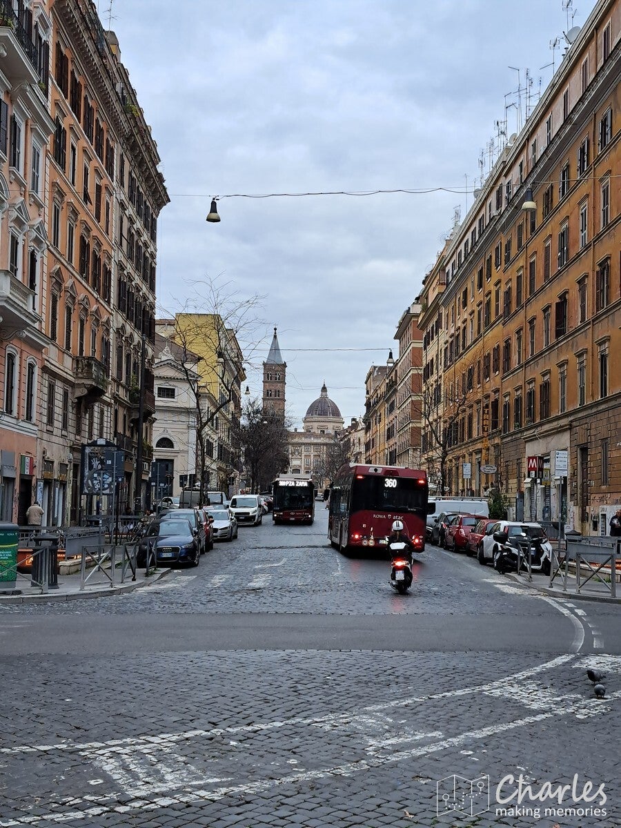 Om op tijd bij het colosseum te zijn, moesten we vertrekken om 9 uur. Ongeveer een half uurtje lopen (net zo lang als dat we met bus en metro zouden gaan), maar een korte stop om ergens een ontbijtje met thee te scoren voor onderweg was meegerekend. Ons appartement ligt net buiten het centrum, vlak aan de andere kant van het spoor. Eerst dus door een tunnel onder het spoor door, daarna dwars door een wijk heen. De eerst straten waren niet heel interessant, maar op een gegeven moment kwamen we op een plein met een park in het midden, het Vittorio Emanuele-plein. Een stukje groen midden in een drukke stad is altijd prettig. Vanaf het park uitzicht op de Basiliek van Santa Maria Maggiore, een prachtig gebouw in de verte. Geen tijd om die kant op te lopen, een stop daar moest maar later deze week. Aan de rand van het plein wel een kleine bistro, waar we ook thee en lekkers konden krijgen om mee te nemen. Via een zijstraat liepen we door richting het colosseum, waar we eerst in een park nog een bankje opzochten om te ontbijten. Toen we weer verder liepen zagen we al snel het colosseum tussen de bomen opdoemen. We kwamen met een prachtig uitzicht aan de achterkant van dit gigantische bouwwerk aan, wat indrukwekkend. Niet gek dat het tot de moderne wereldwonderen hoort.