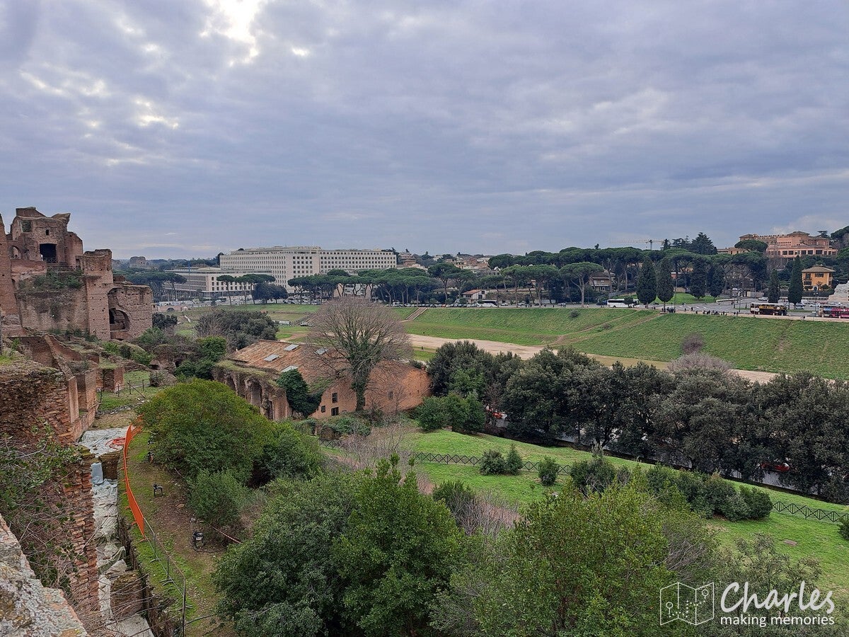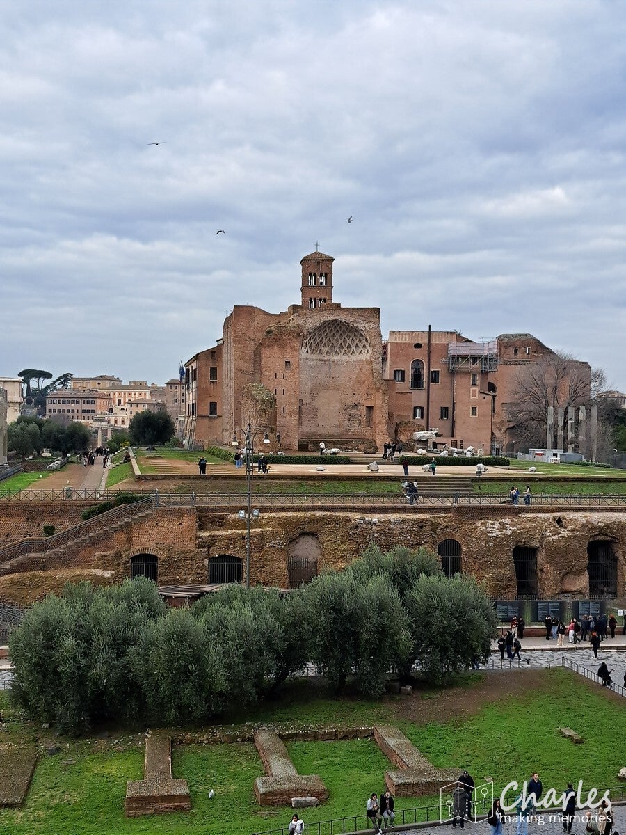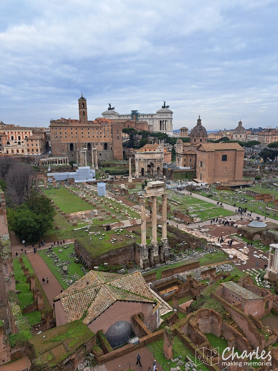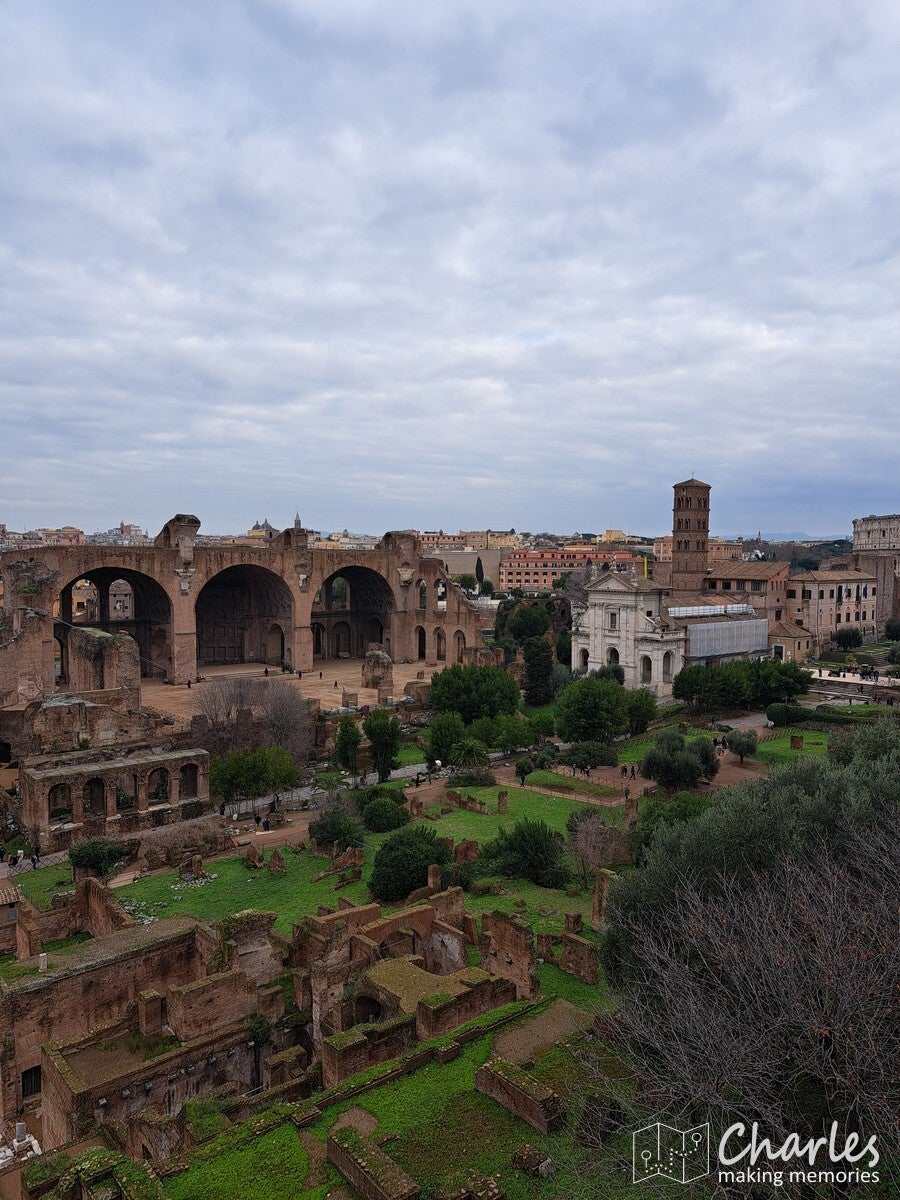 Na het bezoek aan het colosseum dus door naar het complex van de Forum Romanum, het archeologische hart van het oude Rome. Het is een uitgestrekte vlakte vol ruïnes van tempels, basilieken en monumenten die ooit het politieke, sociale, religieuze en economische centrum van de stad waren. Gelegen tussen de Capitool- en Palatijnse heuvels, was het de plaats van belangrijke debatten, ceremonies en het openbare leven, en is nu een van de meest iconische bezienswaardigheden van Rome. Het ticket voor het colosseum was ook geldig voor dit complex, we konden dus snel door. Gelukkig ook nauwelijks rijen, alleen voor de veiligheidscheck moesten we even wachten. Eenmaal binnen kozen we ervoor om het eerst hogerop te zoeken, de Palatijnse heuvel op. Niet alleen vanwege de mooie tuinen, thermen en andere bouwwerken, maar ook omdat we op de nodige uitzichten hoopten. En dat lukte helemaal prima. Eerst zicht op Circus Maximus, het grootste stadion van Rome. Weinig meer over van dit sradion voor wagenrennen, maar je ziet nog wel de gigantische omvang door de verdiepte ligging. Verder het uitzicht op het Colosseum en als laatste op het Forum Romanum en omliggende gebouwen. Pas nadat we alles vanaf hoogte hadden gezien daalden we af naar het forum zelf. Niet over het loeidrukke hoofdpad, maar via paadjes tussen de opgravingen en resten door. Zo zie je ook nog eens veel meer. Aan de andere kant van het complex pakten we een uitgang, tijd om meer te zien van Rome.