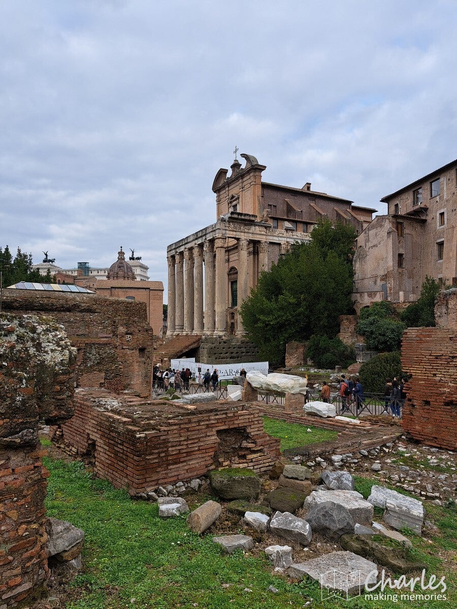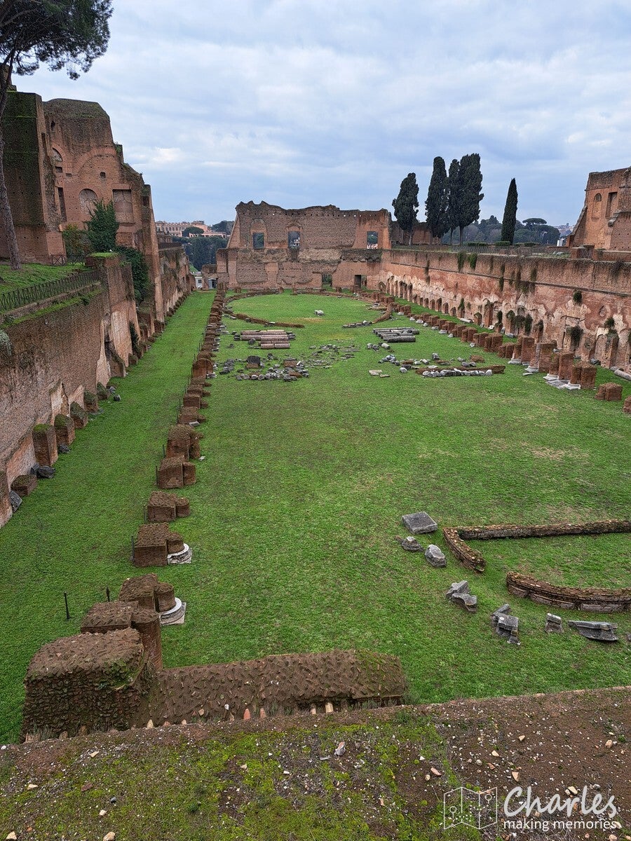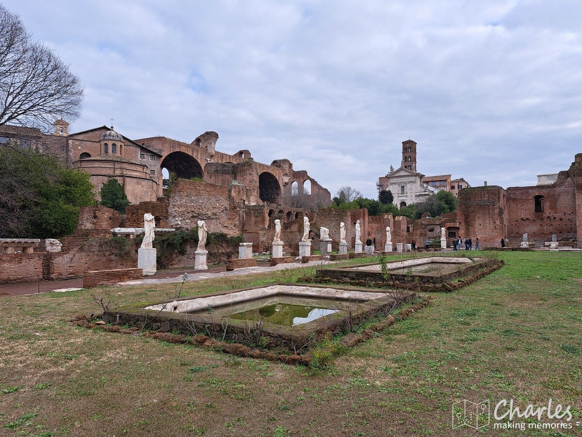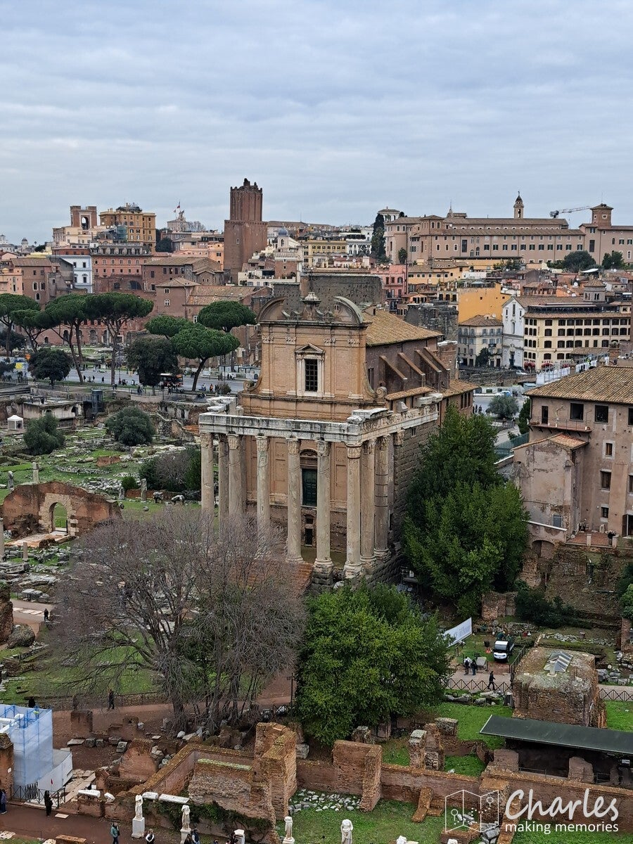 Na het bezoek aan het colosseum dus door naar het complex van de Forum Romanum, het archeologische hart van het oude Rome. Het is een uitgestrekte vlakte vol ruïnes van tempels, basilieken en monumenten die ooit het politieke, sociale, religieuze en economische centrum van de stad waren. Gelegen tussen de Capitool- en Palatijnse heuvels, was het de plaats van belangrijke debatten, ceremonies en het openbare leven, en is nu een van de meest iconische bezienswaardigheden van Rome. Het ticket voor het colosseum was ook geldig voor dit complex, we konden dus snel door. Gelukkig ook nauwelijks rijen, alleen voor de veiligheidscheck moesten we even wachten. Eenmaal binnen kozen we ervoor om het eerst hogerop te zoeken, de Palatijnse heuvel op. Niet alleen vanwege de mooie tuinen, thermen en andere bouwwerken, maar ook omdat we op de nodige uitzichten hoopten. En dat lukte helemaal prima. Eerst zicht op Circus Maximus, het grootste stadion van Rome. Weinig meer over van dit sradion voor wagenrennen, maar je ziet nog wel de gigantische omvang door de verdiepte ligging. Verder het uitzicht op het Colosseum en als laatste op het Forum Romanum en omliggende gebouwen. Pas nadat we alles vanaf hoogte hadden gezien daalden we af naar het forum zelf. Niet over het loeidrukke hoofdpad, maar via paadjes tussen de opgravingen en resten door. Zo zie je ook nog eens veel meer. Aan de andere kant van het complex pakten we een uitgang, tijd om meer te zien van Rome.
