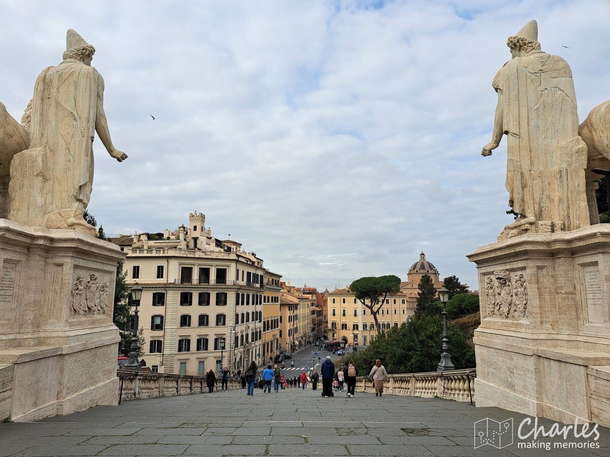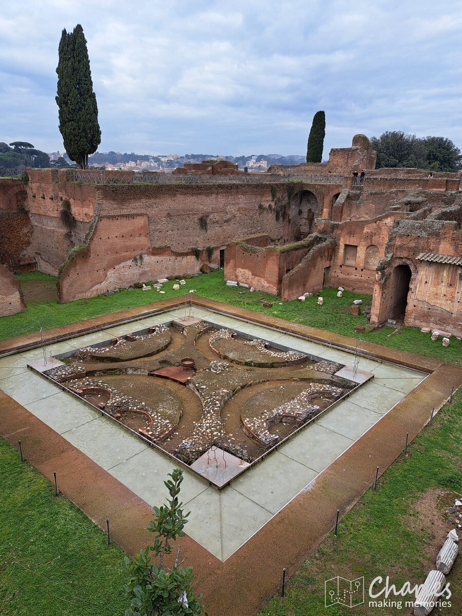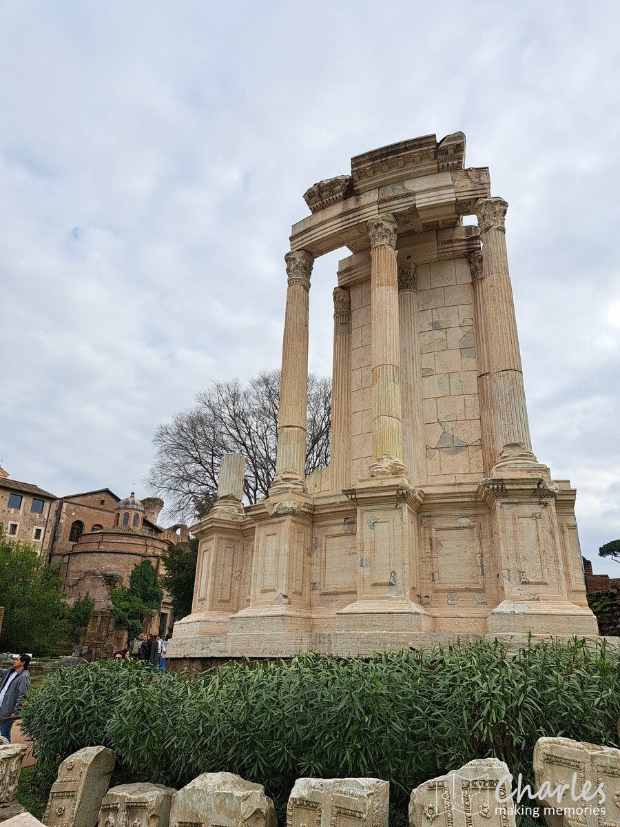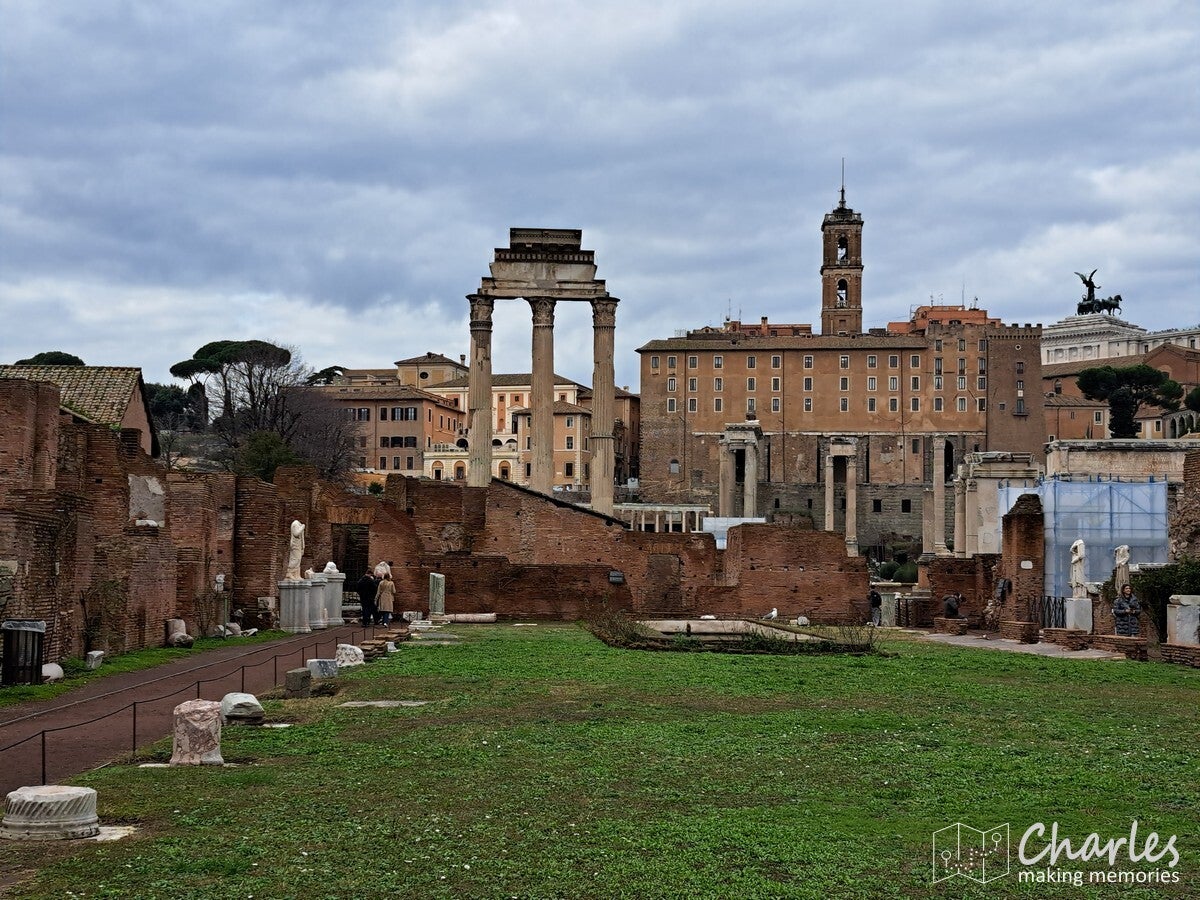 Na het bezoek aan het colosseum dus door naar het complex van de Forum Romanum, het archeologische hart van het oude Rome. Het is een uitgestrekte vlakte vol ruïnes van tempels, basilieken en monumenten die ooit het politieke, sociale, religieuze en economische centrum van de stad waren. Gelegen tussen de Capitool- en Palatijnse heuvels, was het de plaats van belangrijke debatten, ceremonies en het openbare leven, en is nu een van de meest iconische bezienswaardigheden van Rome. Het ticket voor het colosseum was ook geldig voor dit complex, we konden dus snel door. Gelukkig ook nauwelijks rijen, alleen voor de veiligheidscheck moesten we even wachten. Eenmaal binnen kozen we ervoor om het eerst hogerop te zoeken, de Palatijnse heuvel op. Niet alleen vanwege de mooie tuinen, thermen en andere bouwwerken, maar ook omdat we op de nodige uitzichten hoopten. En dat lukte helemaal prima. Eerst zicht op Circus Maximus, het grootste stadion van Rome. Weinig meer over van dit sradion voor wagenrennen, maar je ziet nog wel de gigantische omvang door de verdiepte ligging. Verder het uitzicht op het Colosseum en als laatste op het Forum Romanum en omliggende gebouwen. Pas nadat we alles vanaf hoogte hadden gezien daalden we af naar het forum zelf. Niet over het loeidrukke hoofdpad, maar via paadjes tussen de opgravingen en resten door. Zo zie je ook nog eens veel meer. Aan de andere kant van het complex pakten we een uitgang, tijd om meer te zien van Rome.