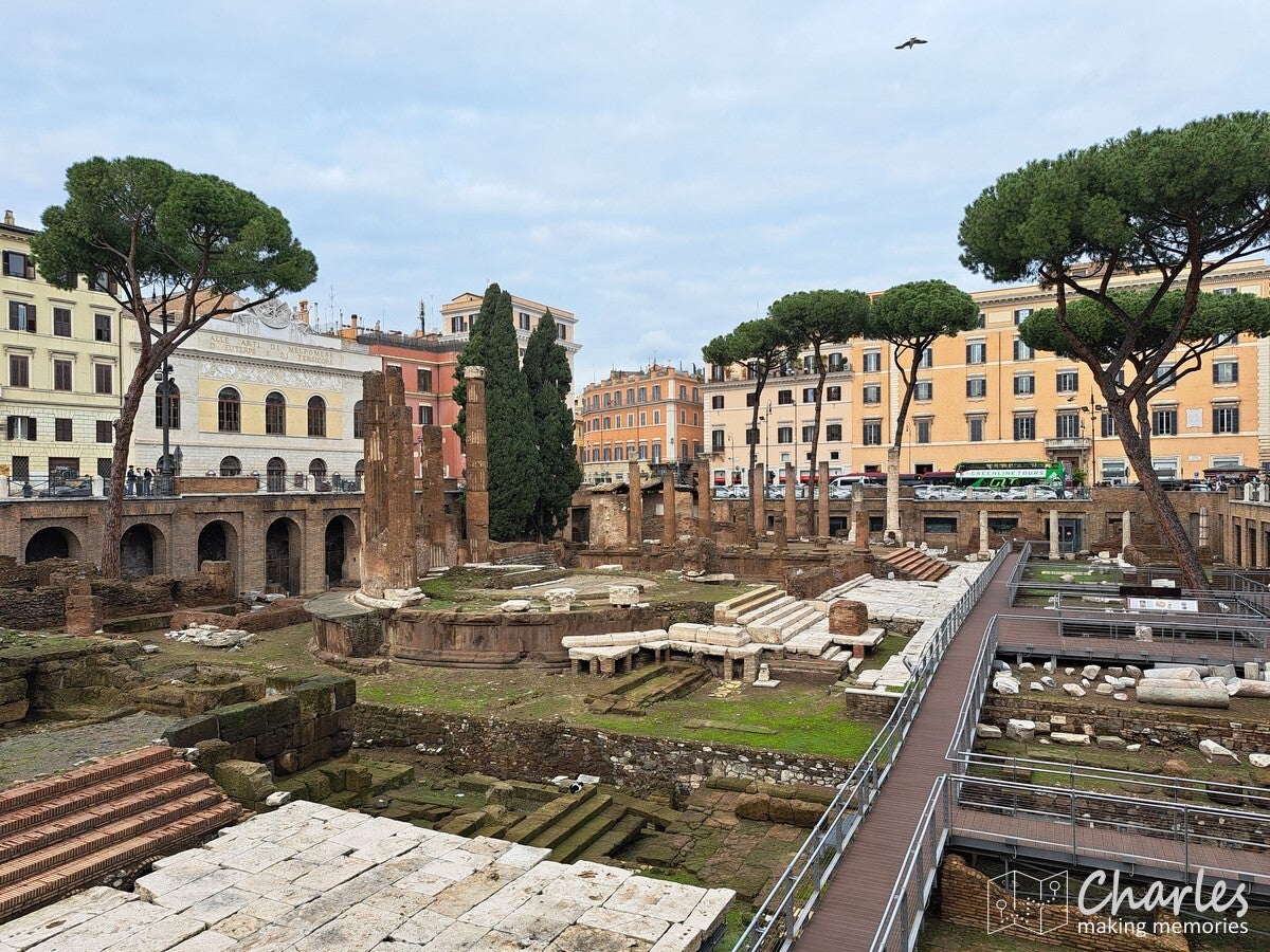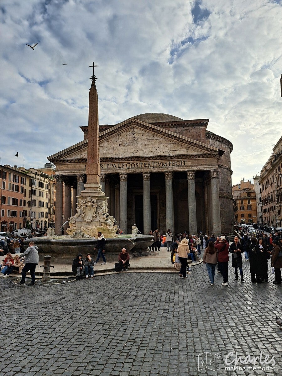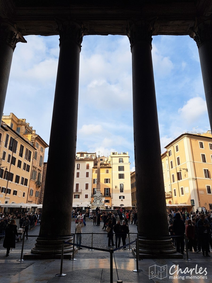 Een erg markant en gigantisch gebouw dat we tegenkwamen was het monument voor Victor Emanuel II. Het is een kolossaal wit marmeren monument (gebouw) op de Piazza Venezia, ter ere van de eerste koning van verenigd Italië en de Italiaanse eenwording. We zijn er niet in geweest, maar er omheen gelopen. Via een trap naar een ander gebouw kwam je nog uit bij enkele uitzichtpunten op het Forum Romanum, een aanrader om ook nog te doen. Inmiddels liep het tegen lunchtijd, waarbij we dachten vast in de richting van het Pantheon te lopen. Dan hadden we na de lunch minder haast. Bij de Area Sacra del Largo Argentina, een verdiepte archeologische opgraving vonden we een terras voor de welverdiende lunch. Het eerste terrasje van het jaar, altijd een bijzonder moment. Jammer dat we er in Nederland nog wel een poosje op zullen moeten wachten, maar deze is vast binnen. Een echte Italiaanse pizza maakte het feestje compleet.