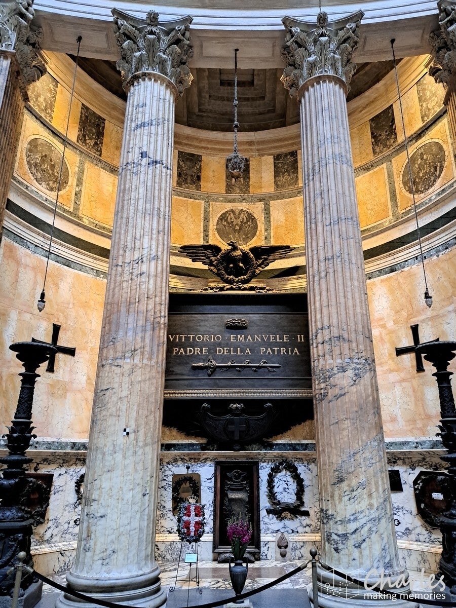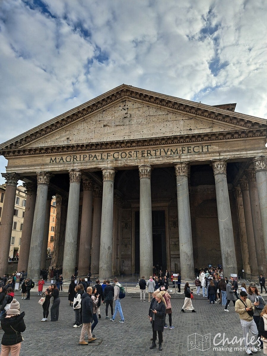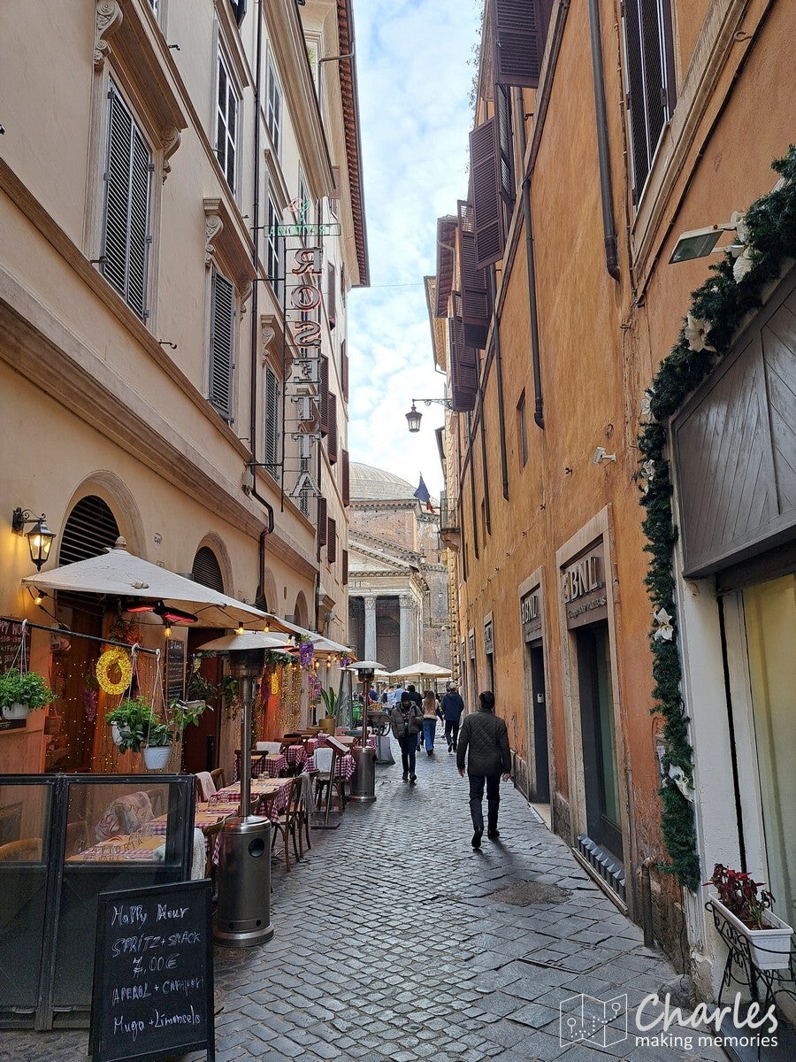 Een erg markant en gigantisch gebouw dat we tegenkwamen was het monument voor Victor Emanuel II. Het is een kolossaal wit marmeren monument (gebouw) op de Piazza Venezia, ter ere van de eerste koning van verenigd Italië en de Italiaanse eenwording. We zijn er niet in geweest, maar er omheen gelopen. Via een trap naar een ander gebouw kwam je nog uit bij enkele uitzichtpunten op het Forum Romanum, een aanrader om ook nog te doen. Inmiddels liep het tegen lunchtijd, waarbij we dachten vast in de richting van het Pantheon te lopen. Dan hadden we na de lunch minder haast. Bij de Area Sacra del Largo Argentina, een verdiepte archeologische opgraving vonden we een terras voor de welverdiende lunch. Het eerste terrasje van het jaar, altijd een bijzonder moment. Jammer dat we er in Nederland nog wel een poosje op zullen moeten wachten, maar deze is vast binnen. Een echte Italiaanse pizza maakte het feestje compleet.