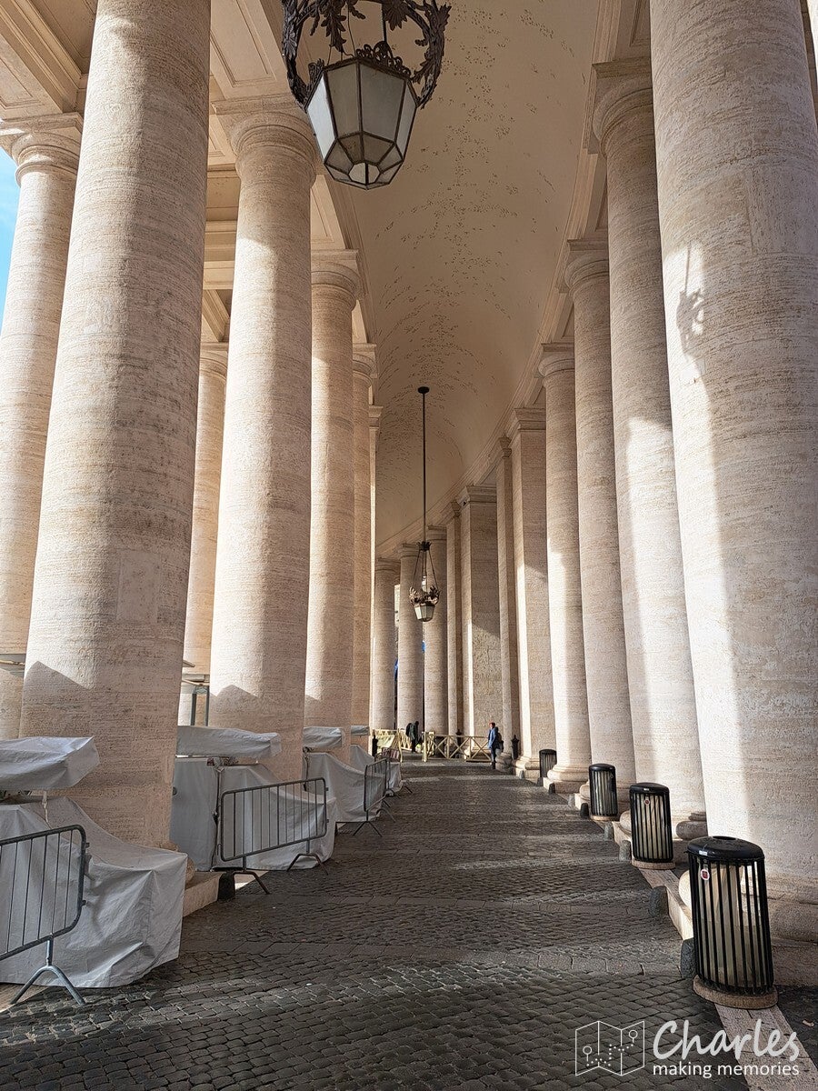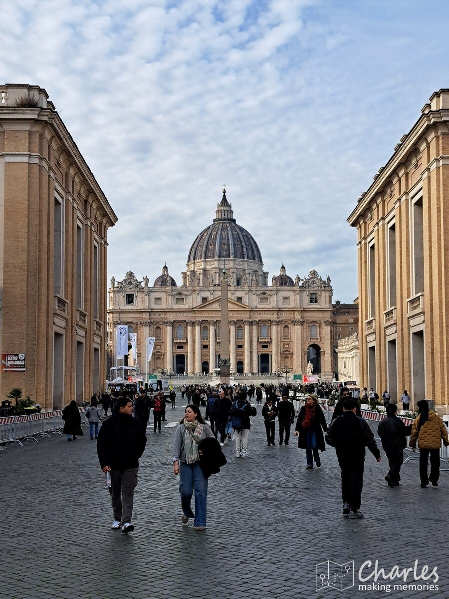Bij het verlaten van de kapel zou je volgens de verhalen twee opties hebben: een uitgang richting de Sint Pieter basiliek en een uitgang verder het museum door. We wilden voor de eerste gaan, maar in de drukte kwamen we toch op de verkeerde uitgang uit. Voordeel is dat je ook het laatste deel van het museum ziet. Nadeel is alleen dat je helemaal om moet lopen naar het Sint Pietersplein om de basiliek te bezoeken én dat je daar in de rij moet. En die bleek absoluut niet mals, dus dat hebben we maar geskipt. Uiteraard wel het plein en de basiliek gezien, al voelt het wel een beetje als een soort multimediaterrein. Overal grote schermen en speakers, verder veel hekken om de menigte een beetje te doseren en sturen. Op het plein ook overal vrachtwagens om weer iets op- of af te bouwen. Als je om dit soort dingen heen kan kijken, is de Sint Pieter en het plein overigens wel erg mooi.