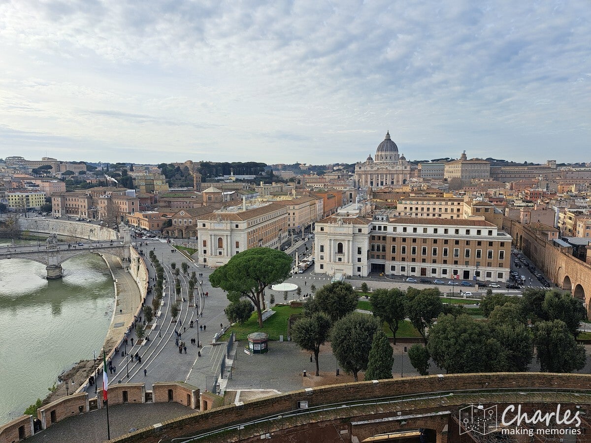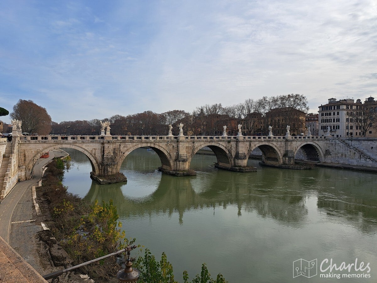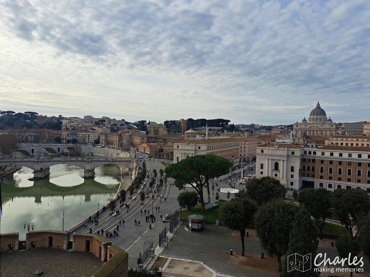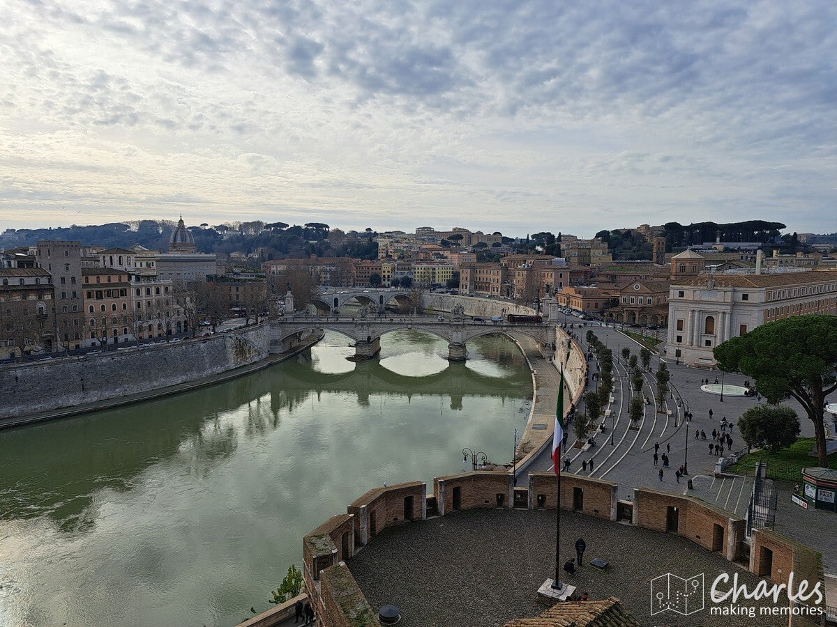 Via de Via della Conciliazione liepen we vervolgens naar het Castel Sant'Angelo (in het Nederlands 'De Engelenburcht'). Uiteraard af en toe nog even omdraaien om nog even in de verte de Sint Pieter te zien. Hoe verder weg, hoe beter je die gigantische koepel kan zien. De Engelenburcht ligt aan de rivier Tiber, met vanaf hier uitzicht over twee prachtige bruggen met mooie beelden er bovenop (Ponte Vittorio Emanuele II en Ponte Sant'Angelo (Engelenbrug)). Vervolgens een bezoek aan de Engelenburcht zelf. Deze burcht was vroeger eigendom van het Vaticaan. Voor de Paus en gevolg was het een veilig toevluchtsoord in tijden van nood. Volgens de verhalen zou er ook een tunnel lopen tussen het Vaticaan en de burcht. Tegenwoordig is het een museum, al is de collectie een stuk minder indrukwekkend dan die van het Vaticaan museum. Een bezoek aan de burcht is qua bouwwerk echter al meer dan de moeite waard, waarbij het uitzicht vanaf de burcht ook nog eens erg mooi is. Vanaf het hoogste punt kijk je uit over het Vaticaan, de Tiber en een groot deel van Rome. Na het bezoek was het tijd voor de lunch. We staken hiervoor de Tiber over, richting het oude centrum van de stad. Op het Piazza Sforza Cesarini waren een beetje weg van de verkeersdrukte een paar restaurants te vinden. Ietwat fris in de schaduw, maar toch ook nu weer lunch op het terras. Na de lunch noch over een marktje op het Piazza Farnese, waar we nog wat balsamico hebben gescoord voor thuis.