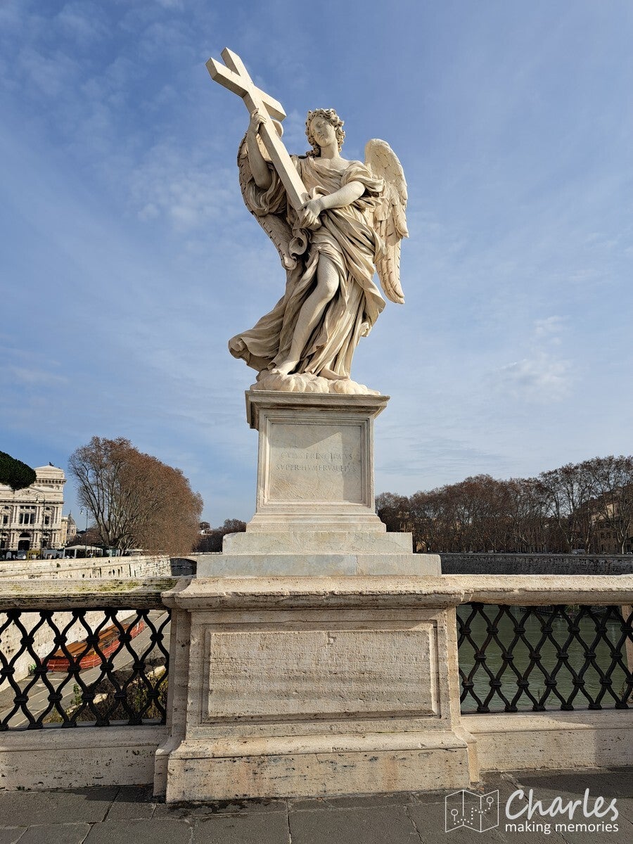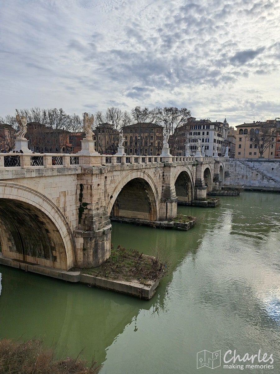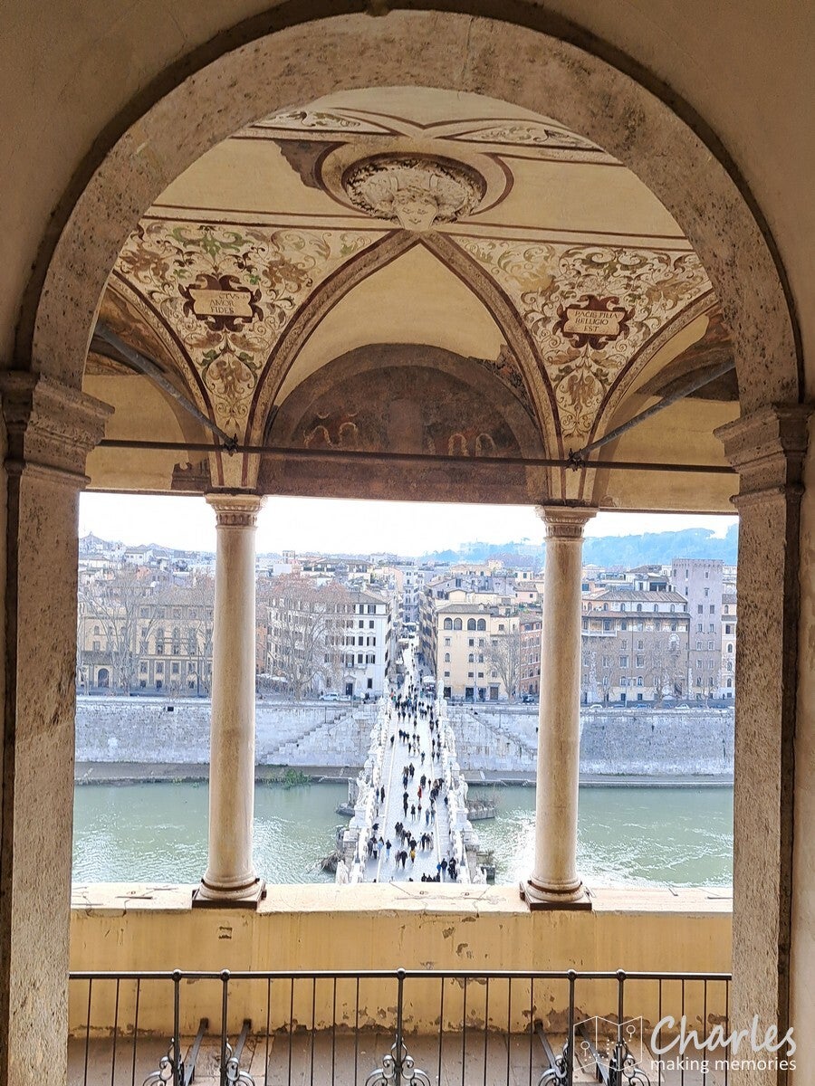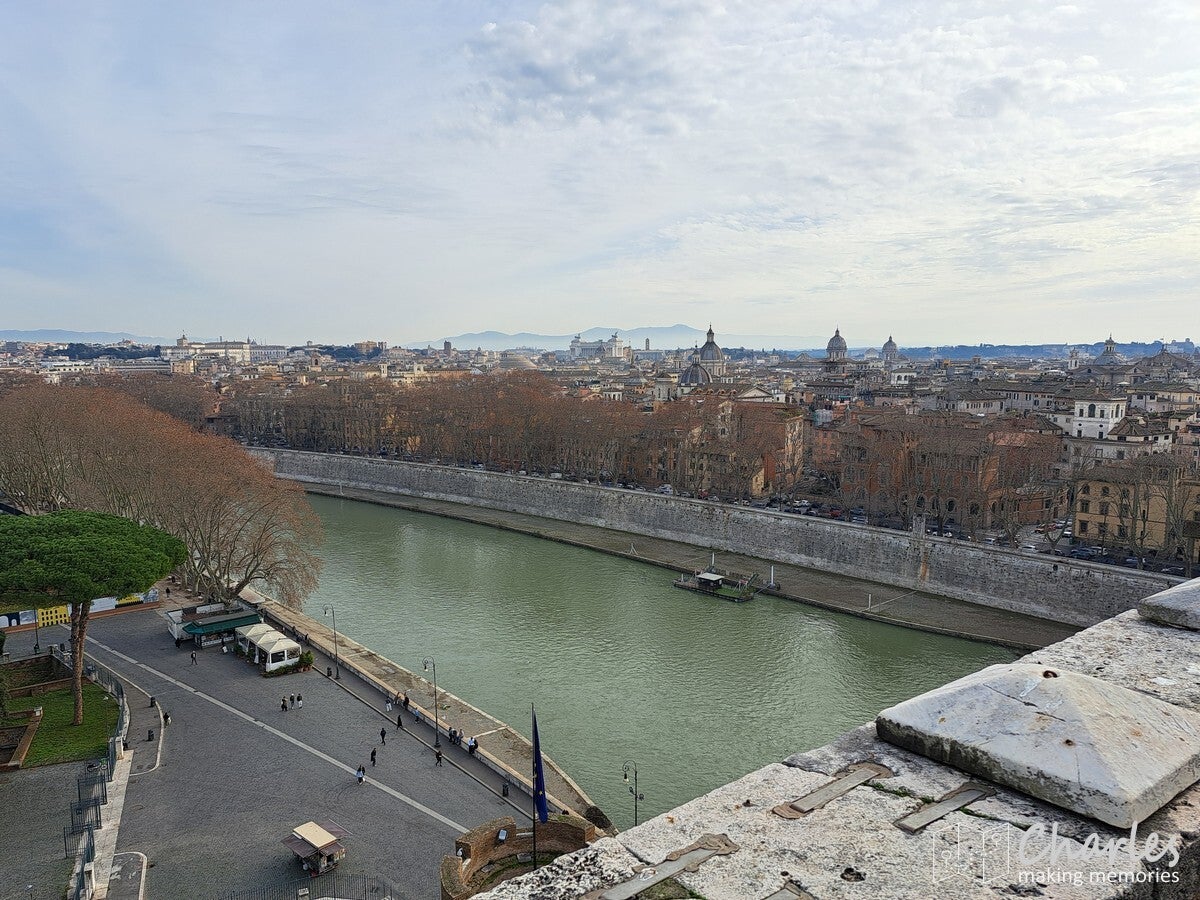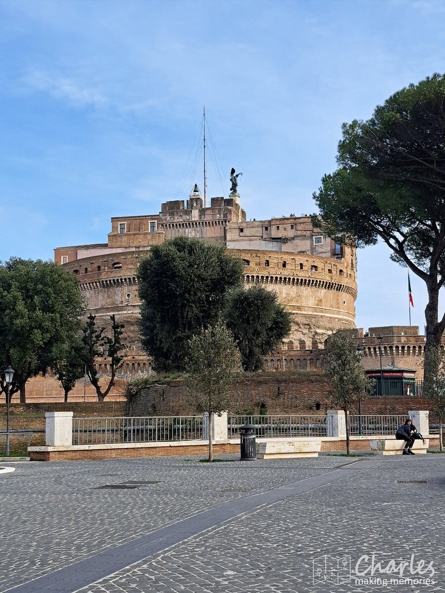 Via de Via della Conciliazione liepen we vervolgens naar het Castel Sant'Angelo (in het Nederlands 'De Engelenburcht'). Uiteraard af en toe nog even omdraaien om nog even in de verte de Sint Pieter te zien. Hoe verder weg, hoe beter je die gigantische koepel kan zien. De Engelenburcht ligt aan de rivier Tiber, met vanaf hier uitzicht over twee prachtige bruggen met mooie beelden er bovenop (Ponte Vittorio Emanuele II en Ponte Sant'Angelo (Engelenbrug)). Vervolgens een bezoek aan de Engelenburcht zelf. Deze burcht was vroeger eigendom van het Vaticaan. Voor de Paus en gevolg was het een veilig toevluchtsoord in tijden van nood. Volgens de verhalen zou er ook een tunnel lopen tussen het Vaticaan en de burcht. Tegenwoordig is het een museum, al is de collectie een stuk minder indrukwekkend dan die van het Vaticaan museum. Een bezoek aan de burcht is qua bouwwerk echter al meer dan de moeite waard, waarbij het uitzicht vanaf de burcht ook nog eens erg mooi is. Vanaf het hoogste punt kijk je uit over het Vaticaan, de Tiber en een groot deel van Rome. Na het bezoek was het tijd voor de lunch. We staken hiervoor de Tiber over, richting het oude centrum van de stad. Op het Piazza Sforza Cesarini waren een beetje weg van de verkeersdrukte een paar restaurants te vinden. Ietwat fris in de schaduw, maar toch ook nu weer lunch op het terras. Na de lunch noch over een marktje op het Piazza Farnese, waar we nog wat balsamico hebben gescoord voor thuis.