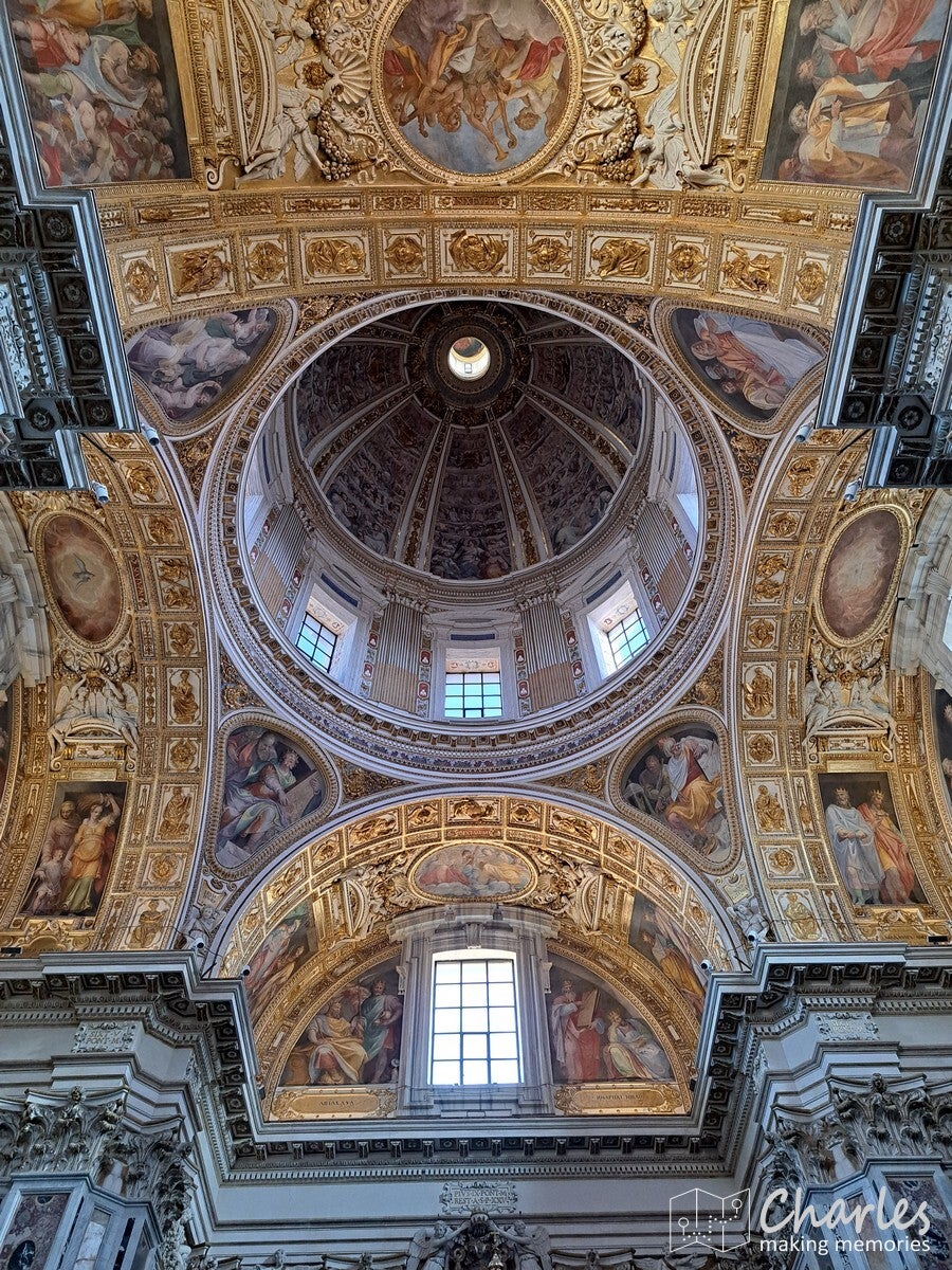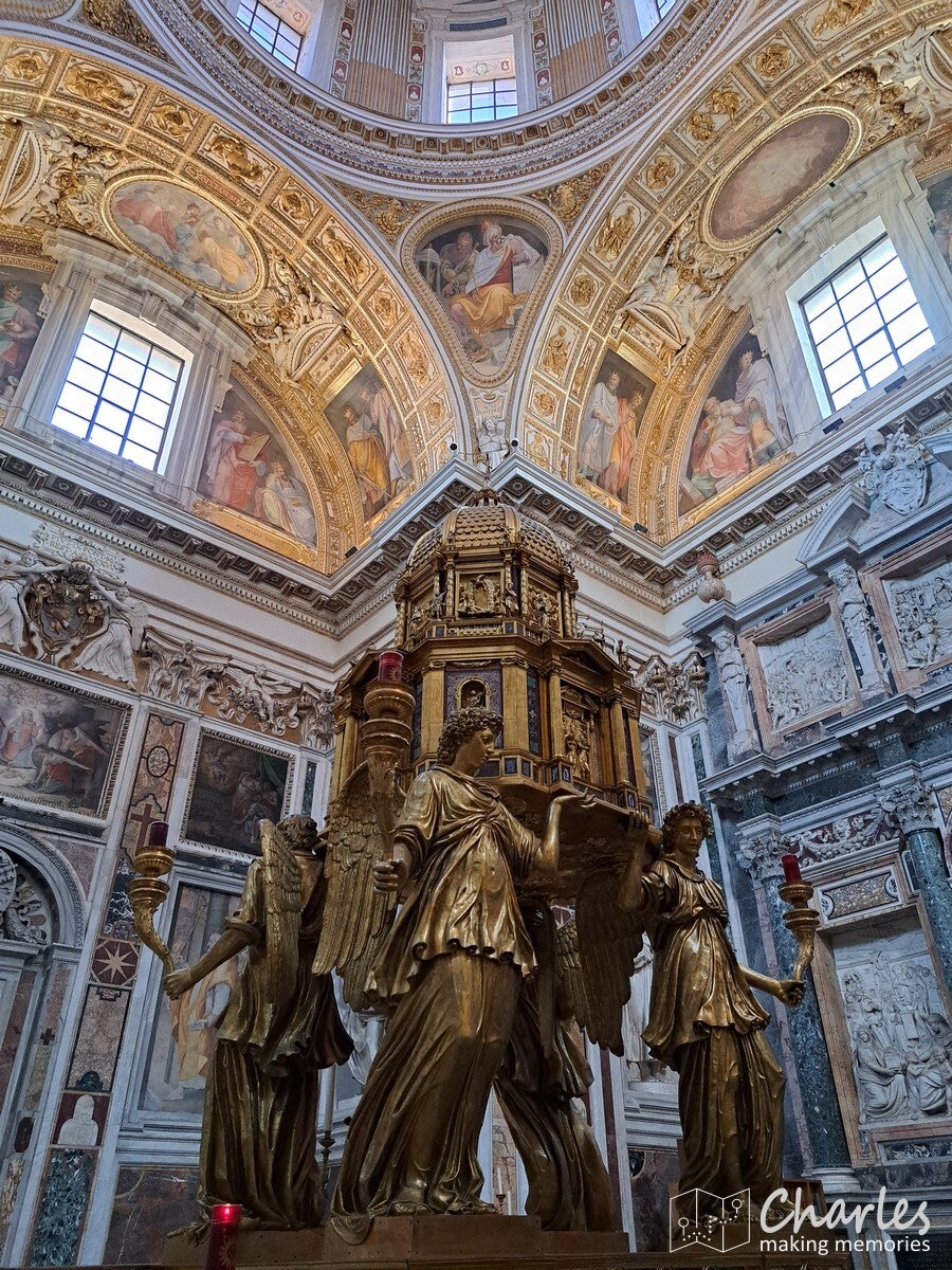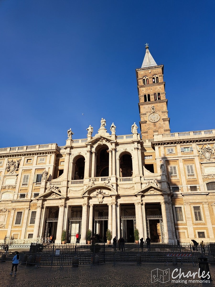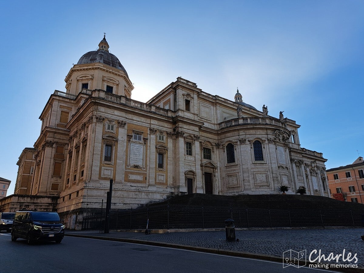 Op de eerste twee volle dagen in Rome hadden we eigenlijk nagenoeg alle grote bezienswaardigheden al gezien: Colosseum, Forum Romanum, Trevifontein, Pantheon, Engelenburcht en uiteraard het Vaticaan. Is dat alles in Rome? Uiteraard niet, met iets van 900 kerken en veel pleinen, fonteinen, standbeelden en noem maar op zou je wel weken kunnen vullen. Vandaag zo'n dag om vooral de minder bekende plekken te bezoeken, al begonnen we toch met nog wel een heel bekende basiliek: de Basilica Papale di Santa Maria Maggiore. Deze basiliek is een van de zeven pelgrimskerken van Rome, en is de enige van de vier pauselijke basilieken in Rome waarvan het antieke bouwwerk intact bewaard is gebleven. Zoals al bij het verslag van gisteren aangegeven, hadden wij buslijn 71 nu ontdekt. Deze lijn kwam ook nog eens langs deze basiliek, dus vanaf het appartement stonden we binnen de kortste keren voor de deur. Een indrukwekkend grote deur wel te verstaan en dat gold ook voor de rest van het gebouw. De basiliek was ook te bezoeken, we maakten graag van deze gelegenheid gebruik. Daarna een ontbijtje aan de rand van het plein voor de basiliek, waar we onder het genot van een broodje en een kop thee een plan gingen opstellen voor vandaag. We hadden twee opties: richting het centrumdeel met de winkelstraten om te gaan shoppen of een rondwandeling door de stad. Het werd een combi: een rondwandeling die ook door een aantal winkelstraten liep. Wij kopen voor stedentrips vaak een 'Time to momo' boekje, waarin altijd een aantal alternatieve wandelingen staan. Die wandelingen kun je vervolgens ook via een app volgen, ideaal om niet steeds te sjouwen met een papieren versie. Wij kozen nu voor een wandeling die begon in de buurt van de basiliek en die ook nog eens door het winkelgebied liep.