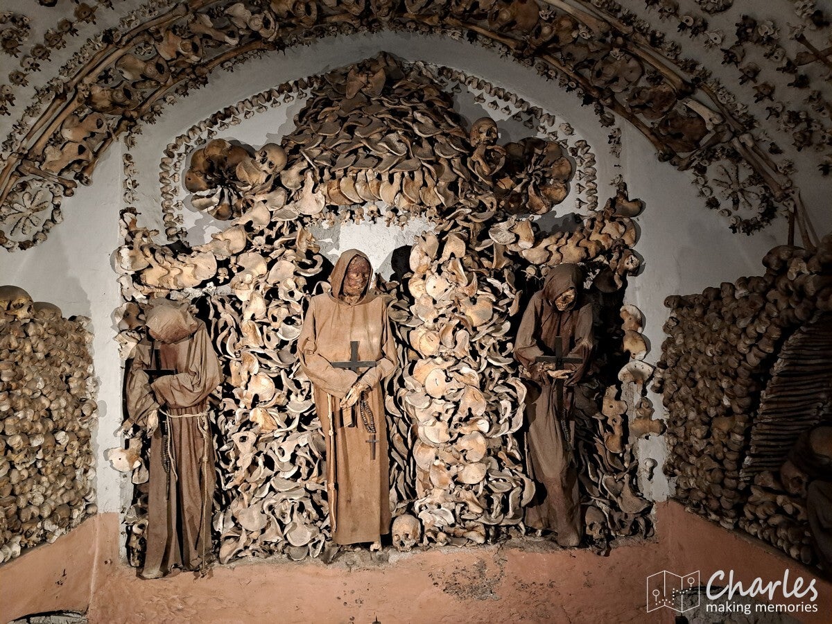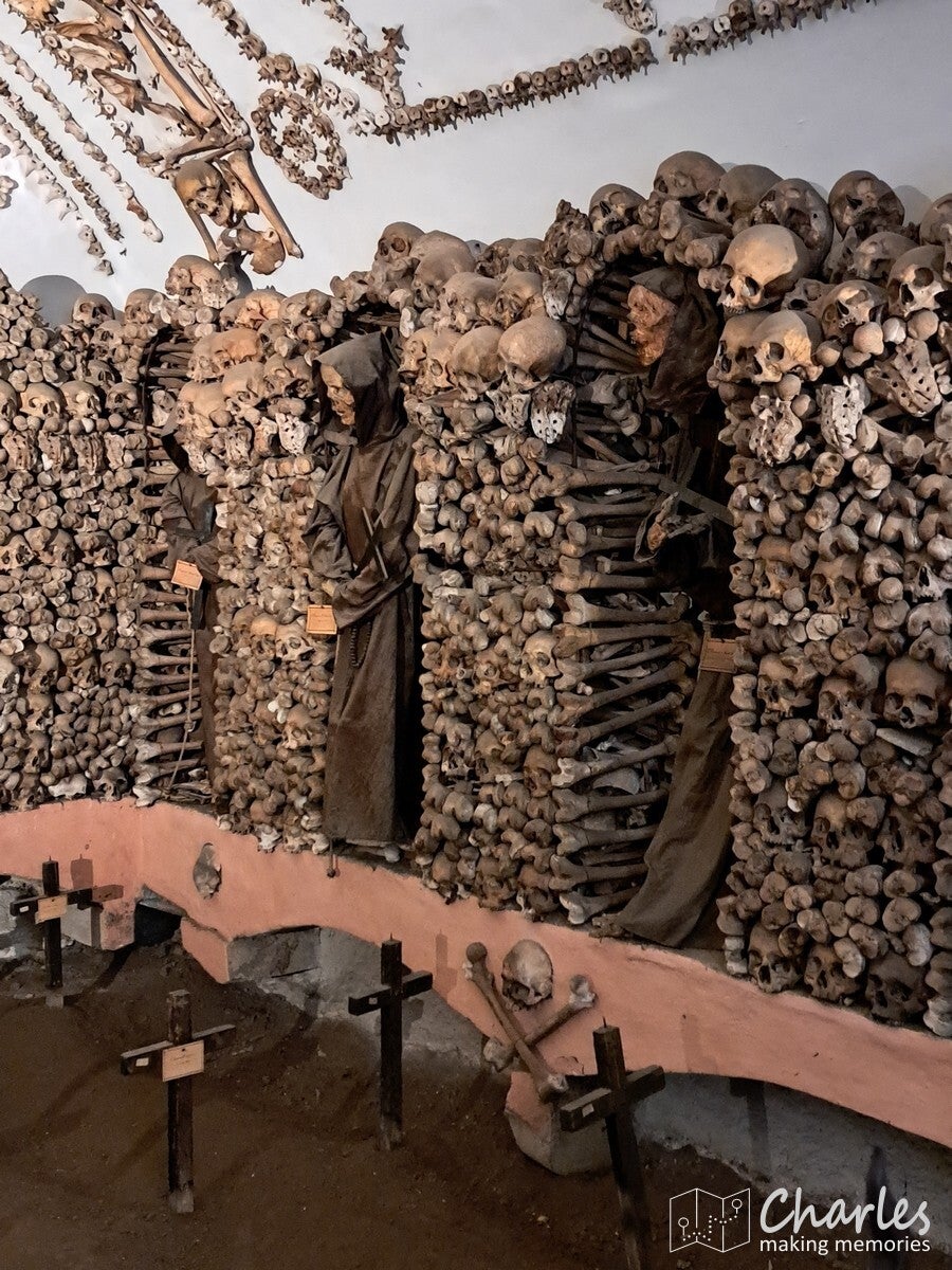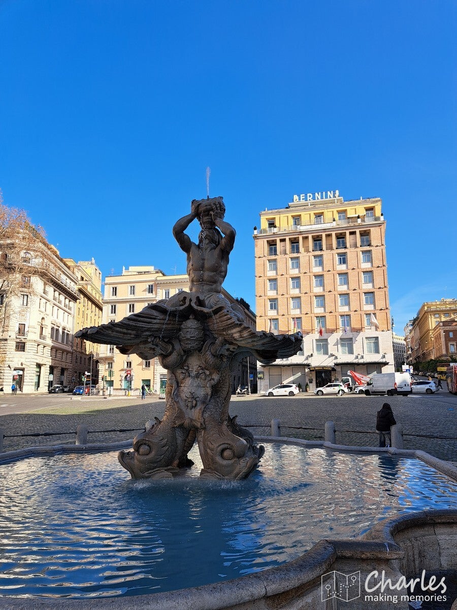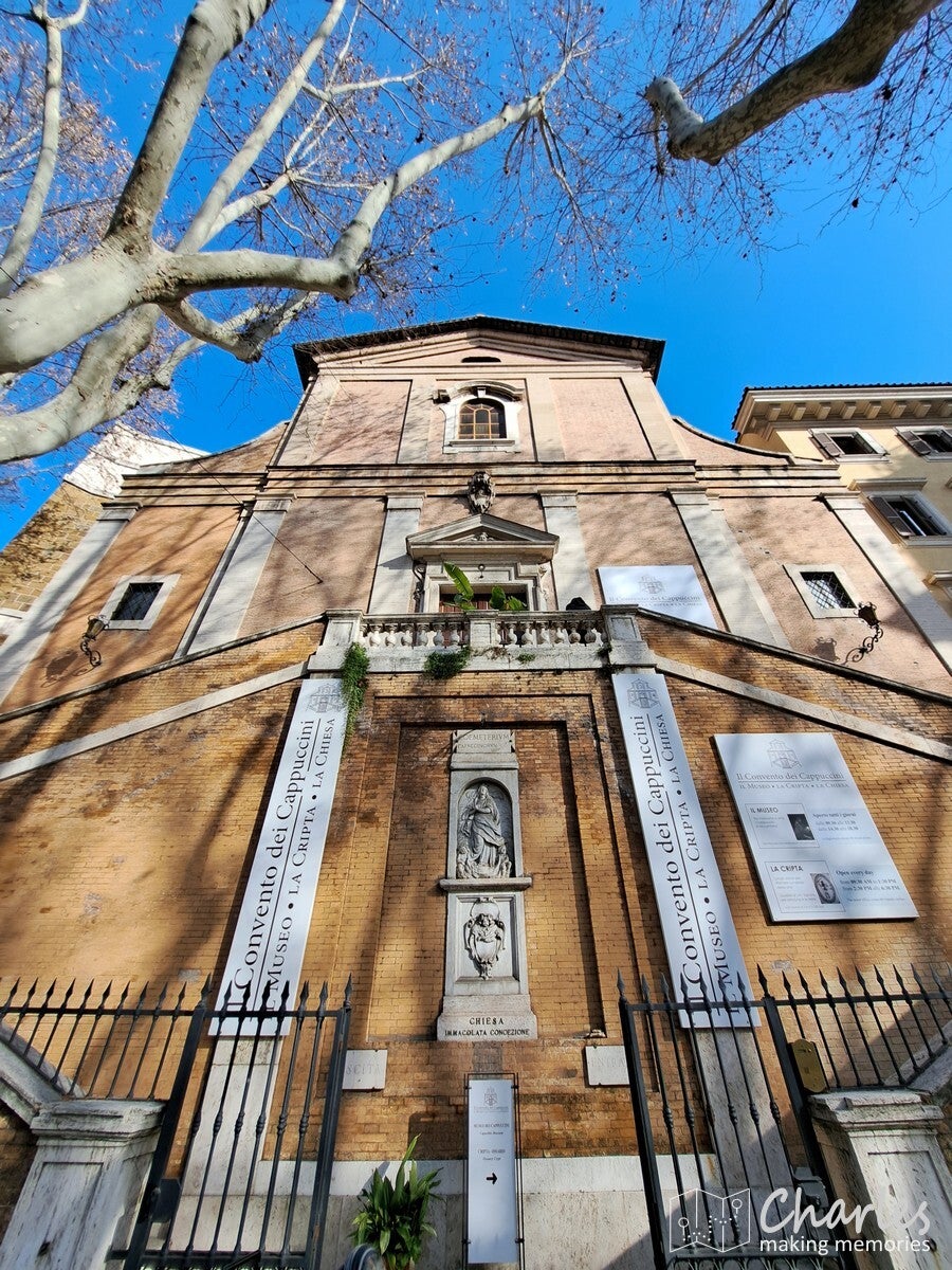 Startpunt van de wandeling was vlak bij het grote treinstation van Rome: Termini. Vlak daarbij ligt het Piazza della Repubblica, een soort megarotonde met in het midden een grote fontein. Aan dit plein ligt een heel bijzondere kerk, namelijk het Santa Maria degli Angeli e dei Martiri. Ooit gebouwd als thermen, het ziet er dus niet uit als een kerk. Het is echter aan de hand van ontwerpen van Michelangelo omgebouwd tot kerk. Na een kort bezoek aan de kerk liepen we weer door, langs een aantal kleinere kerken en een in een gebouw gebouwde fontein. Volgende echt memorabele stop was de Kapucijner crypte onder de kerk Santa Maria della Concezione dei Cappuccini. Het is nu een museum, waarbij je aan het einde door vijf kleine kapellen loopt, die zijn versier met de schedels en botten van ongeveer 4000 Kapucijner monniken. Al die botten zijn gerangschikt in artistieke patronen, zelfs de plafonds zijn versierd. Een best luguber tafereel, maar wel intrigerend. De bovenliggende kerk konden we ook bezoeken, deze viel vooral op door het barokke interieur.