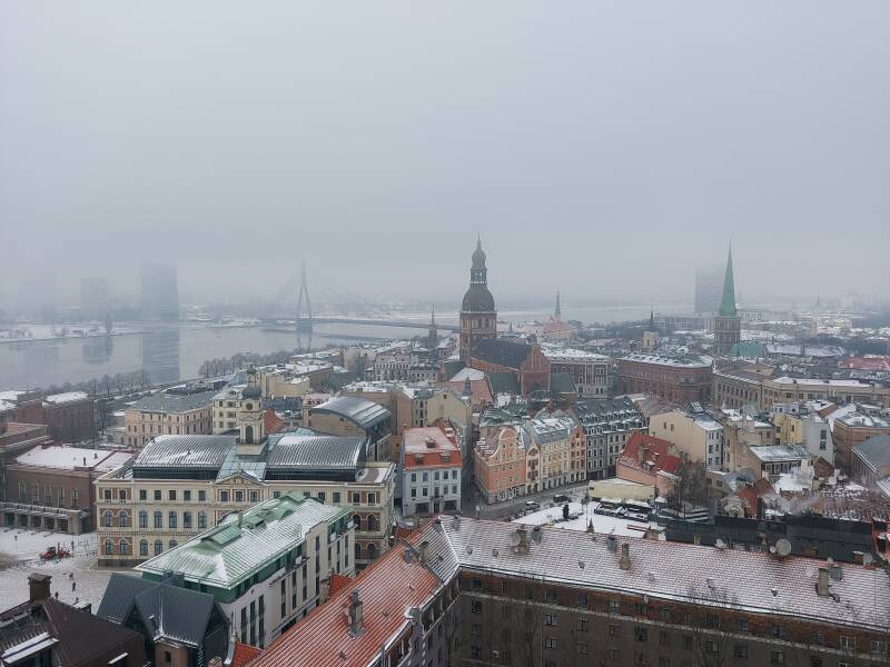 De laatste ochtend in Riga, nog even rondzwerven door de stad. Om te beginnen wilden we het zicht op de stad vanaf de rivier nog wel bewonderen. Bruggen zat, dus al snel waren we halverwege richting de overkant. Wel een mooi uitzicht in die ochtendnevel, met ijsschotsen drijvend in de rivier. Vervolgens nog de toren van de Petrikerk op, met weer een heel ander uitzicht op de stad. Daarna werd het langzaamaan tijd om de bagage op te halen en richting het vliegveld te gaan. Al met al een heel leuke stedentrip, wij zouden het iedereen aanraden.