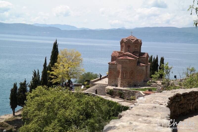 Ze waren ook zo slim om vlak naast het dorpje op palen een flinke steiger te bouwen, ideaal om een flink aantal toeristen te lokken. Ook voor ons stond er dus een bezoekje aan dit museum op het programma. Het hele dorpje op palen is te bezoeken, in de huisjes is ook te zien hoe de mensen destijds hebben geleefd. Vlak bij Plocha Michov Grad zijn ook nog de restanten van een oud Romeins fort te vinden. Hiervoor moet je wel even flink aan de wandel, want het fort was gesitueerd bovenop een heuvel. Vanaf deze heuvel hadden de Romeinen een goed uitzicht over het meer van Ohrid. Wij hebben uiteraard zelf ook nog even genoten van datzelfde uitzicht, uiteraard wel vele eeuwen later. Vervolgens snel weer naar beneden, want de boot wacht niet op mensen die niet op tijd terug zijn. De boot zette al snel weer verder koers in zuidelijke richting. Al snel kwam Trpejca in zicht. Geen stop in deze plaats, de boot vervolgde de zuidelijke route om uiteindelijk te stoppen in Saint Naum (ook wel Sveti Naum genoemd). Dit tiende eeuwse klooster ligt ongeveer 30 kilometer ten zuiden van Ohrid, zo ongeveer op de grens met Albanië. Bij dit klooster zouden we een paar uur doorbrengen, inclusief een lunchmoment.