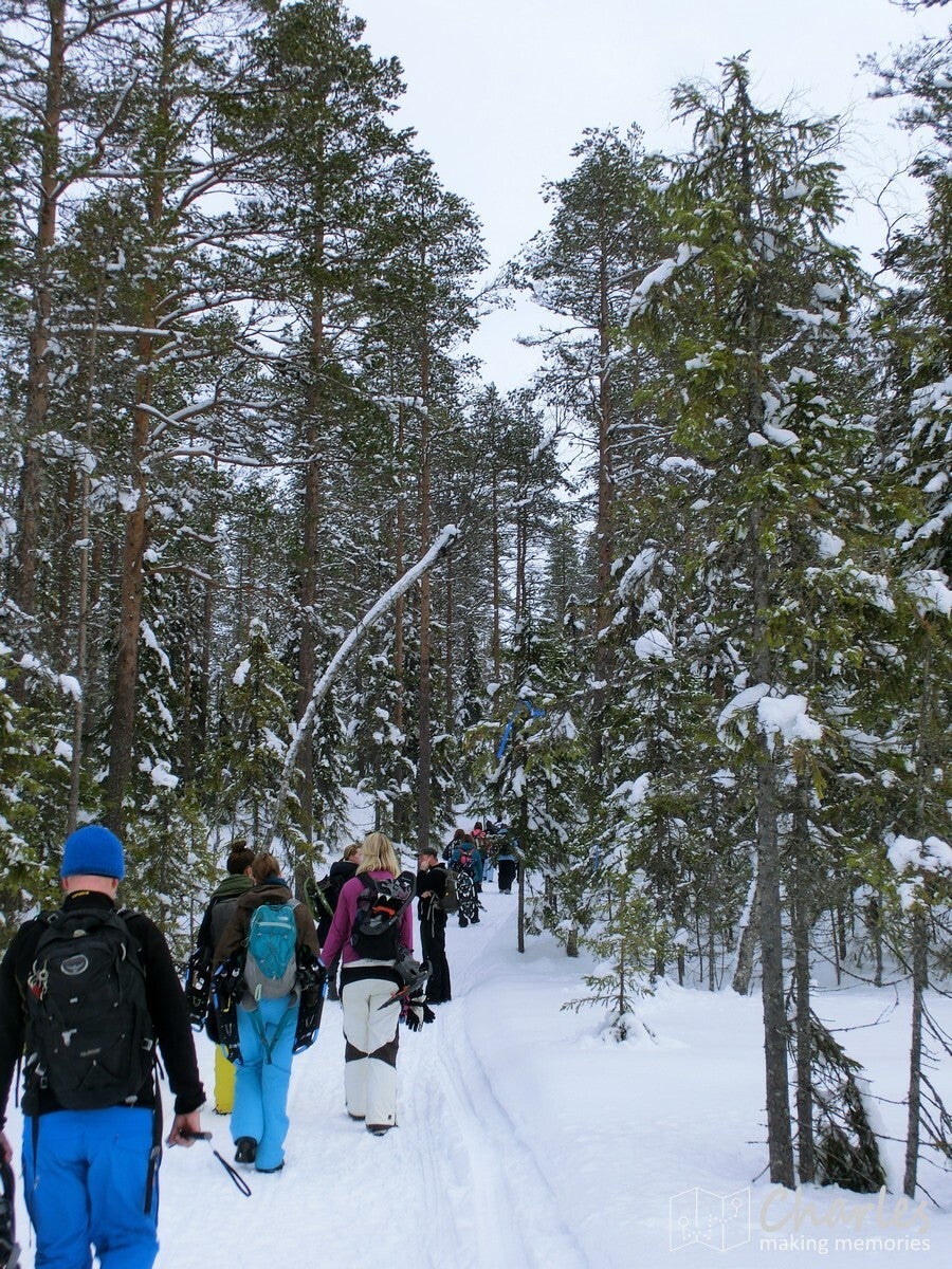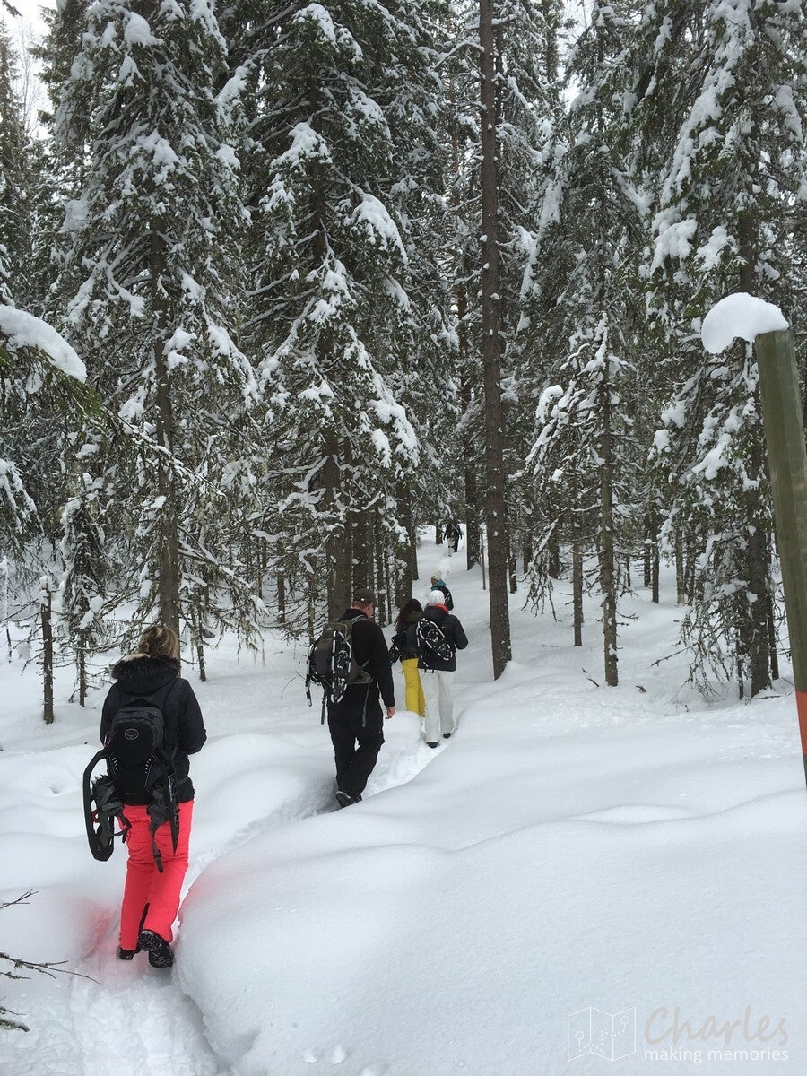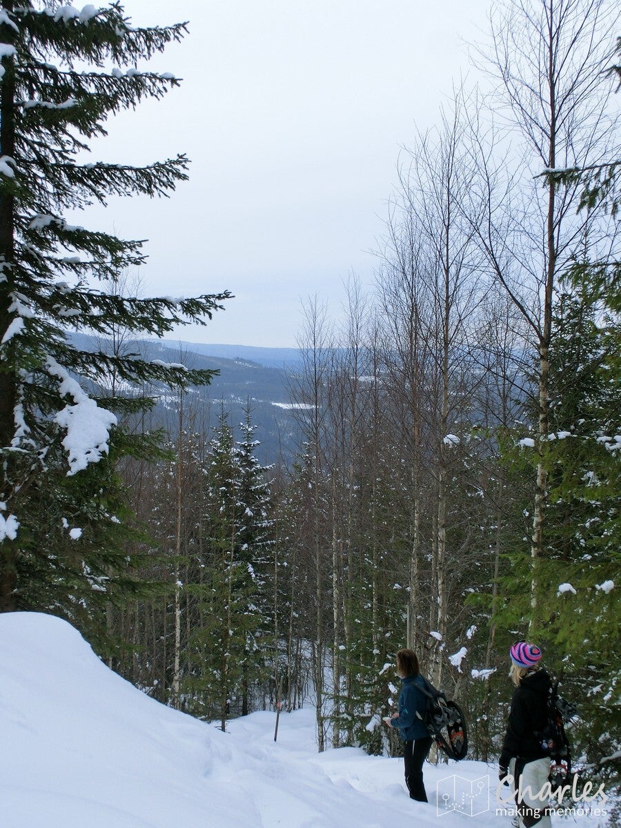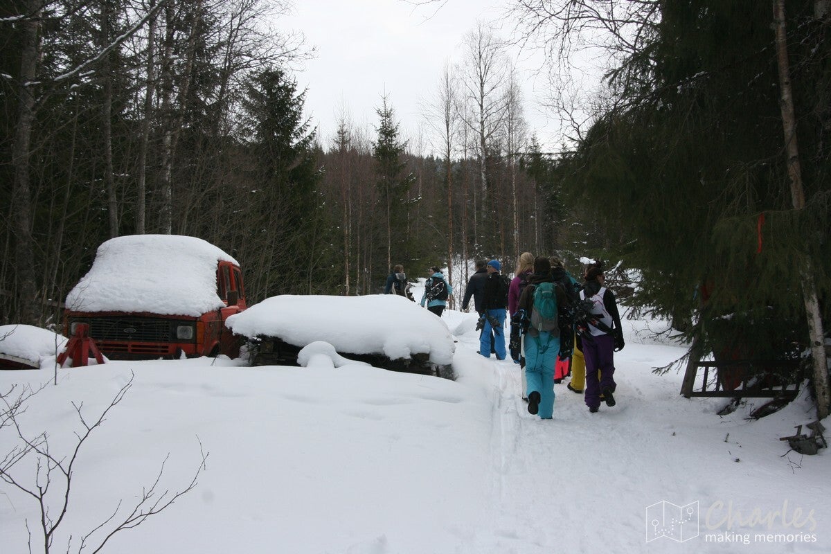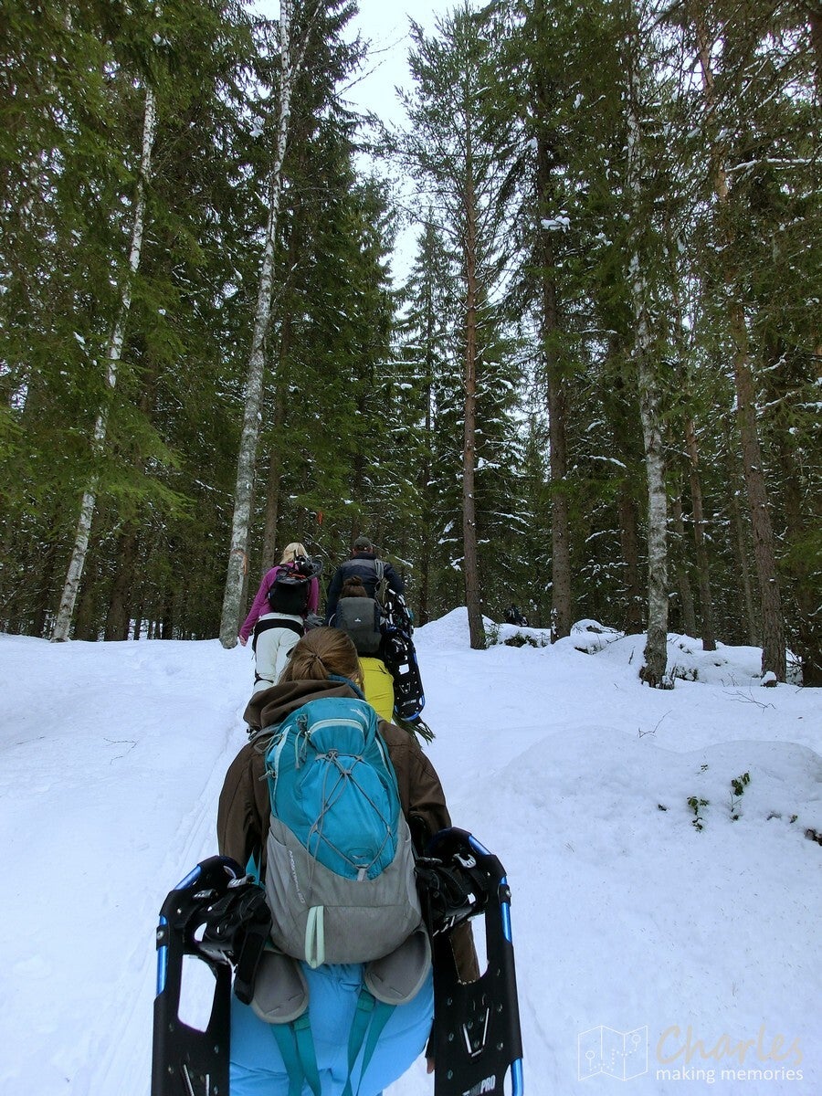 De wandeling startte vanaf het landhuis, geen transfer met de busjes dus. En het was ook niet echt nodig, want vanaf hier liep je zo de beboste heuvels in. Even de weg oversteken en we begonnen aan een klim. De sneeuwrackets waren hier nog niet nodig, want het ging hier om een smalle weg die nog wel regelmatig bereden werd. De eerste twee kilometer kwamen we ook nog her en der wel een huisje tegen. Op één plek vielen de ingesneeuwde autowrakken op, het naastgelegen huis zag er ook niet veel beter uit. Daarna was het vooral natuur. De wegen werden smalle paden, de sneeuw werd ook wat dieper. Uiteraard was dat ook het sein om elkaar regelmatig met sneeuwballen te bekogelen, sneeuwengelen te maken en af en toe aan een besneeuwde tak te schudden. Pure sneeuwpret dus.