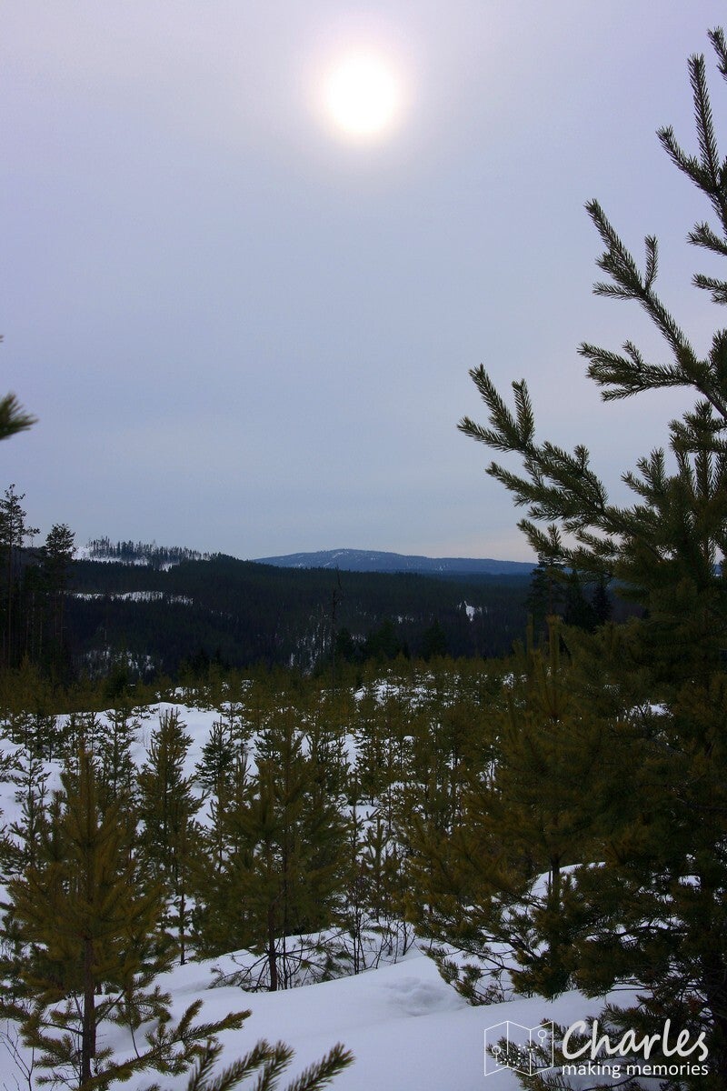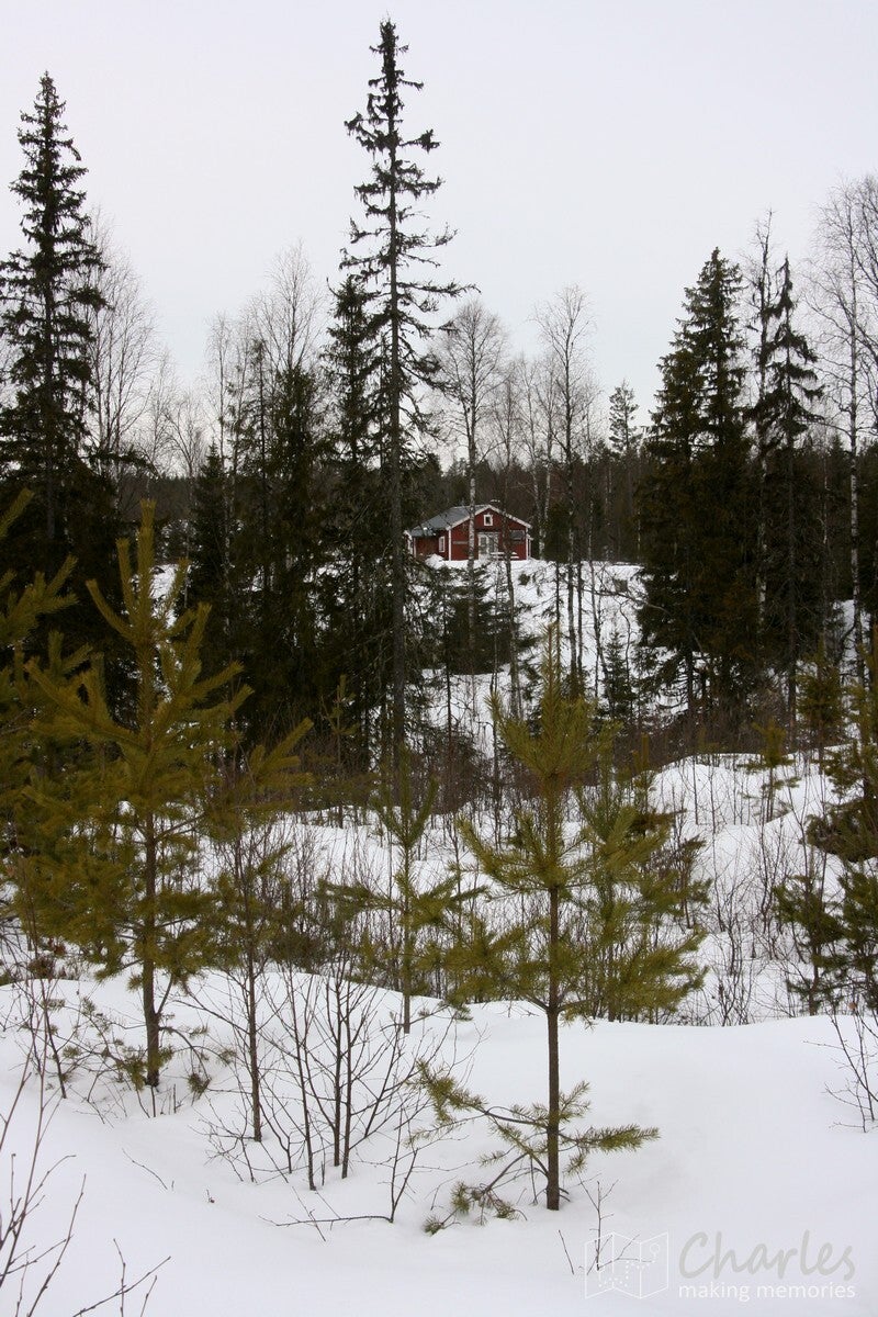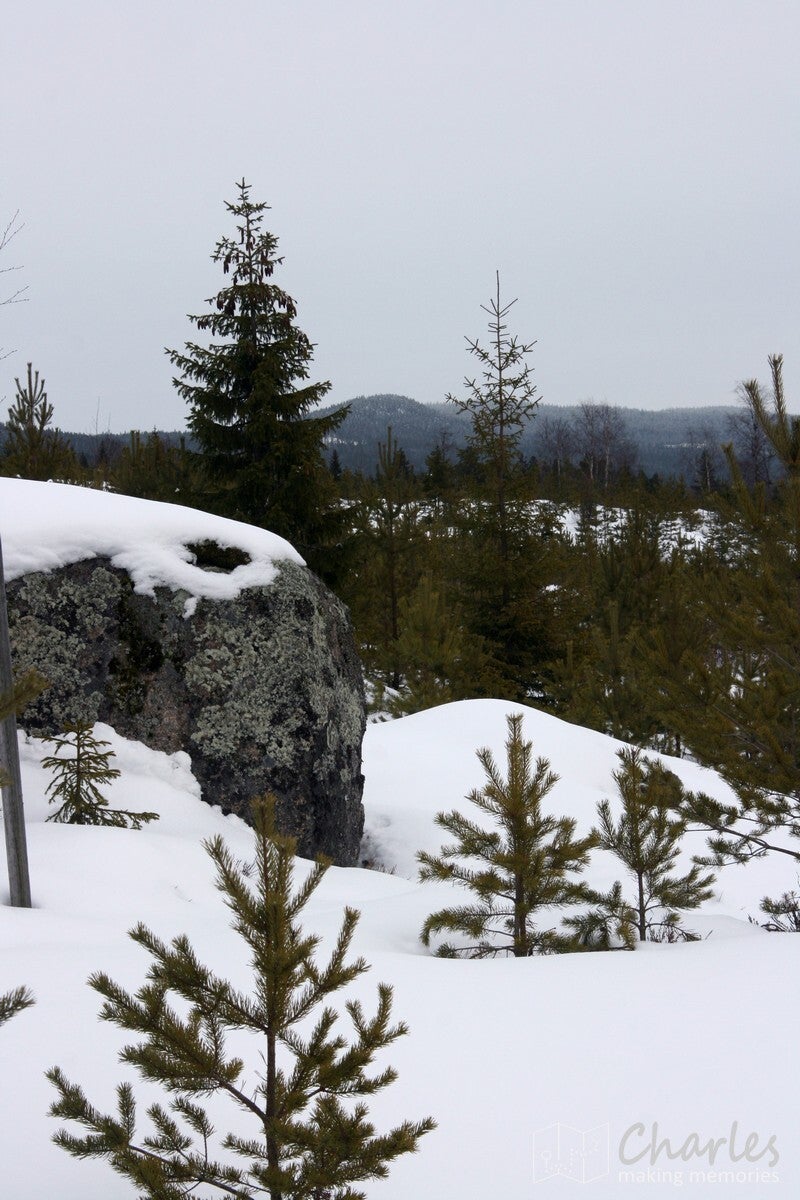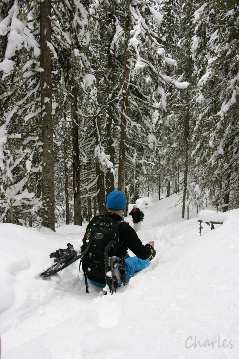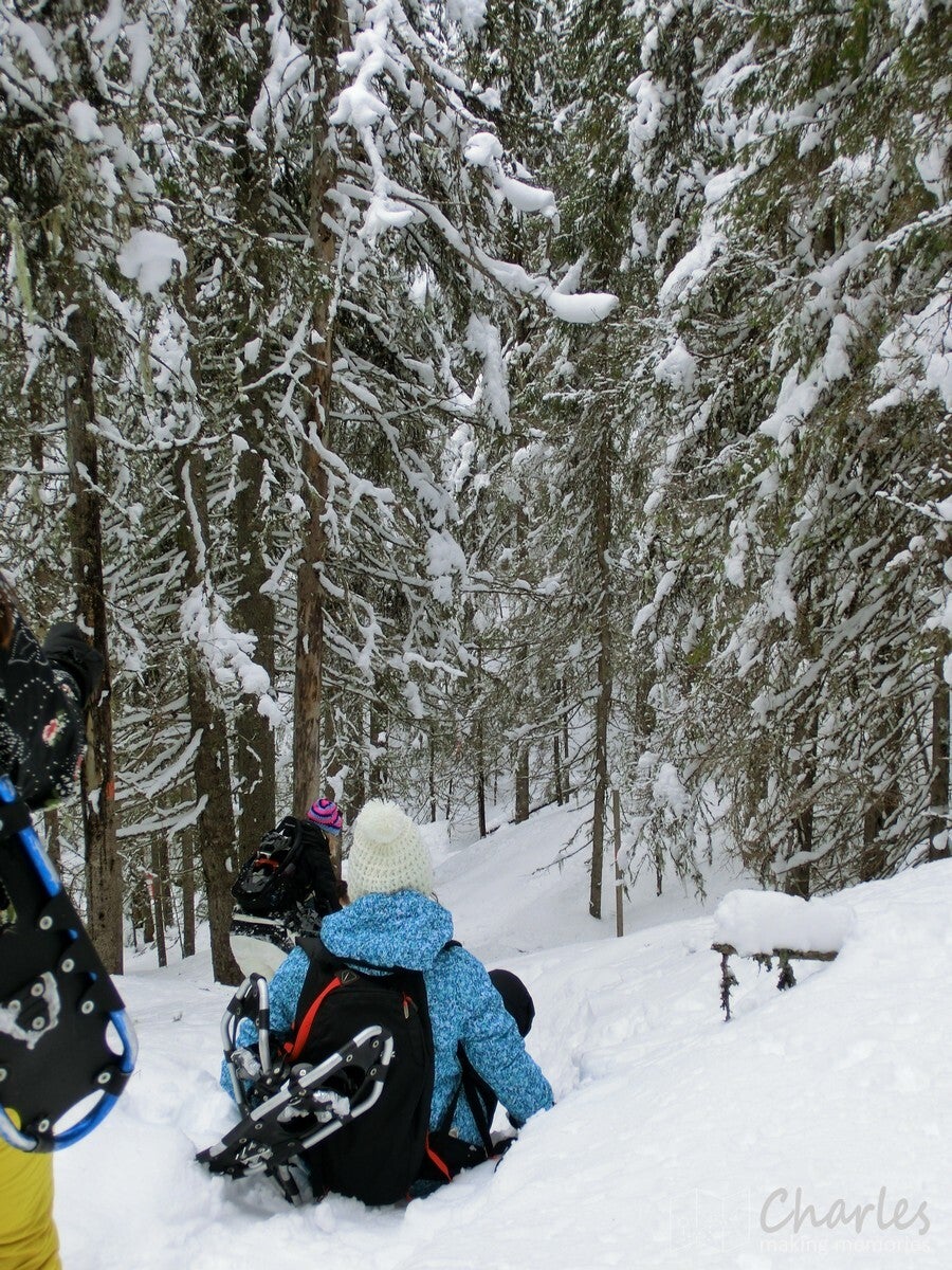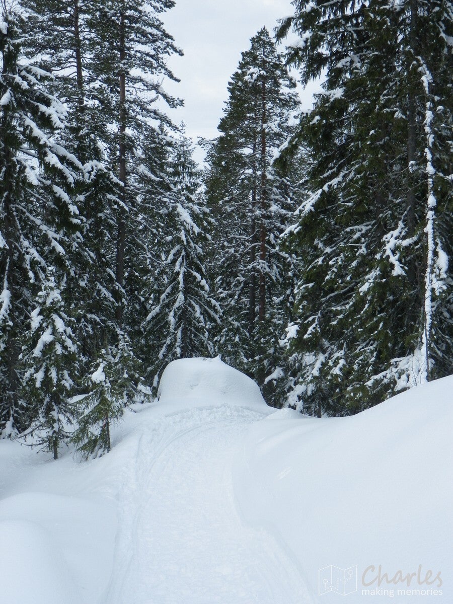 De wandeling startte vanaf het landhuis, geen transfer met de busjes dus. En het was ook niet echt nodig, want vanaf hier liep je zo de beboste heuvels in. Even de weg oversteken en we begonnen aan een klim. De sneeuwrackets waren hier nog niet nodig, want het ging hier om een smalle weg die nog wel regelmatig bereden werd. De eerste twee kilometer kwamen we ook nog her en der wel een huisje tegen. Op één plek vielen de ingesneeuwde autowrakken op, het naastgelegen huis zag er ook niet veel beter uit. Daarna was het vooral natuur. De wegen werden smalle paden, de sneeuw werd ook wat dieper. Uiteraard was dat ook het sein om elkaar regelmatig met sneeuwballen te bekogelen, sneeuwengelen te maken en af en toe aan een besneeuwde tak te schudden. Pure sneeuwpret dus.