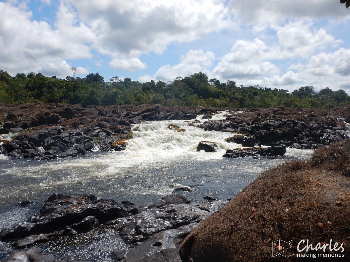 Na het ontbijt gingen we weer de korjaal in om na een minuut of tien varen te worden afgezet bij een stroomversnelling. De boot kon niet verder, dus van daar werd het wandelen naar de Raleighvallen (Moedervallen), de grootste watervallen in het gebied. Het bleek nog een flinke wandeling over moeilijk terrein: veel omgevallen bomen en pittig steile stukken. Het kostte dan ook een uur om bij de watervallen te komen, in de hitte werd het nog best zwaar. Maar het uitzicht op de watervallen was het zeker waard. De watervallen hadden relatief weinig water, maar daardoor zag je wel mooi het rotslandschap. Na een lekker lange stop in de schaduw van een mooie boom gingen we weer op pad terug naar de boot. Onderweg naar het kamp stopte de korjaal nog bij een drooggevallen zandbank. Van daaruit kon iedereen nog even verkoeling zoeken in de rivier. Zwemmen bij de watervallen zat er niet in vanwege de aanwezigheid van flinke sidderalen.