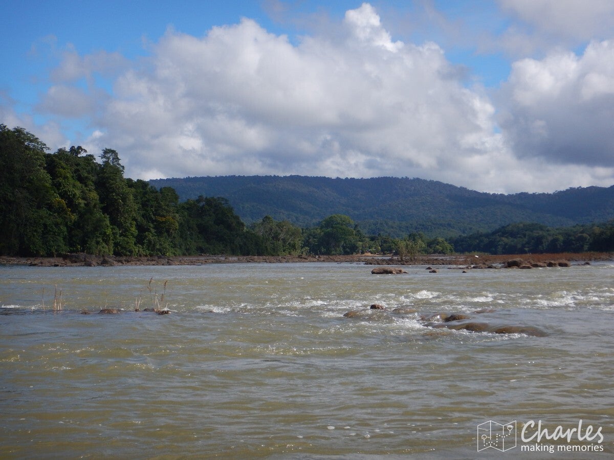 Met de korjaal gingen we weer terug naar Witagron, de omgekeerde route van drie dagen eerder. Gelukkig hadden we minder bagage (het eten en drinken was inmiddels goed op), dus hadden we ook minder diepgang met de korjaal. Dat was ook wel nodig, want het heeft tijdens ons verblijf nauwelijks geregend. De waterstand leek dus nog wel lager dan eerst. Gelukkig hoefden we niet de boot uit om te duwen, de bootsman en loodser konden het prima af. Een mindere, maar ook wel grappige, verrassing kregen we halverwege de tocht. We hadden de hele ochtend al Hollandse luchten met mooie stapelwolken. Eentje recht voor ons vonden we al een beetje donker. In de verte zagen we ineens de regen neerklateren op het water, maar voordat we goed en wel konden reageren zaten we al midden in een hoosbui. Werkelijk binnen een minuut waren we al drijfnat, wat kan het daar hard regenen (en wat is het regenwater koud ). Gelukkig was de zon ook snel weer terug, zodat we konden opwarmen en opdrogen. De toch ging verder voorspoedig en na aankomst stond het busje al klaar.